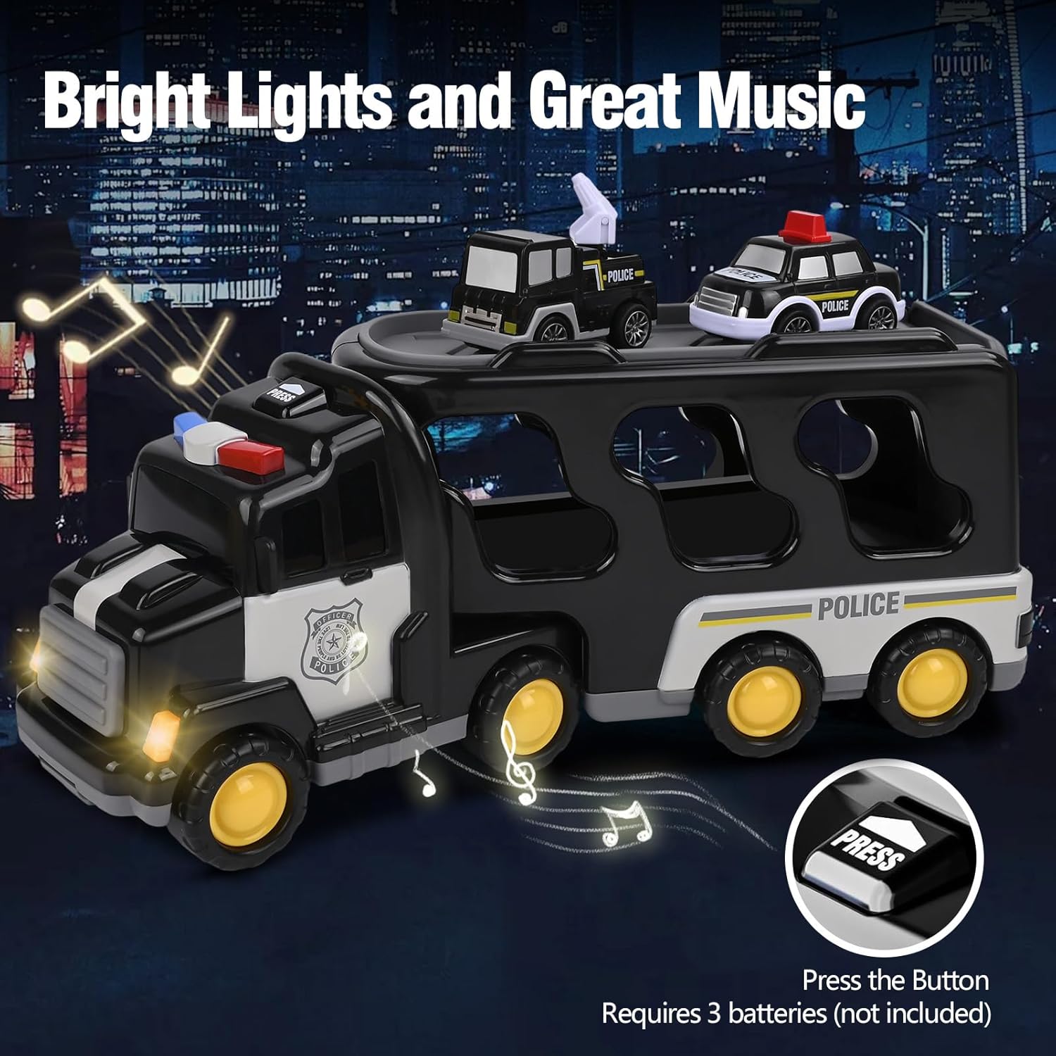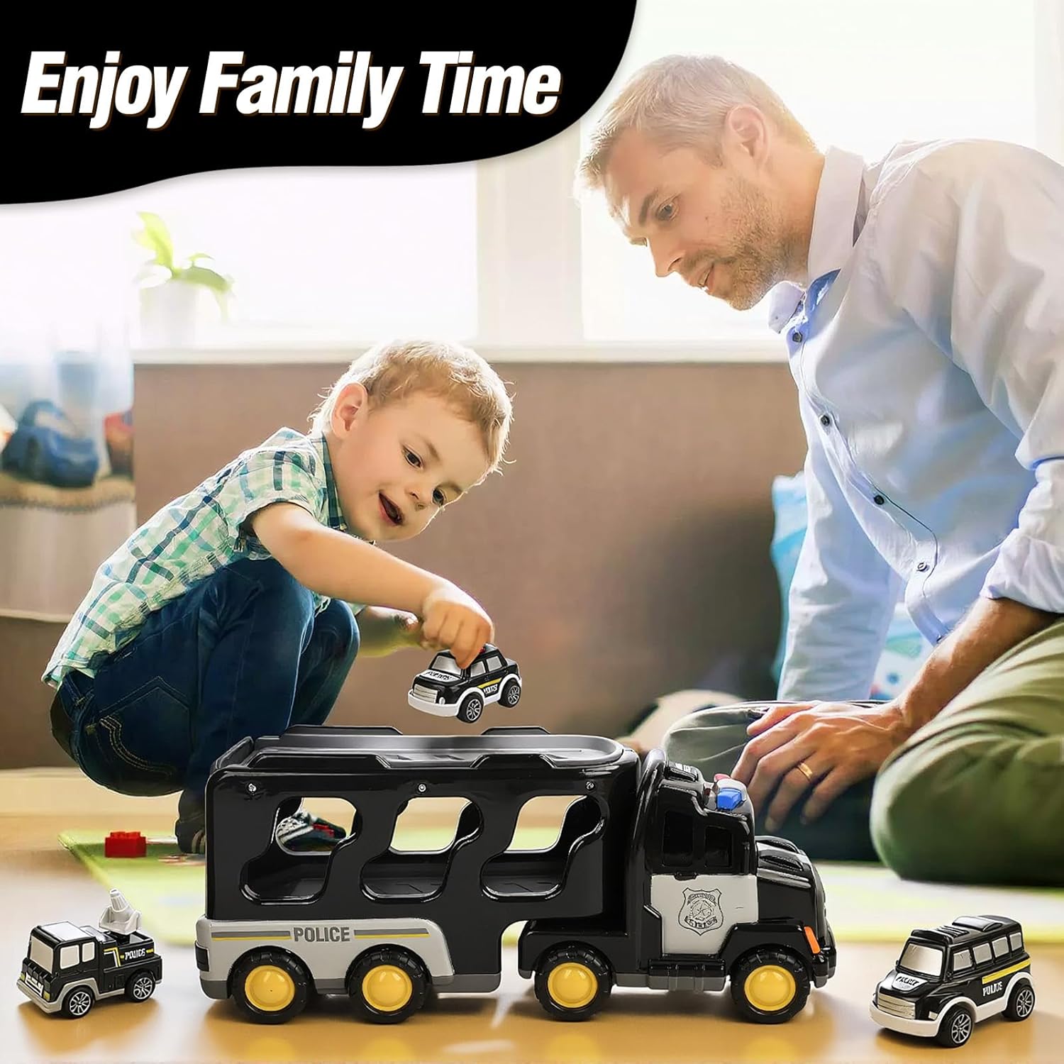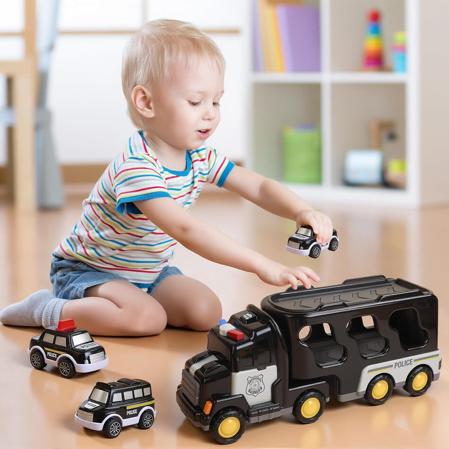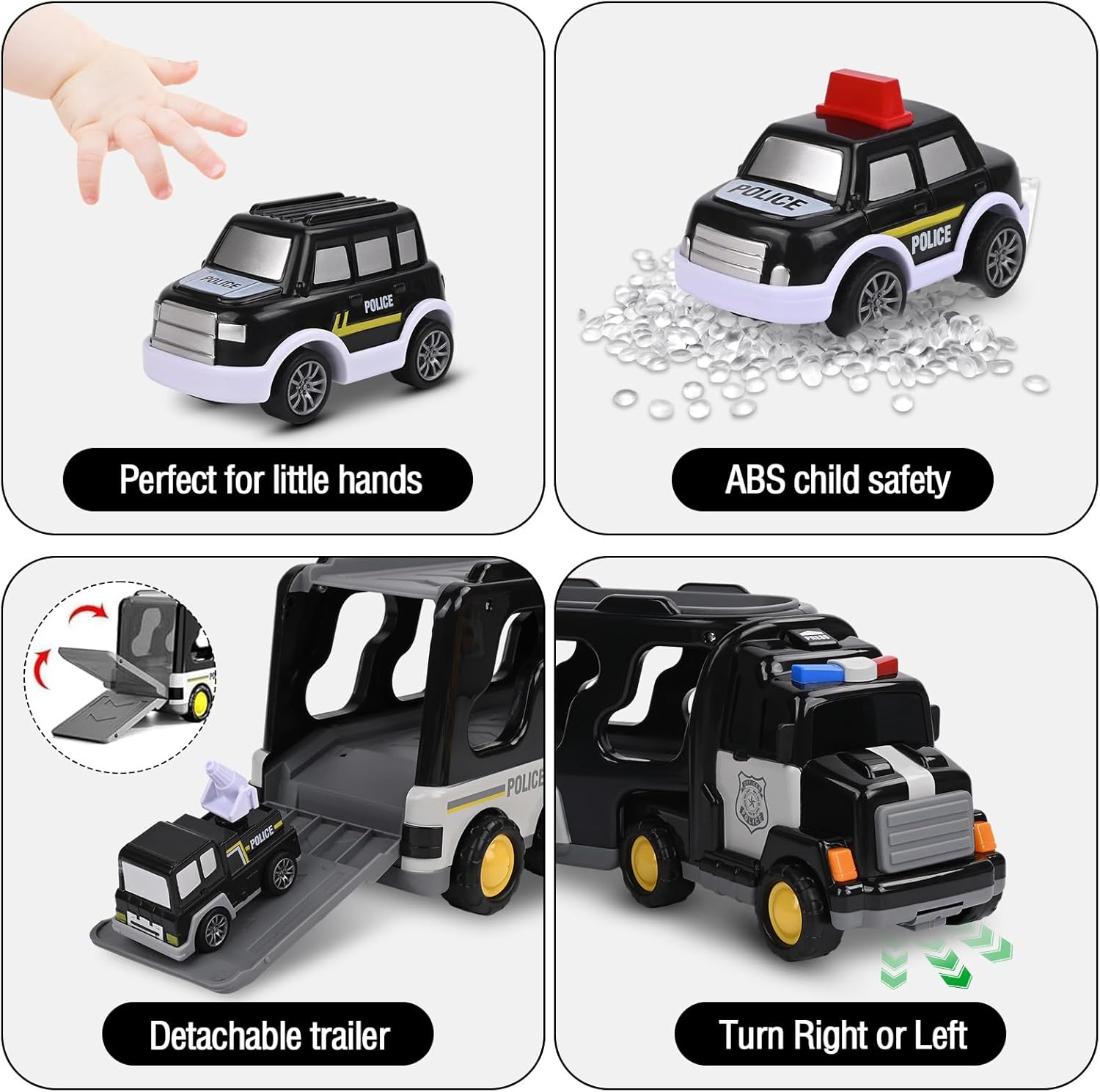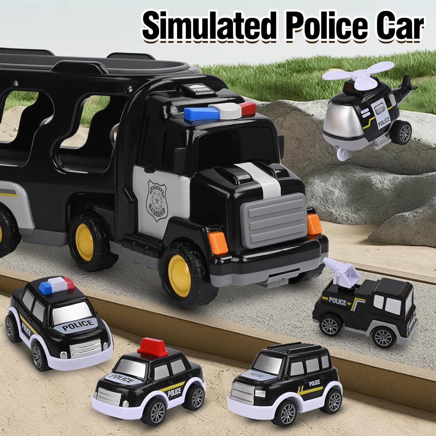🚛【GIOCATTOLO CAMION DELLA POLIZIA 7-IN-1】: Questo giocattolo della polizia è composto da un grande camion trasportatore e sei veicoli più piccoli come elicottero, autopompa e diverse auto della polizia. I bambini possono ricreare emozionanti missioni di soccorso - un giocattolo ideale per bambini e bambine dai 3 ai 6 anni. 🚛【LUCI E SUONI】: Premendo il pulsante sulla cabina di guida si attivano luci colorate e suoni realistici di missione. In questo modo la macchina della polizia diventa incredibilmente realistica! Il suono si interrompe automaticamente dopo circa 8 secondi per evitare rumori continui. 🚛【FACILE DA USARE】: Basta spingere più volte in avanti il camion giocattolo e rilasciarlo - subito si muoverà da solo trasportando i sei mini-veicoli. La cabina è girevole, il rimorchio è staccabile e il piano di carico si apre per scaricare le piccole auto della polizia. 🚛【GIOCATTOLO SICURO PER BAMBINI】: Realizzato in materiale ABS di alta qualità, liscio, facile da impugnare e sicuro per i bambini. Il giocattolo della polizia è adatto a bambini dai 2 anni in su e li accompagnerà per tutta l'infanzia. 🎁【REGALO IDEALE PER BAMBINI】: Questo versatile giocattolo della polizia invita a missioni di salvataggio creative e sviluppa le capacità motorie. Confezionato perfettamente come regalo di compleanno, regalo di Natale o per una festa di giocattoli - un punto di riferimento per ogni bambino!