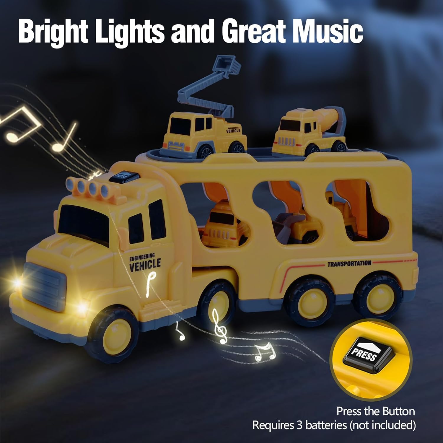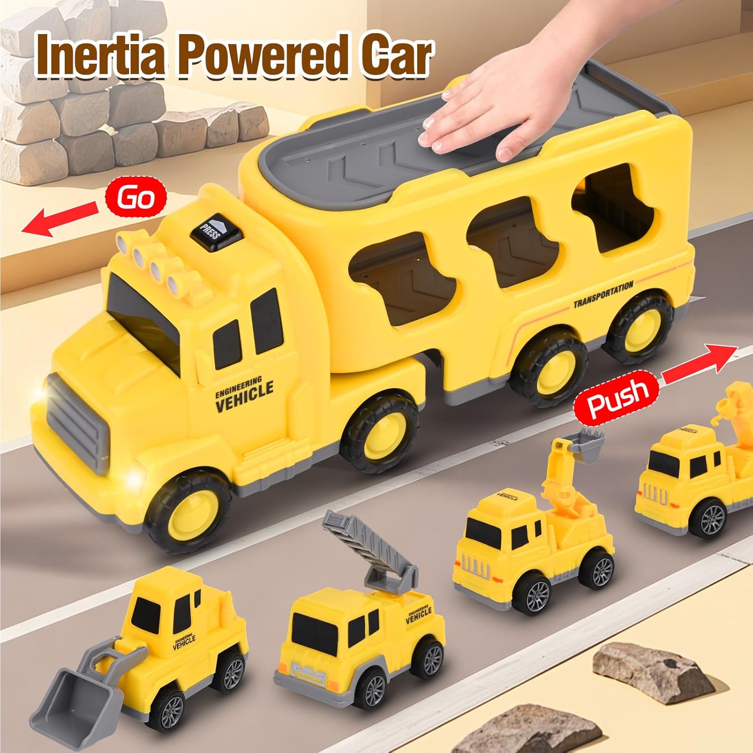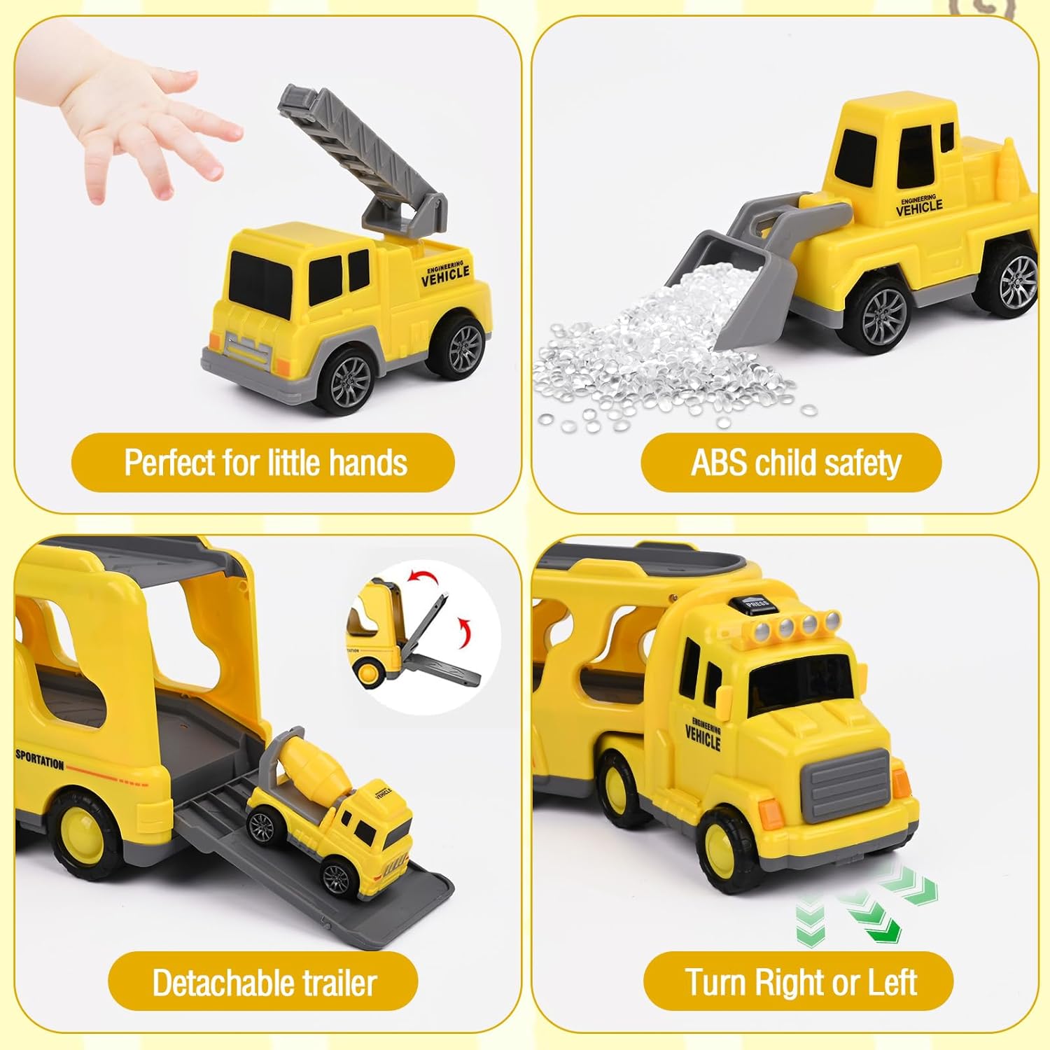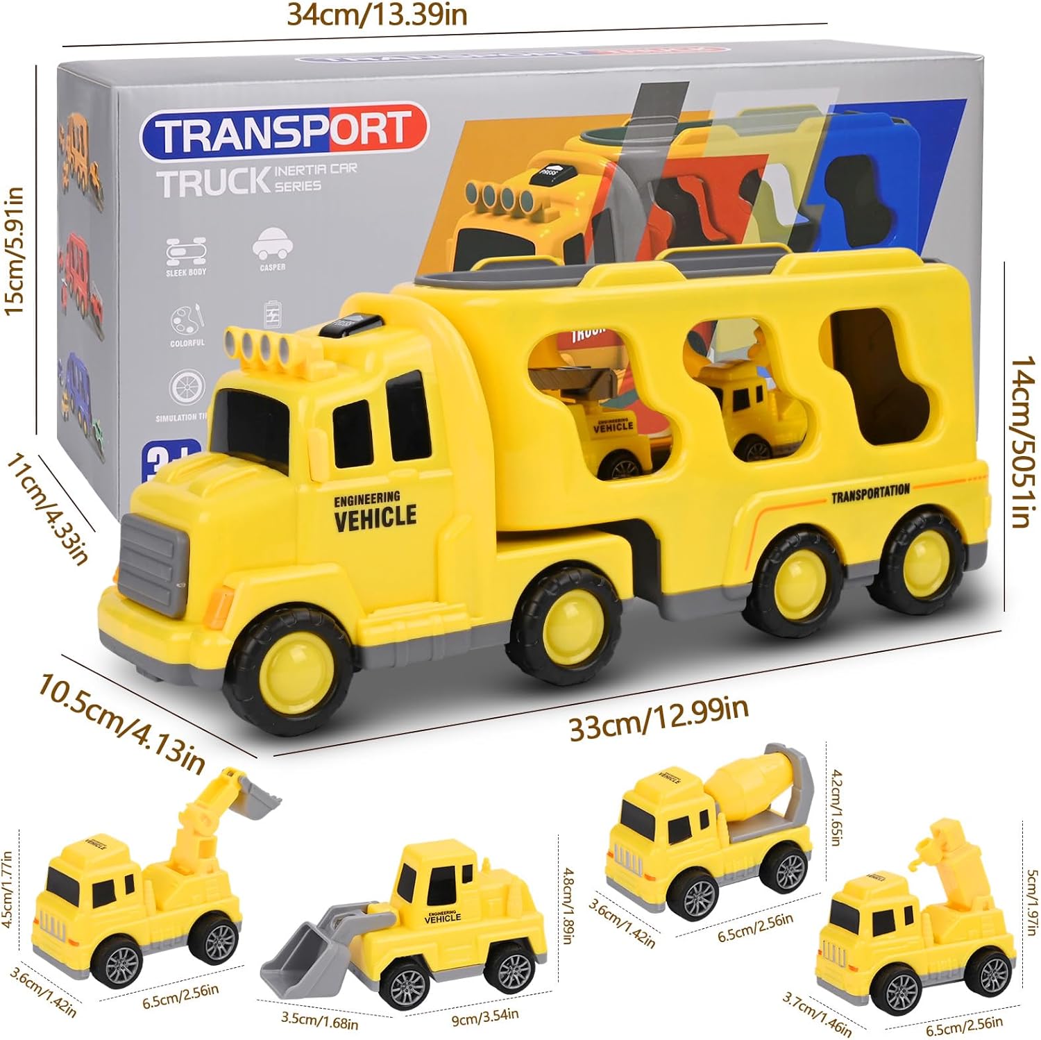 🚛【CAMION GIOCATTOLO 7 IN 1 PER BAMBINI】: Il camion giocattolo è composto da un veicolo trasportatore principale e 6 veicoli più piccoli (rullo compressore, autocarro con scala, autobotte, elicottero, auto e fuoristrada). I bambini possono ricreare emozionanti missioni di soccorso. Adatto a maschi e femmine di età compresa tra 3 e 6 anni. 🚛【LUCI E SUONI】: Premendo il pulsante sulla cabina di guida, si accendono luci colorate e si attivano suoni realistici, che affascineranno particolarmente i bambini. Il suono si interrompe automaticamente dopo circa 8 secondi, evitando rumori continui. 🚛【FACILE DA USARE】: Basta spingere il grande camion giocattolo in avanti più volte e rilasciarlo: inizierà a muoversi da solo, trasportando i sei veicoli più piccoli. La cabina del veicolo trasportatore può ruotare. Una volta arrivati a destinazione, la cabina può essere separata dal rimorchio e il piano di carico può essere aperto per scaricare i veicoli più piccoli. I mini-veicoli si muovono da soli dopo essere stati tirati all'indietro. 🚛【GIOCATTOLO SICURO PER BAMBINI】: Realizzato in materiale ABS di alta qualità, con superfici lisce e facili da impugnare. Il giocattolo è sicuro per bambini dai 2 anni in su ed è perfetto per le manine dei più piccoli. Accompagnerà i bambini durante tutta la loro infanzia. 🎁【REGALO IDEALE PER BAMBINI】: I colorati veicoli invitano a vivere avventure di trasporto fantasiose, stimolando la coordinazione occhio-mano. Confezionato in una scatola regalo accattivante, è il regalo di compleanno perfetto per bambini e bambine dai 3 anni in su. Adatto anche come regalo di Natale o per una festa con giocattoli.