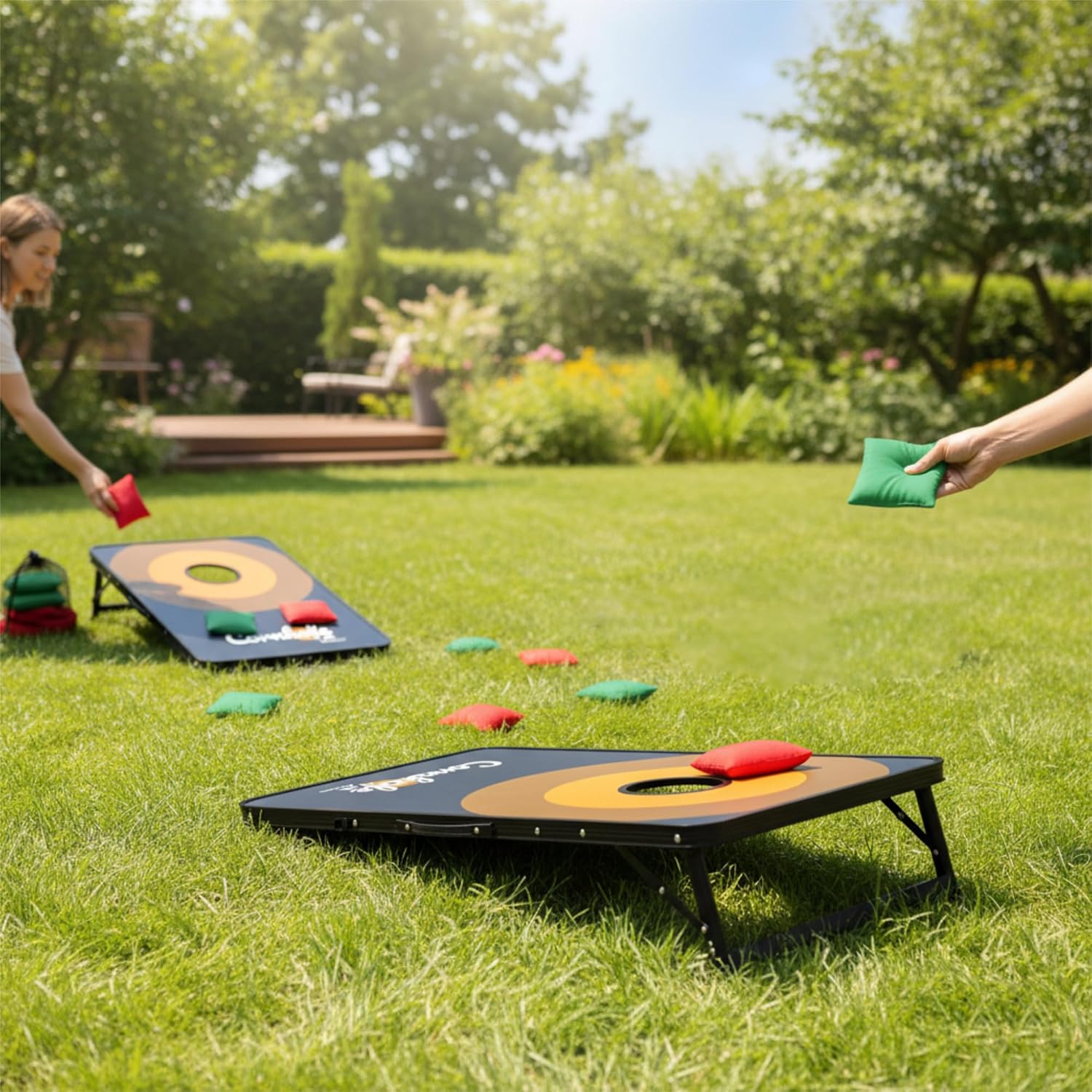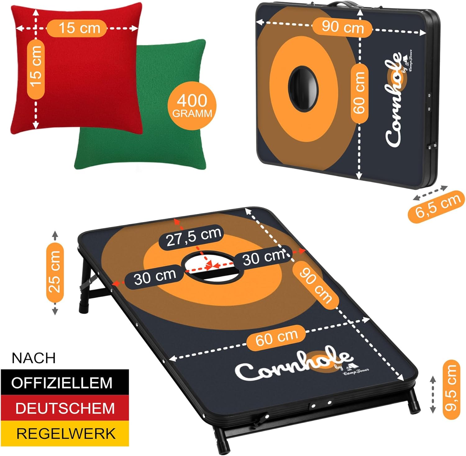 Versatile: il set CampFeuer Cornhole garantisce divertimento ed eccitazione per tutte le età e per qualsiasi numero di giocatori. In giardino, in campeggio, a feste e feste o in spiaggia, invita amici e parenti a un divertente gioco di abilità. Contenuto della confezione: nel set sono inclusi due tavole Cornhole di alta qualità, otto sacchetti in due colori e un pratico sacchetto per riporre i sacchetti. Inoltre riceverete una guida multilingue con le regole del gioco ufficiali e le varianti di gioco creative. Gioca come i professionisti: gli utensili da gioco soddisfano le specifiche ufficiali della Federazione tedesca Cornhole (DECOV). Le tavole da lancio Cornhole hanno una dimensione di 90 x 60 cm, mentre i sacchi sono grandi 15 x 15 cm e con un peso di circa 400 g – per un'esperienza di gioco autentica come i professionisti! Struttura stabile: le tavole da lancio sono realizzate in robusto MDF e sono dotate di gambe pieghevoli, che garantiscono una posizione sicura e una struttura semplice, ideale per l'uso in interni ed esterni. Portatile e facile da pulire | Le tavole sono facili da assemblare e sono comode da trasportare grazie alle maniglie integrate, così sono pronte all'uso ovunque in modo rapido e flessibile. Per una lunga durata, le tavole devono essere conservate in un luogo asciutto e protette dall'umidità.