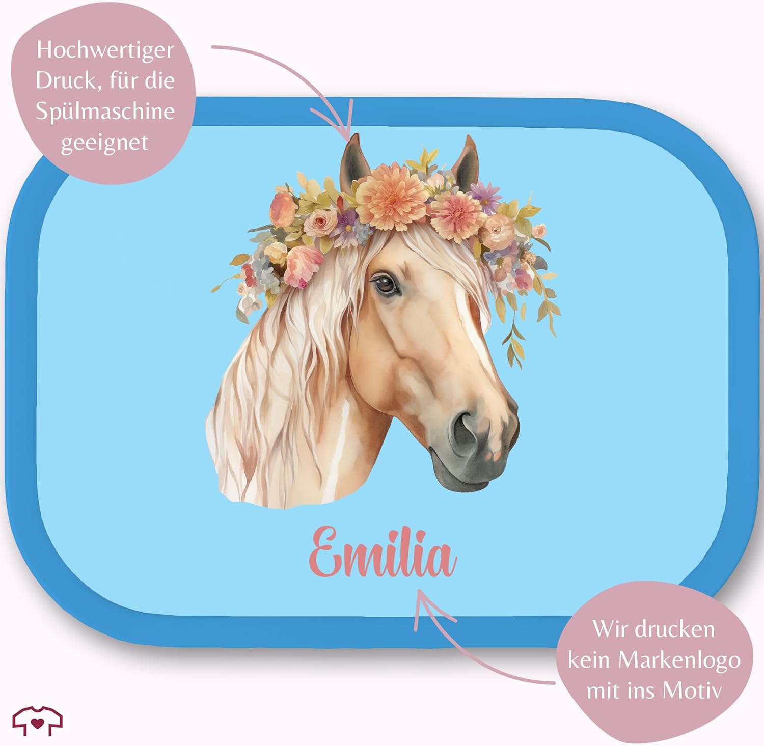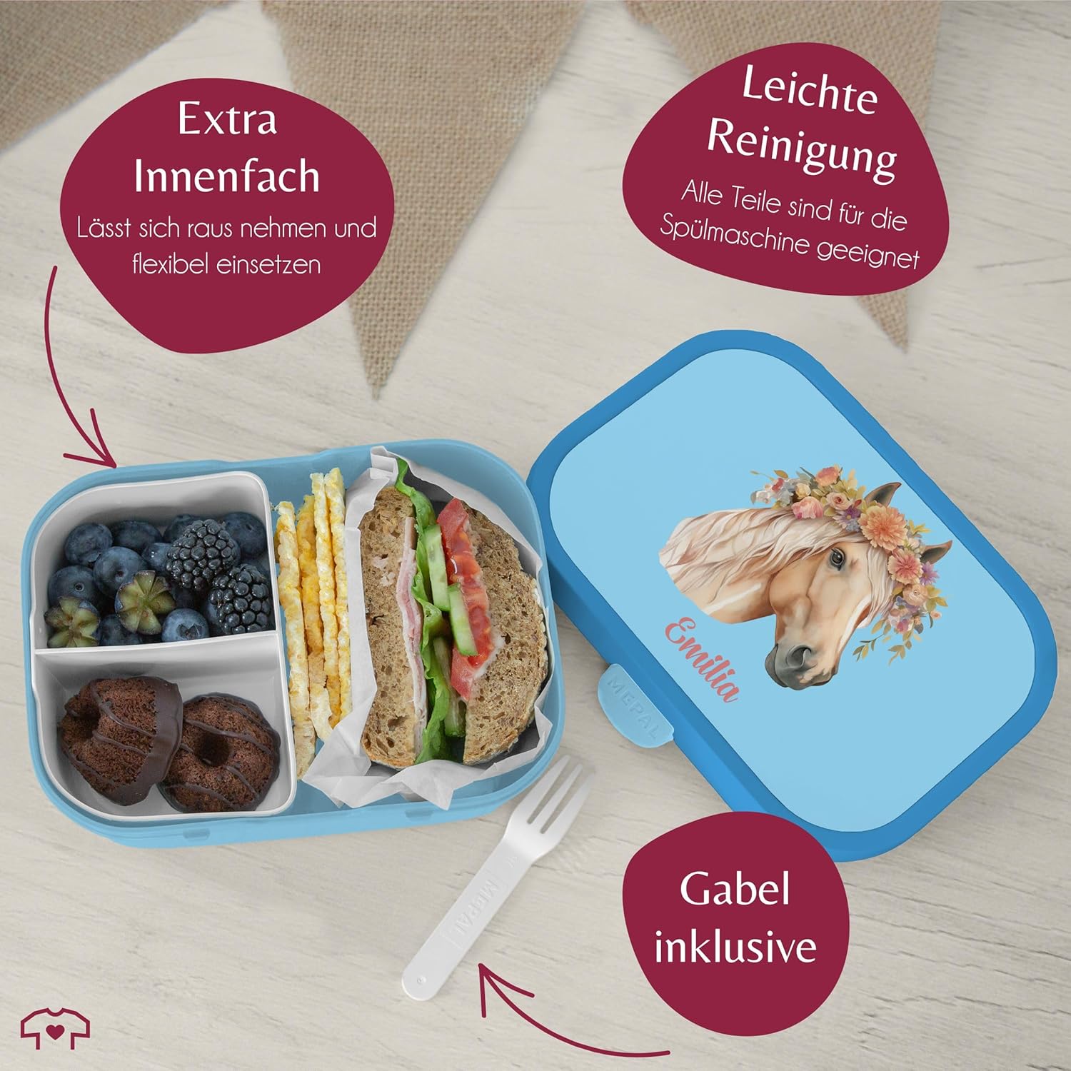 Ideale per ogni occasione: vuoi regalare un regalo davvero speciale questa volta? Oppure stai cercando “cavalli per bambini vesperbox con nomi”? Sorprendi il tuo piccolo con il regalo giusto per questo giorno e rendilo felice con il nostro design. Regalo per gli appassionati di cavalli o gli amanti dei cavalli: stai cercando una "scatola vespro con nomi di cavalli" come idea regalo per i bambini? Allora hai centrato l'obiettivo con questo simpatico motivo! La combinazione tra testa di cavallo e nome desiderato è qualcosa di molto speciale e rende il cavallo perfetto. Con questo motivo attirerai sicuramente l'attenzione e ti farai sorridere. Motivo con testo a scelta: i regali personalizzati sono particolarmente apprezzati sul tema dell'amore per i cavalli. Sul tema dell'amore per i cavalli potete adattare questo fantastico design con testa di cavallo e nome desiderato esattamente ai vostri desideri. Rendi davvero felici i tuoi piccoli con questo bellissimo motivo personalizzato! Inserto Bento: questo bellissimo contenitore per il pranzo per bambini consente di separare il cibo grazie all'inserto Bento rimovibile e può quindi essere utilizzato in diversi modi. Che si tratti del classico pranzo o della frutta fresca e secca per la scuola, grazie agli scomparti tutto rimane fresco e appetitoso. Forchetta snack: il contenitore per il pranzo ti invita a gustare un'ampia varietà di cibi con la piccola forchetta snack. Il contenitore per snack non è adatto al microonde. Per riscaldare il cibo è quindi necessario toglierlo dal contenitore del pranzo