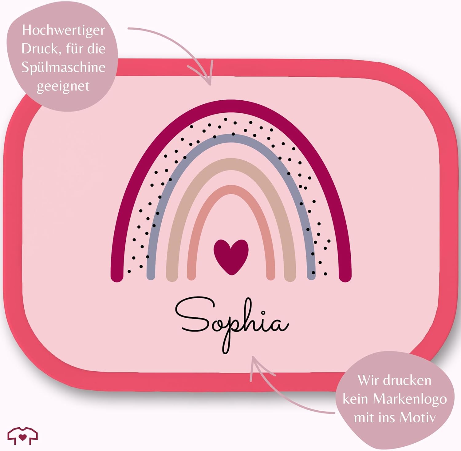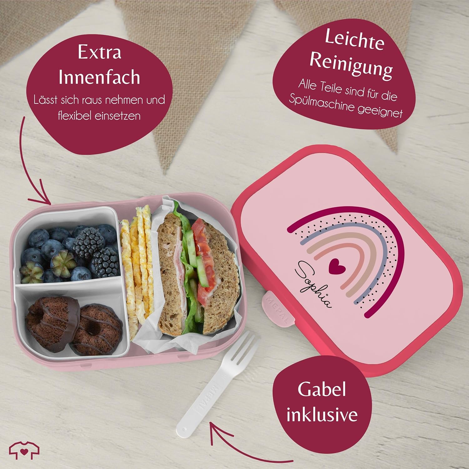 MOTIVO ARCOBALENO: bellissima stampa con arcobaleno e nome desiderato per i bambini. Inserto Bento: questo bellissimo contenitore per il pranzo per bambini consente di separare il cibo grazie all'inserto Bento rimovibile e può quindi essere utilizzato in vari modi. Che si tratti del classico pranzo o della frutta fresca e secca per la scuola, grazie agli scomparti tutto rimane fresco e appetitoso. Forchetta snack: il contenitore per il pranzo ti invita a gustare un'ampia varietà di cibi con la piccola forchetta snack. Il contenitore per snack non è adatto al microonde. Per riscaldare il cibo è quindi necessario toglierlo dal contenitore del pranzo. Lavabile in lavastoviglie: la pulizia del contenitore per il pranzo dei bambini può essere effettuata facilmente in lavastoviglie dopo l'uso. Sia il contenitore per il pranzo, l'inserto bento che la forchetta sono lavabili in lavastoviglie e quindi facili e igienici da pulire. Il materiale del contenitore per il pranzo è privo di BPA e adatto agli alimenti, quindi non dovrai preoccuparti delle sostanze chimiche nocive. Leggero: con un peso di soli 250 grammi, il contenitore per il pranzo stampato può essere facilmente portato ovunque. Con una dimensione di 132 mm di larghezza, 178 mm di lunghezza e 61 mm di altezza, il contenitore per il pranzo è compatto e perfetto per la borsa della scuola o lo zaino. Con una stampa divertente, il contenitore per il pranzo è perfetto per l'inizio della scuola e per ogni altra pausa pranzo
