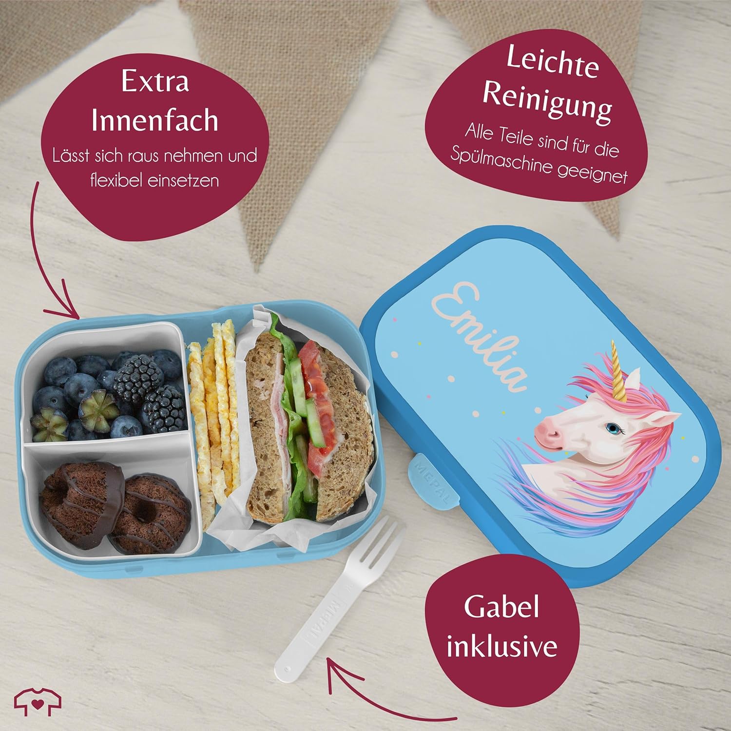 ✔️ REGALO UNICORNO: con questo simpatico motivo regalerai sicuramente una grande gioia a ogni fan degli unicorni. Inserto Bento: questo bellissimo contenitore per il pranzo per bambini consente di separare il cibo grazie all'inserto Bento rimovibile e può quindi essere utilizzato in vari modi. Che si tratti del classico pranzo o della frutta fresca e secca per la scuola, grazie agli scomparti tutto rimane fresco e appetitoso. Forchetta snack: il contenitore per il pranzo ti invita a gustare un'ampia varietà di cibi con la piccola forchetta snack. Il contenitore per snack non è adatto al microonde. Per riscaldare il cibo è quindi necessario toglierlo dal contenitore del pranzo. Lavabile in lavastoviglie: la pulizia del contenitore per il pranzo dei bambini può essere effettuata facilmente in lavastoviglie dopo l'uso. Sia il contenitore per il pranzo, l'inserto bento che la forchetta sono lavabili in lavastoviglie e quindi facili e igienici da pulire. Il materiale del contenitore per il pranzo è privo di BPA e adatto agli alimenti, quindi non dovrai preoccuparti delle sostanze chimiche nocive. Leggero: con un peso di soli 250 grammi, il contenitore per il pranzo stampato può essere facilmente portato ovunque. Con una dimensione di 132 mm di larghezza, 178 mm di lunghezza e 61 mm di altezza, il contenitore per il pranzo è compatto e perfetto per la borsa della scuola o lo zaino. Con una stampa divertente, il contenitore per il pranzo è perfetto per l'inizio della scuola e per ogni altra pausa pranzo