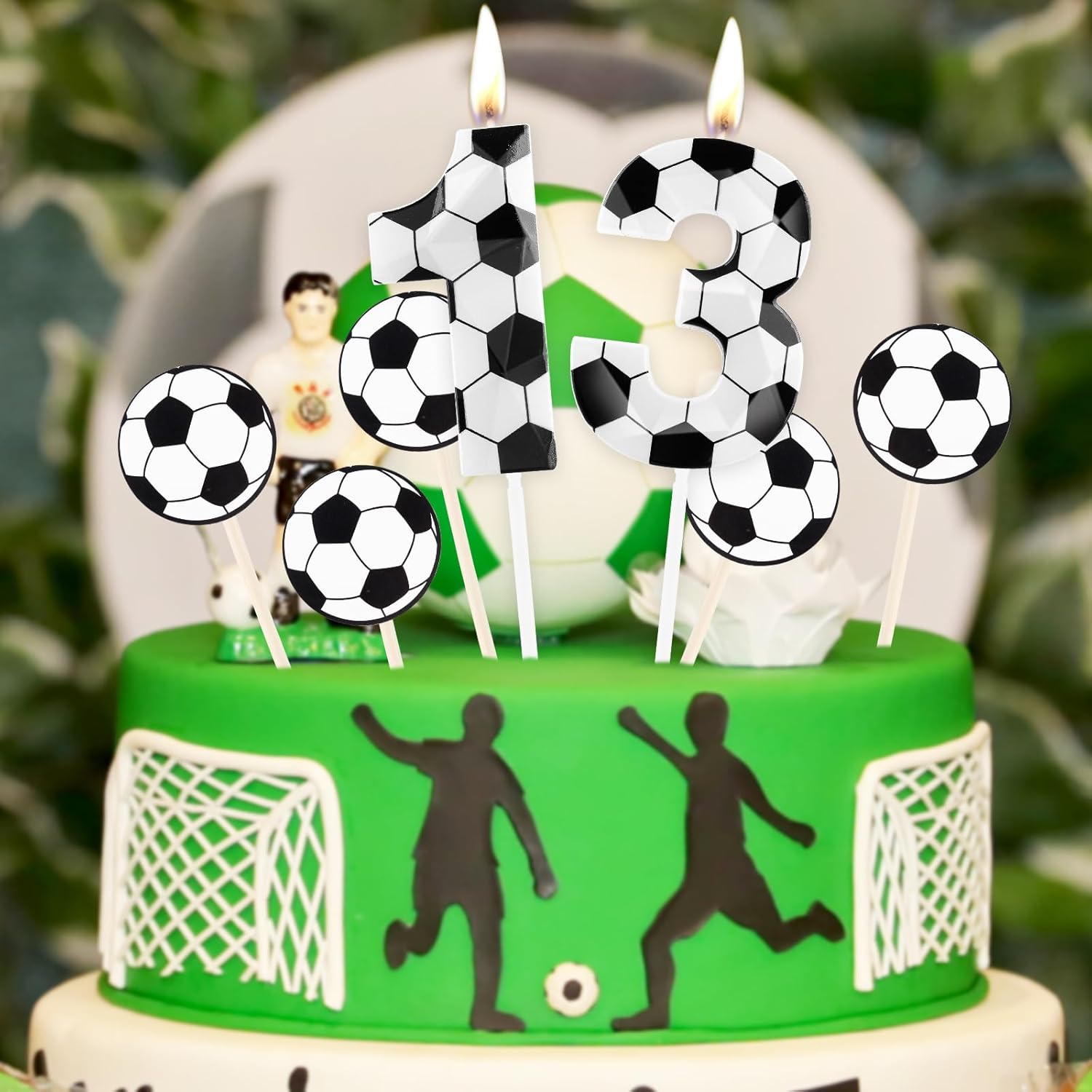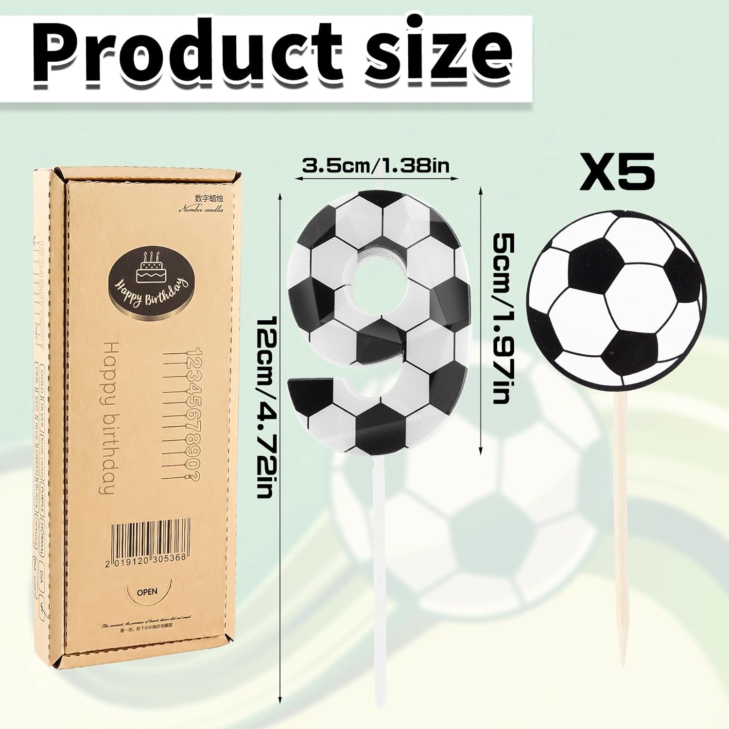 Contenuto della confezione: 1 candela 3D con numero 11 a forma di calcio, 5 decorazioni per torte in cartoncino da calcio. L'aspetto squisito e bello può soddisfare le esigenze della tua festa di compleanno. Le candele digitali 3D dal design accattivante sono piene di senso stereoscopico, rendendo la tua festa di compleanno unica e impressionante. Candele sicure: realizzate in cera inodore di alta qualità, la nostra candela da calcio brucia in modo pulito senza fumo nero o odori sgradevoli, garantendo un'esperienza sicura e piacevole per te e la tua famiglia. Confezione squisita: ogni candela digitale per torta è confezionata in una confezione separata, che è più protettiva e può efficacemente impedire che le candele vengano schiacciate, assicurando che arrivino intatte e facili da riporre, soddisfacendo le esigenze della tua festa di compleanno. Dimensioni della candela di compleanno: l'altezza della candela di compleanno con numeri di calcio 3D misura circa 6 cm, l'altezza totale (incluso il plettro) è di circa 12 cm, larghezza: 3,5 cm, spessore: 0,7 cm. Dimensioni perfette, ideale per la maggior parte delle torte di compleanno e torte nuziali, decorazioni per cupcake per una festa di compleanno memorabile e significativa Molteplici occasioni: le candele numeriche possono essere utilizzate per compleanni, temi sportivi per giocatori, battezzare bambini, anniversari di matrimonio, compleanno per animali domestici, Natale, feste di pensionamento e matrimoni. Crea squisiti numeri di candele 3D a tema calcio per rendere le tue decorazioni per torte ancora più belle.
