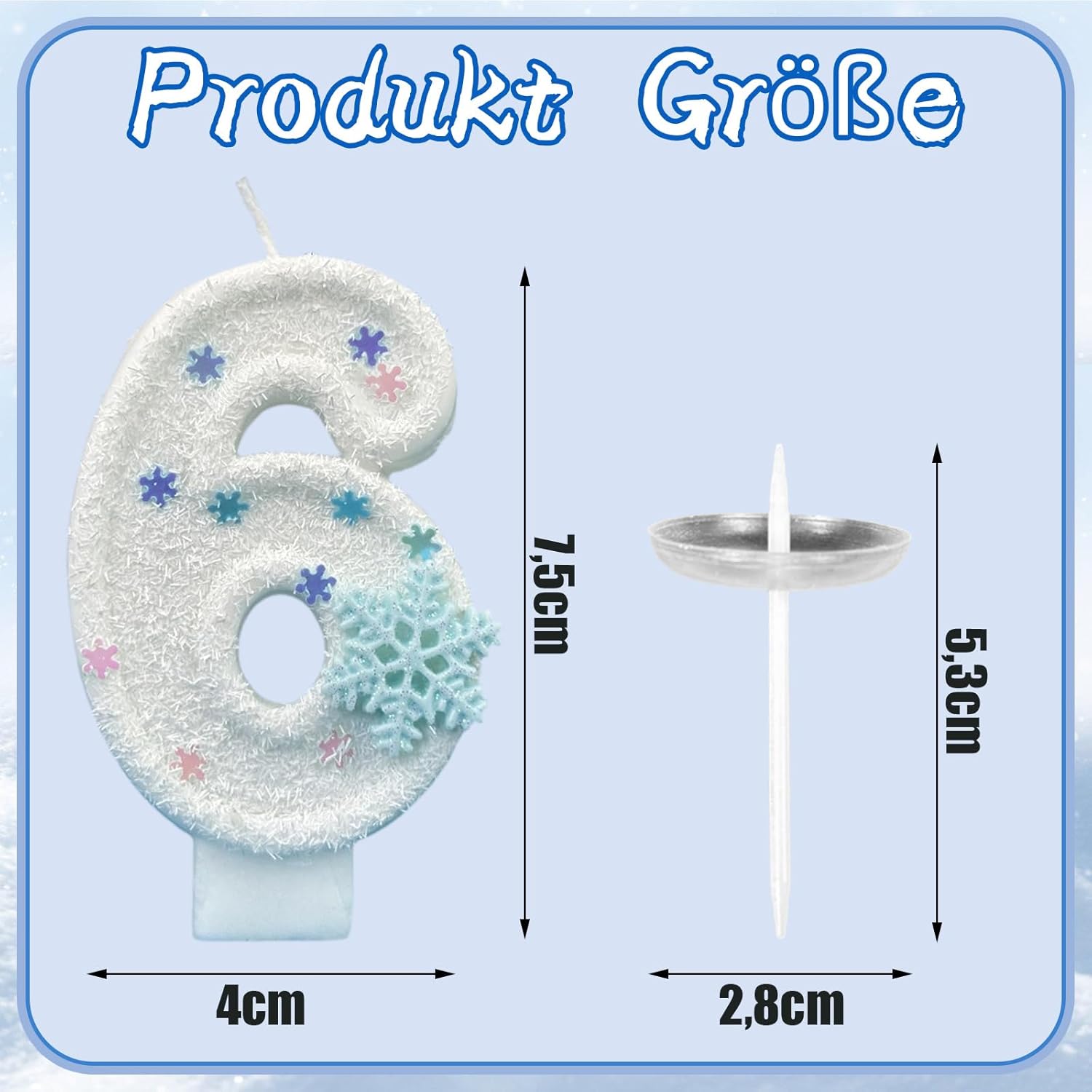 Candela unica con numeri 6 per feste di compleanno: la nostra candela Ovanda 6° compleanno è la candela di compleanno perfetta per i bambini. Con il suo accattivante design 3D e i dettagli luccicanti dei fiocchi di neve, ogni celebrazione diventa un evento speciale. Ideale come candela di compleanno 6 per bambine per il 6° compleanno. Candela di compleanno glitterata e decorativa: la candela per 6° compleanno convince per la superficie bianca dei fiocchi di neve e i motivi colorati a stella e fiocchi di neve. Dona a qualsiasi torta un aspetto festoso e aggiunge un tocco scintillante sulla tavola del compleanno. Perfetta per il 6° compleanno di bambine: questa candela numerica è appositamente progettata per il 6° compleanno di bambine. È facile da mettere sulle torte di compleanno ed è una bella attrazione per feste di compleanno per bambini, sia all'interno che all'esterno. Candele di compleanno sicure e di alta qualità: le nostre candele di compleanno per bambini sono realizzate in materiale sicuro, sicuro per i bambini. Bruciano in modo uniforme e garantiscono un'atmosfera di compleanno sicura e allegra ad ogni festa. Versatile decorazione di compleanno: queste candele di compleanno possono essere utilizzate per diversi temi di compleanno, soprattutto per ghiaccio, neve o fiabe. Combinabili con altre candele di compleanno, per un'esperienza decorativa armoniosa e scintillante.