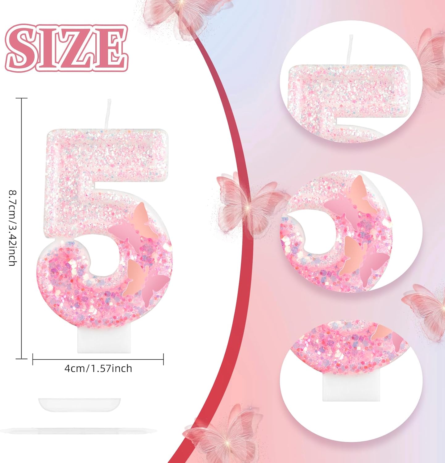 Le candele a farfalla includono: riceverai 1 candela numerica glitterata per torta e cupcake. Caratterizzato da una farfalla glitterata 3D, sembra molto carino e lucido. Inserirlo sulla torta è molto accattivante. Più adatto come articolo per feste a tema rosa per ragazze, dimensioni adeguate come candele per torta decorazione per la maggior parte dei cupcake di compleanno e torta nuziale. Informazioni sulla candela con numero rosa: candele numeriche Materiali di grado alimentare, atossico, inodore, ecologico, durevole, di lunga durata, riutilizzabile. La dimensione della candela di compleanno numerica è di circa 7 cm di lunghezza, 4 cm di larghezza totale (include il plettro per candele) è di circa 12,2 cm Decorazione per torta con candele a forma di farfalla, facile da inserire nella torta. Le candele con numero rosa e le decorazioni per torte possono essere utilizzate insieme o separatamente. Dopo aver usato la candela di compleanno, devi solo tagliare la parte superiore della candela. possono essere facilmente conservati e riutilizzati per il prossimo utilizzo. Ampia applicazione: fantastiche candele rosa a forma di farfalla, ideali per decorazioni di compleanno. Numero candele topper torta per qualsiasi età forniture per feste. Dimensioni adeguate come decorazione per torta per la maggior parte delle torte di compleanno e nuziali. I dettagli lucidi aggiungono ulteriore fascino alla torta di compleanno e creano immediatamente un'atmosfera festosa. Regalo perfetto per il 2° compleanno: set di decorazioni per torte con candele di compleanno personalizzate accompagnate da uno stile farfalla glitterata, ideali non solo per decorare torte e cupcake, ma anche giocattoli per bambini o decorazioni per la casa. È anche il regalo perfetto per feste o regali di compleanno per feste a tema farfalla.