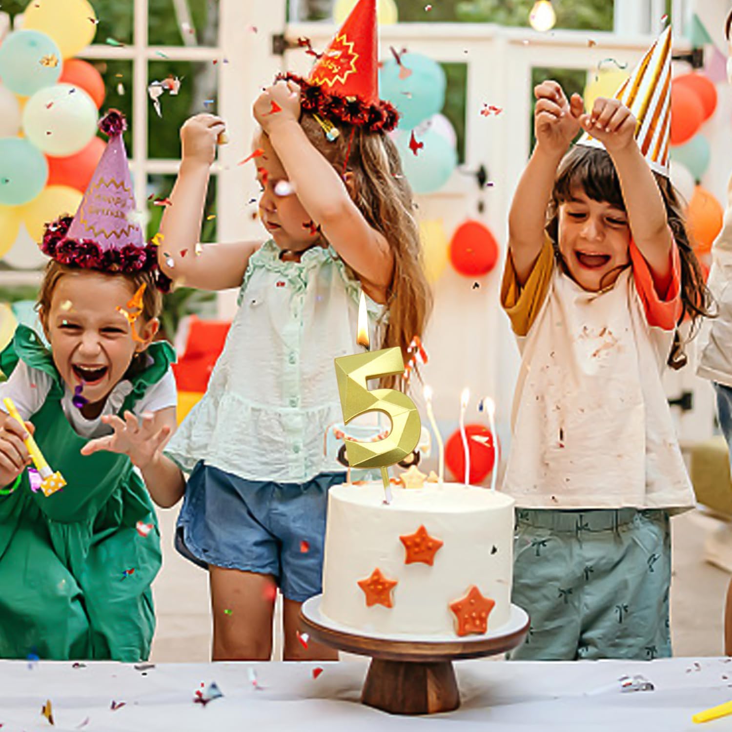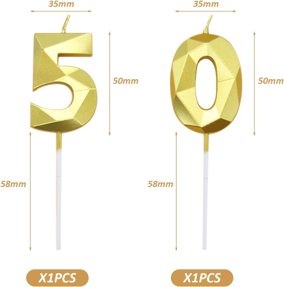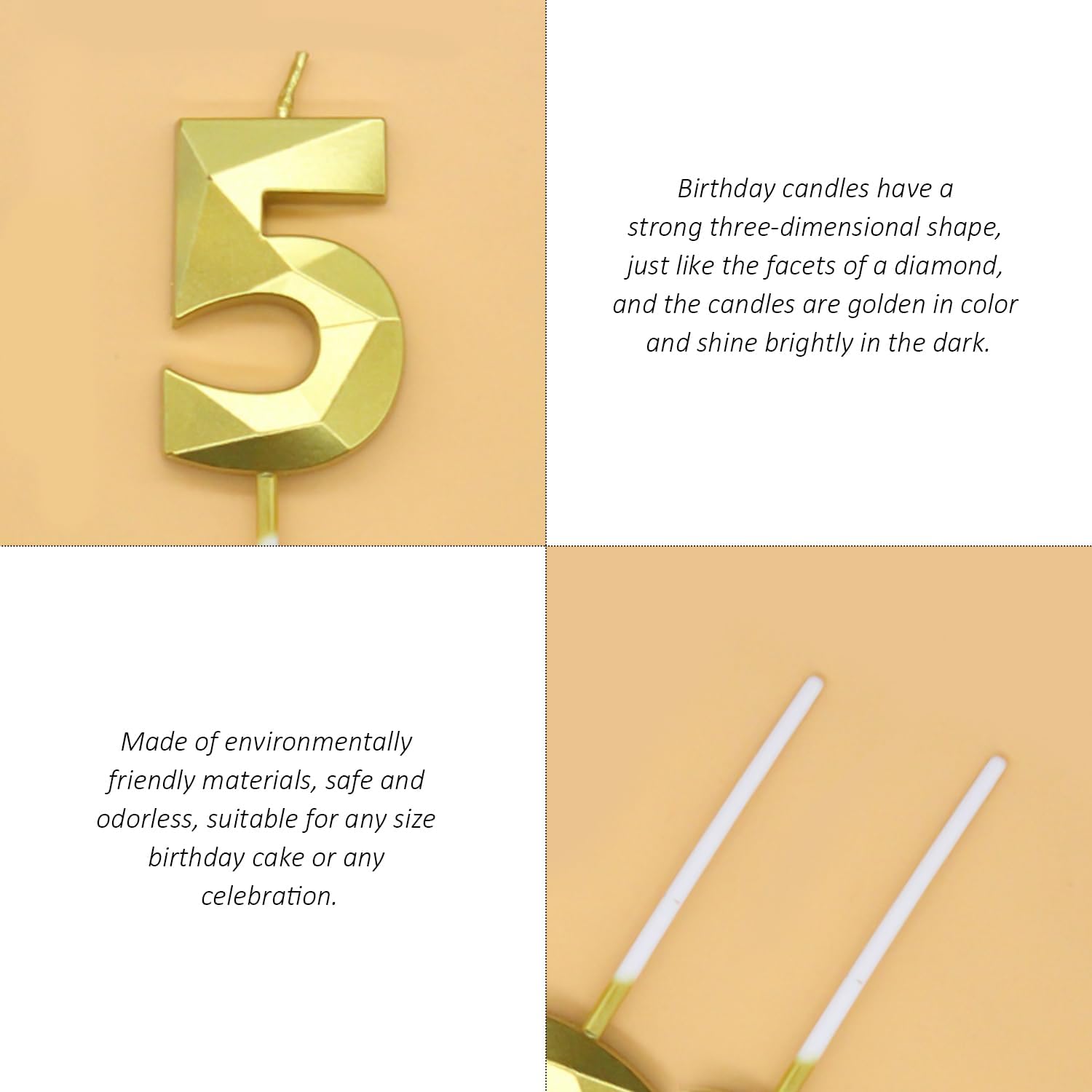 1. Contenuto del prodotto: riceverete 2 candele numeriche numero 5 o 0, il colore è oro, la dimensione è di 5 x 3,5 cm, lo stile è classico per soddisfare le vostre esigenze di decorazione della festa. 2. Materiale del prodotto: le nostre candele di compleanno sono realizzate in cera di paraffina, che è robusta e durevole per soddisfare la tua esperienza di utilizzo quotidiano. 3. Design classico: le nostre candele di compleanno hanno un design a sezione prismatica che rende la candela più tridimensionale e dà un senso del design. Lo splendido colore dorato delle candele lascia una bella impressione su tutti e lascia profondi ricordi. 4. Facile da usare: le nostre candele di compleanno sono molto facili da installare. Devi solo aprire la confezione e metterla direttamente sulla torta. Usalo con le nostre candele. Con pochi gesti si può creare l'atmosfera perfetta per le feste. 5. Ampiamente usato: le nostre candele di compleanno sono perfette come decorazioni per torte e sono adatte anche per feste di compleanno e balli. Le candele scintillanti aggiungono una decorazione unica alla festa di compleanno dei tuoi amici o familiari.