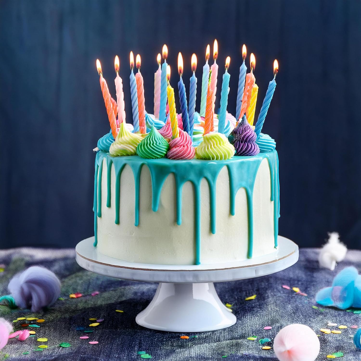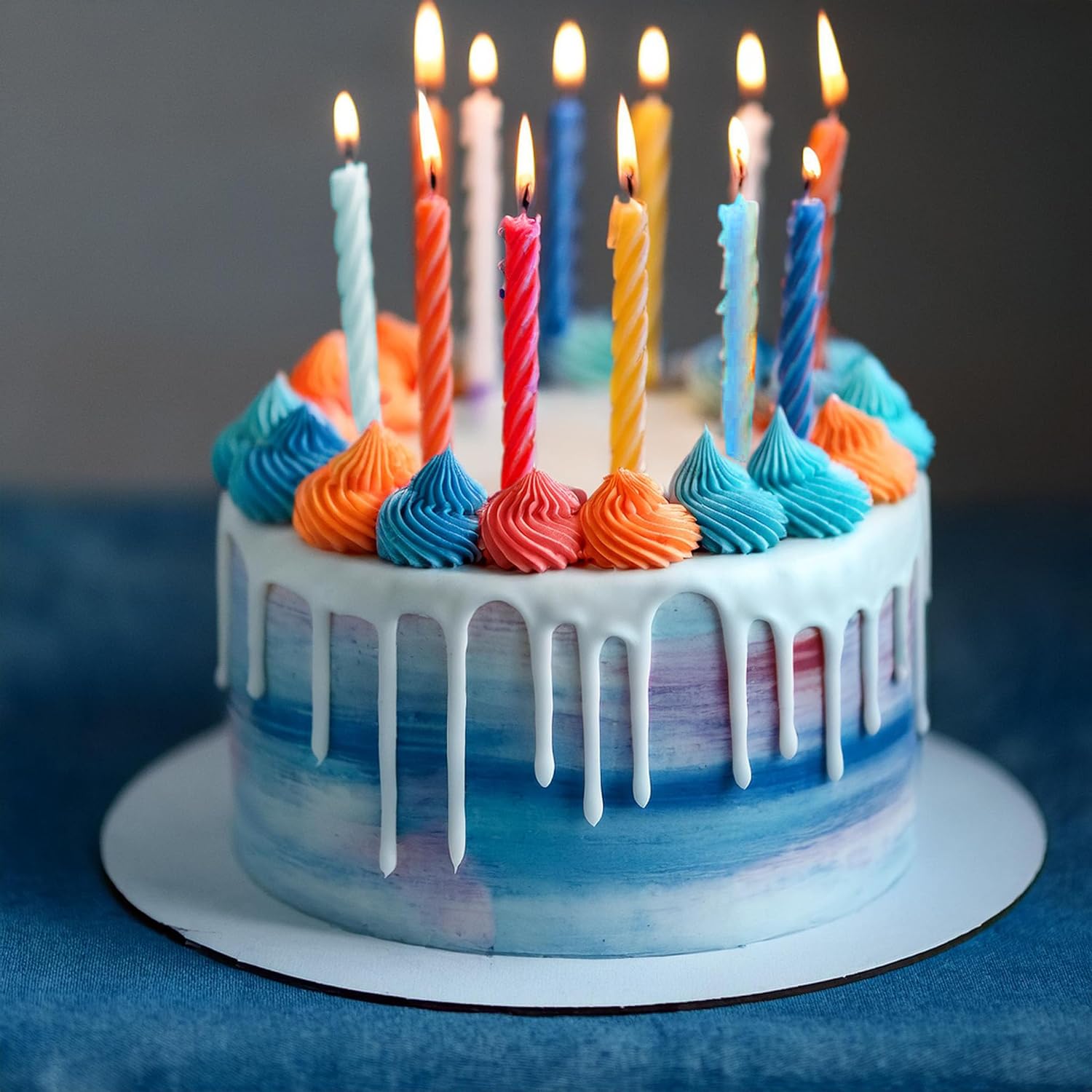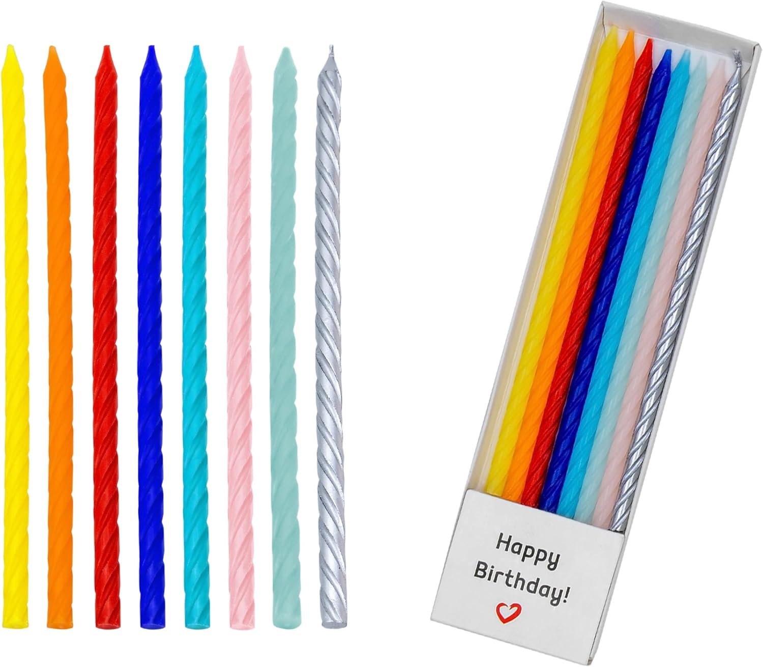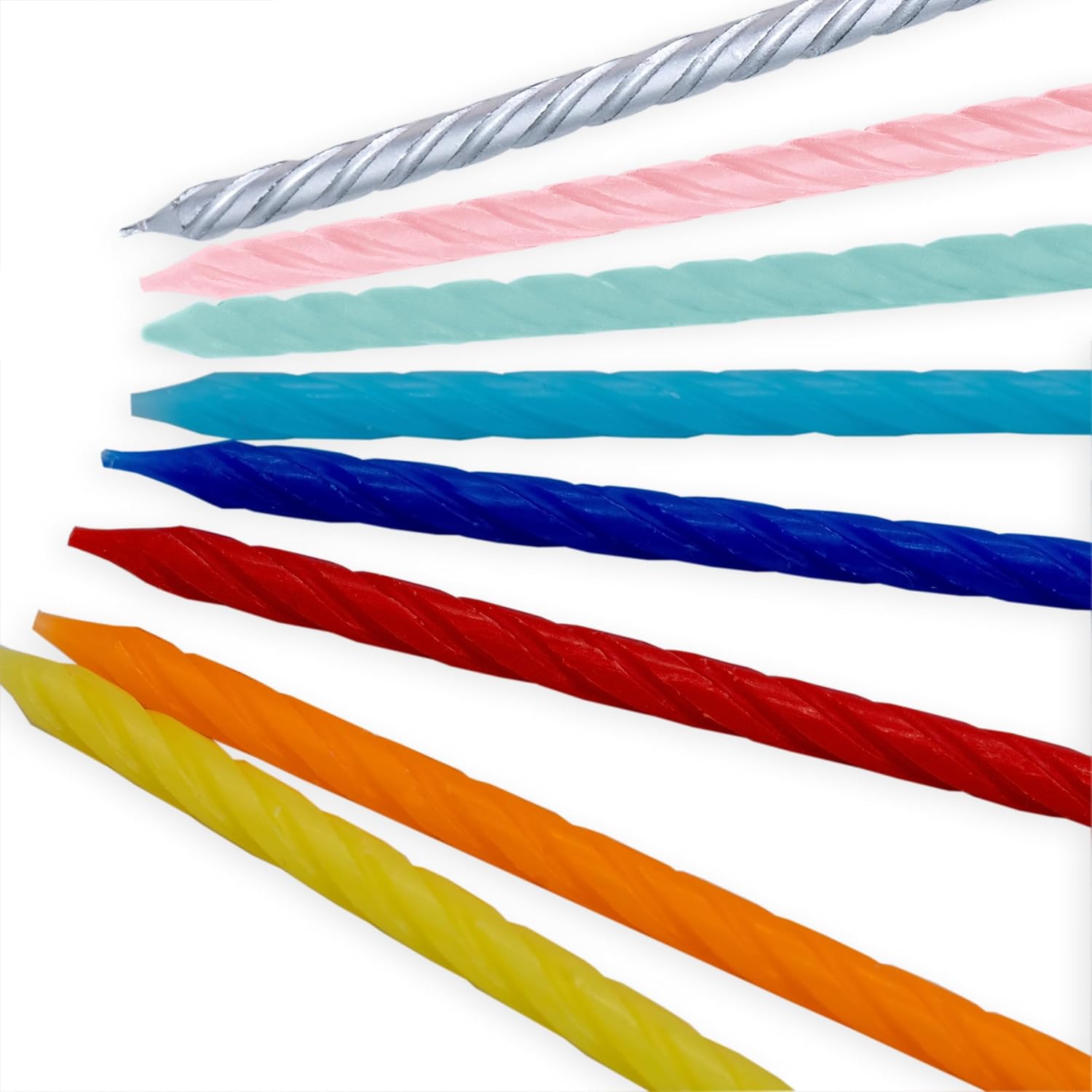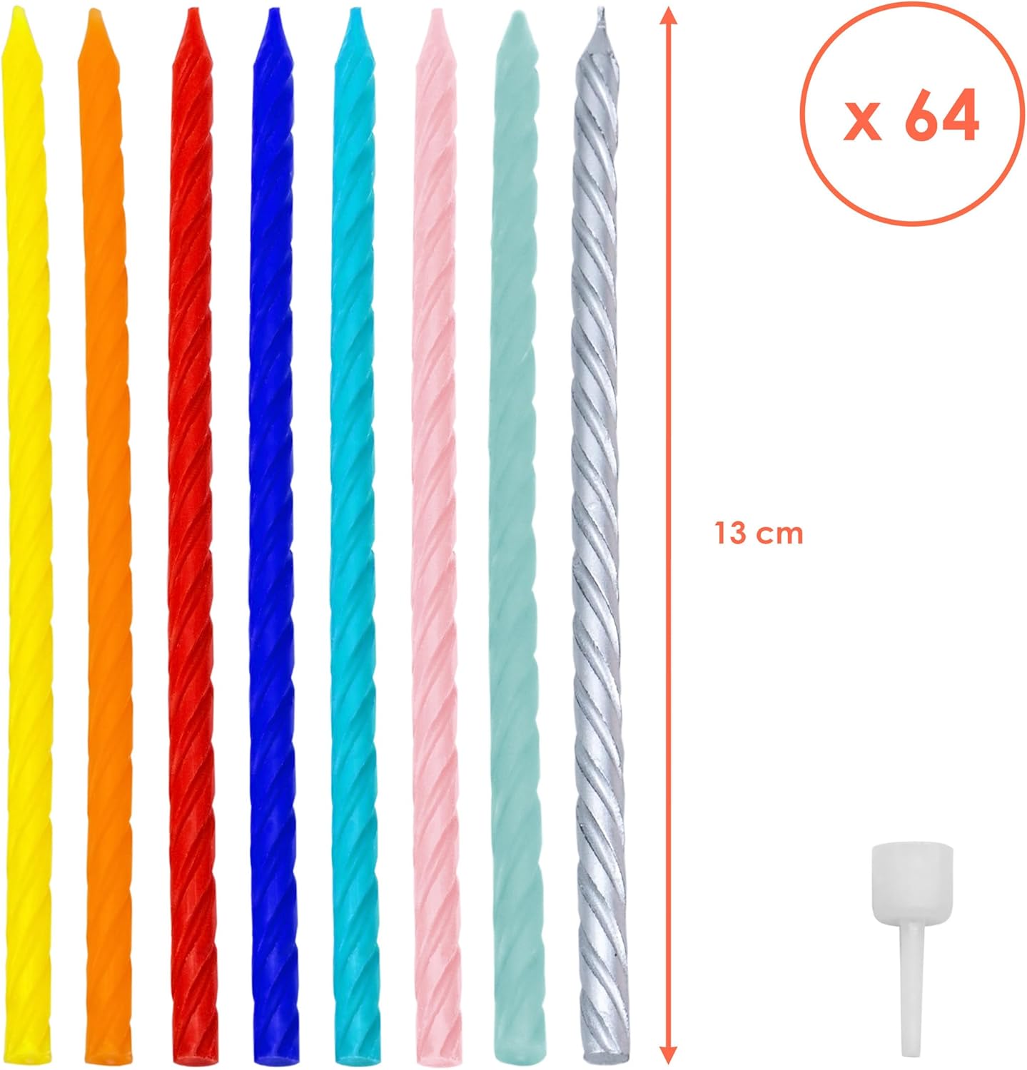 La dimensione di ogni candela è di circa 13 cm x 0,5 cm (altezza x diametro) Materiale: cera Colore: multicolore 64 candele in 8 colori colorati Design decorativo a spirale Include 64 supporti in plastica Ideale per torte, torte, muffin e cupcake