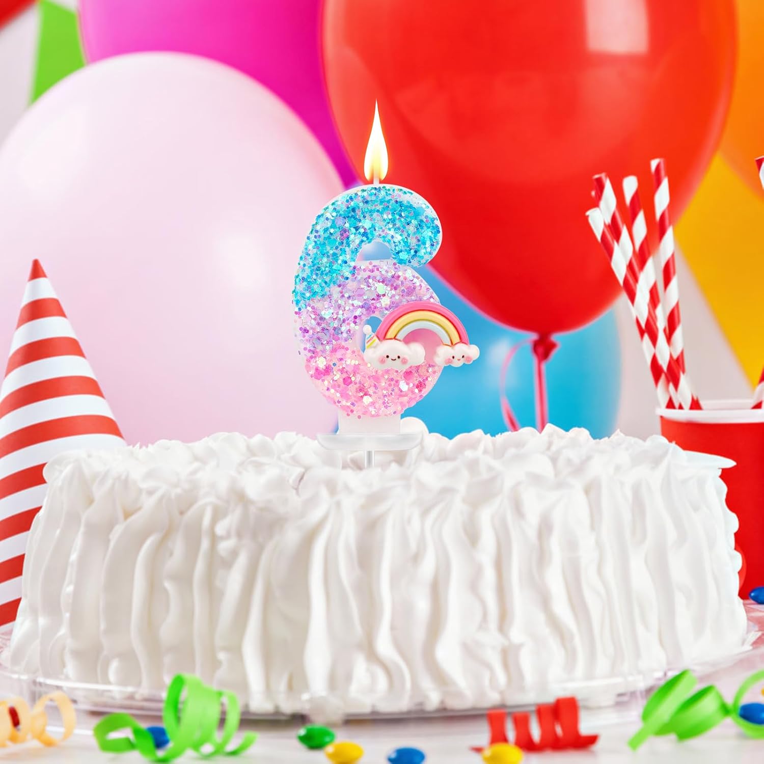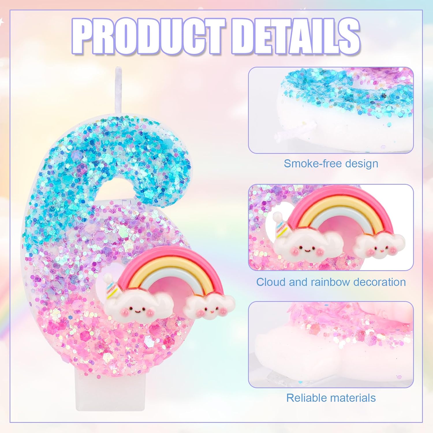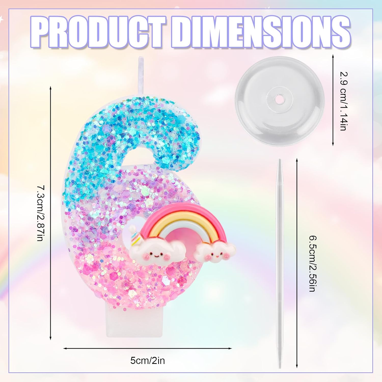 Il pacchetto include: riceverai 1 pezzo di candela di compleanno arcobaleno, vieni con 1 base di plastica e 1 inserto in plastica, facile da decorare la torta. Materiale affidabile: le candele per torta di compleanno sono realizzate in cera di paraffina premium, che è sicura e affidabile, senza fumo e senza odore, brucia in modo pulito e uniforme;Dotato di un supporto in plastica e di inserire l'asta, può essere posizionato in sicurezza sulla torta. Design luminoso: le nostre candele sono progettate con motivi arcobaleno luminosi e decorate con paillettes frizzanti, che sono delicati e lucenti, accattivanti e pieni di atmosfera festosa e gioiosa. Dimensione perfetta: la candela misura circa 7,3x4,3 cm, la dimensione di base è di 2,9x2,9 cm e la lunghezza dell'asta è di 6,5 cm, adatta per decorare varie torte.(La dimensione specifica della candela è mostrata nella foto) Ampia applicazione: la candela di compleanno arcobaleno è nuova e interessante, aggiungendo un'atmosfera festosa a torte di compleanno, cupcakes e tavoli da dessert, aggiungendo fascino alle celebrazioni, adatti per feste di compleanno, anniversari, docce per bambini e feste a tema dei cartoni animati.