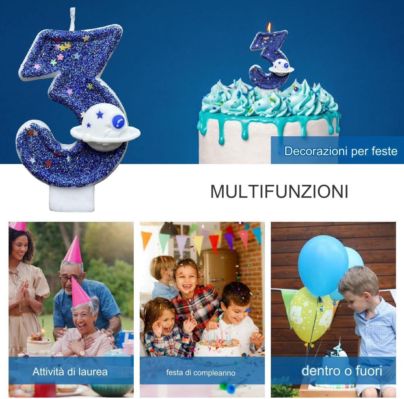Numero candele: completa l'arredamento della tua festa con queste affascinanti candele per cifre. Il set è disponibile in tutti i numeri da 0 a 9, fornendo più possibilità di età Space Planet Design: trasporta la tua festa di compleanno in un altro mondo con questa candela di compleanno affascinante del design del pianeta spaziale blu. Il suo design unico aggiunge un tocco di fantasia alla torta tradizionale, creando un paesaggio straordinario che l'atmosfera e rende la celebrazione davvero indimenticabile Sicuro per l'utilizzo: un fondo ben progettato della candela migliora la sicurezza e lo rende sicuro da utilizzare per i bambini. Non si inclinò o cadrà, aggiungendo alla gioia e alla pace della mente della celebrazione. Inoltre, un facile inserimento nella torta l' della festa Forniture per feste perfette: questa candela di numero di compleanno a tema spazio è perfetta per creare l'atmosfera ideale per feste. Che si tratti di una festa a tema spaziale per bambini, parte 'intero decorazione della festa o di un'aggiunta romantica a una festa per adulti, questa candela aiuterà a reggere la celebrazione a nuove altezze Design scintillante: il colore blu di questo numero di candele con una luce affascinante, preparando la torta di compleanno immediatamente accattivante. Il suo design scintillante aggiunge un tocco di divertimento, rendendo le tue celebrazioni più memorabili e divertenti che mai