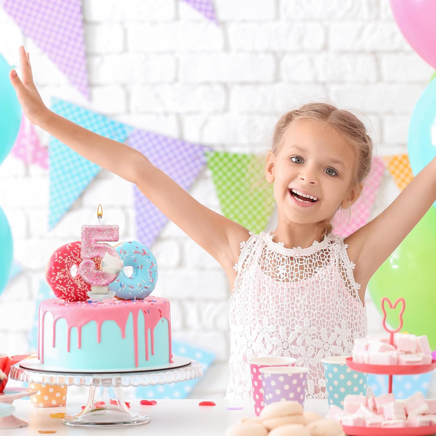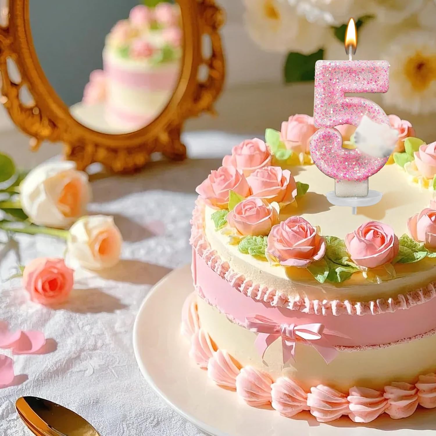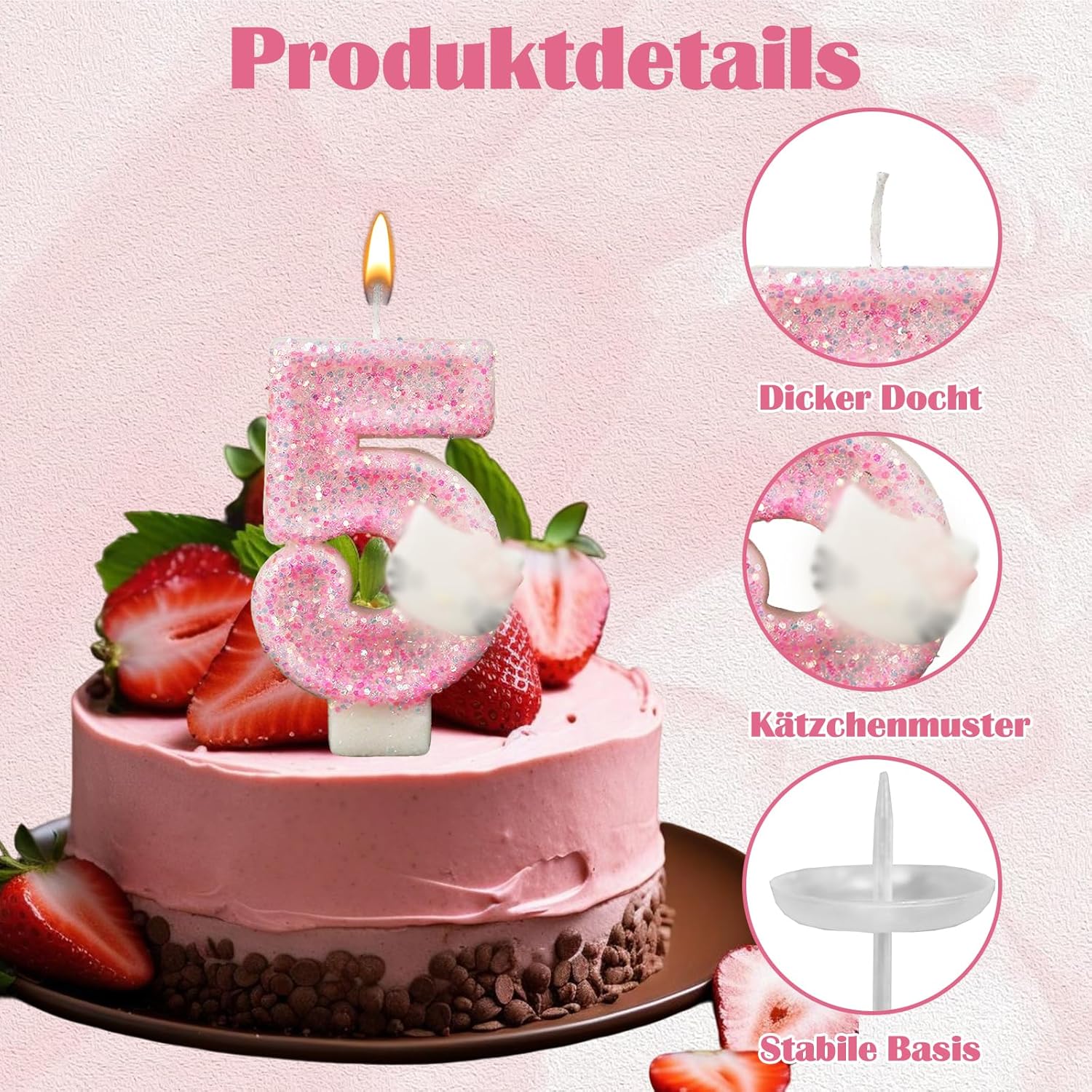 Incantevole decorazione rosa: le nostre candele per il quinto compleanno presentano un adorabile design rosa e sono quindi la decorazione perfetta per feste di compleanno per feste a tema Hello Kitty e altre feste femminili. L'incantevole tonalità rosa aggiunge un tocco di carineria e femminilità a qualsiasi torta di compleanno. Dimensioni adatte: le nostre candele con numeri misurano 3 x 1,6 pollici e sono perfette per tutti i tipi di torte, sia grandi torte tradizionali che dolci mini cupcake. Queste candele sono ideali come incantevoli decorazioni per torte, aumentano l'attrattiva visiva dei dessert e aggiungono brillantezza alle feste allegre. Materiali di alta qualità: le nostre candele Happy Birthday sono realizzate in cera di alta qualità, sicura e affidabile. Bruciano in modo uniforme e non producono fumo né odore e garantiscono così un'atmosfera di vacanza pulita e piacevole. Affidatevi alla sicurezza e alla qualità di queste candele, perfette per la vostra occasione speciale. Regalo per ragazze: il set di decorazioni per torte di compleanno scintillante include una candela con paillettes rosa scintillanti, un manico e un porta cera. Questo regalo decorativo per il quinto compleanno non è solo un regalo di compleanno accuratamente selezionato, ma esprime anche il vostro amore e i vostri auguri. Versatile: le candele di compleanno sono molto adatte per compleanni, battesimi, anniversari, feste di pensione, feste di famiglia, matrimoni, banchetti hawaiani e come decorazione per torte. Rendono la decorazione della tua festa di compleanno più significativa e memorabile e ti garantiranno il buon umore.