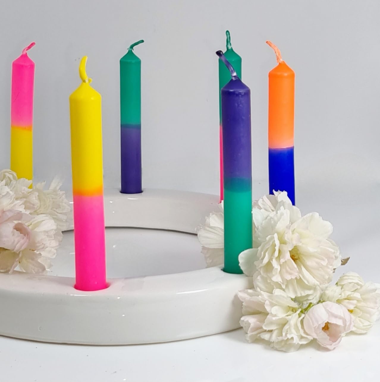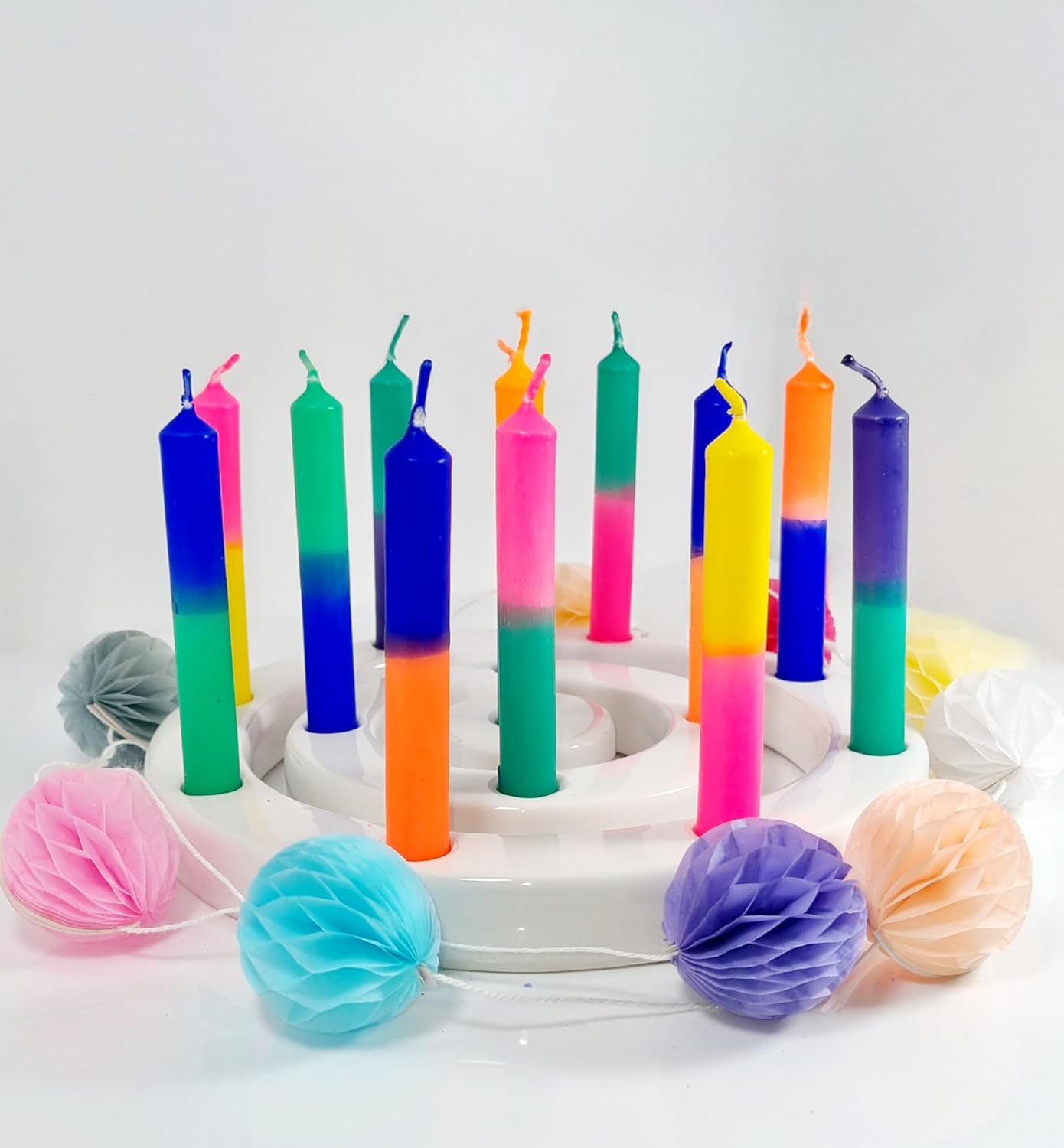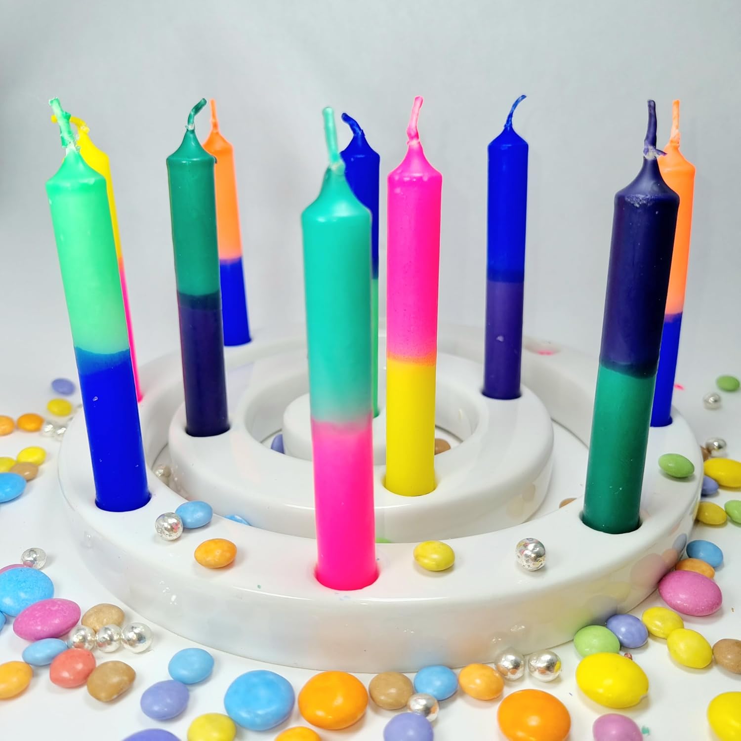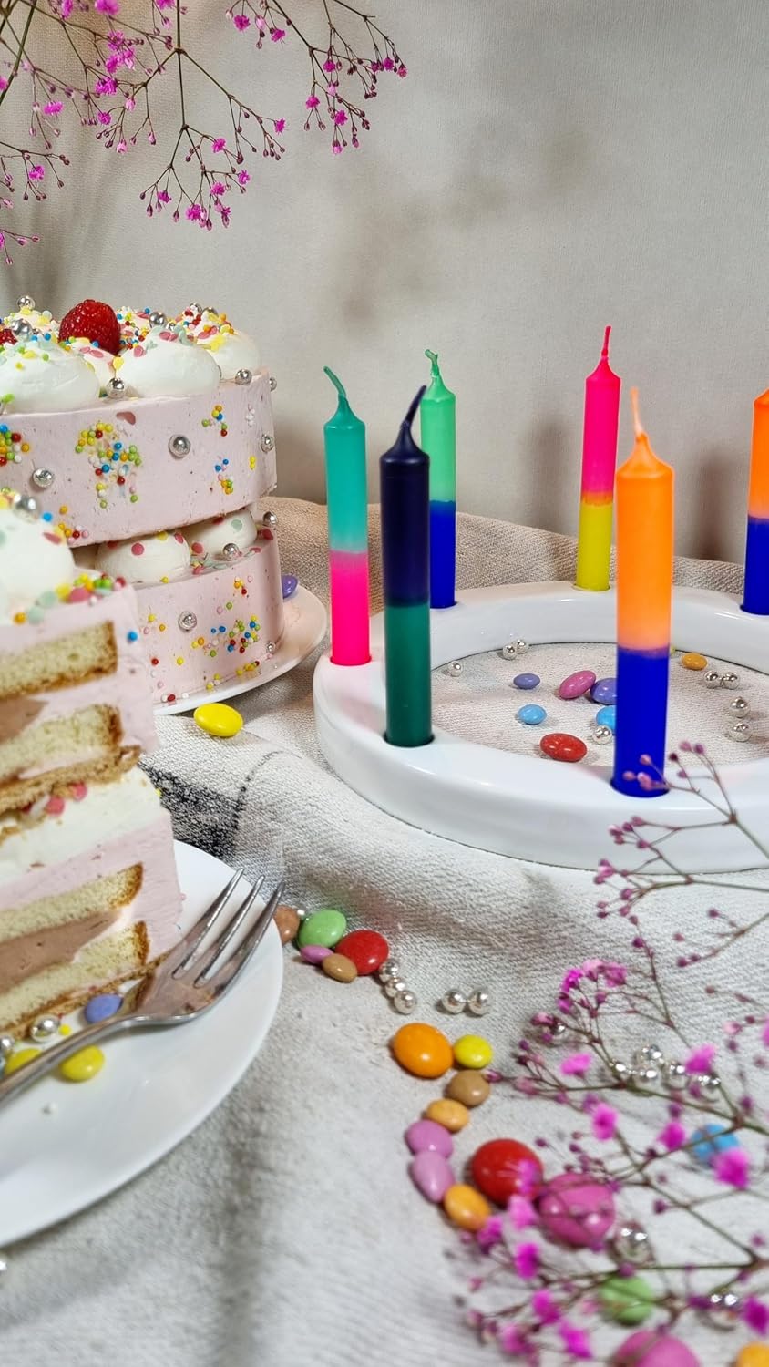 💗MERAVIGLIOSO set di candele per anelli di candele o trenini di compleanno, i colori vivaci ti mettono di buon umore e portano un tocco luminoso su ogni tavola. La lunghezza di 10,3 cm e il diametro di 12 mm si adattano a tutti i mini portacandele standard. 🌈REGALO per ogni occasione: che si tratti di un compleanno, battesimo, matrimonio o semplicemente per farti felice, le piccole e colorate candele dip dye sono un souvenir e una decorazione innocui, soprattutto per bambini e amici dai vivaci colori al neon. 💗MADE IN GERMANY Produco nel mio laboratorio vicino a Stoccarda e ogni candela è unica. Le candele sono realizzate in cera di paraffina di alta qualità e realizzate a mano. 🌈La SOSTENIBILITÀ è l'argomento del momento, imballiamo in scatole di giornali e di seconda mano, la merce è avvolta in carta velina nuova di zecca. Il nostro ambiente è importante per noi, aiutaci a evitare i rifiuti di imballaggio con nuovi imballaggi. La carta straccia è riciclabile quasi al 100%. Non esiste il pianeta B.
