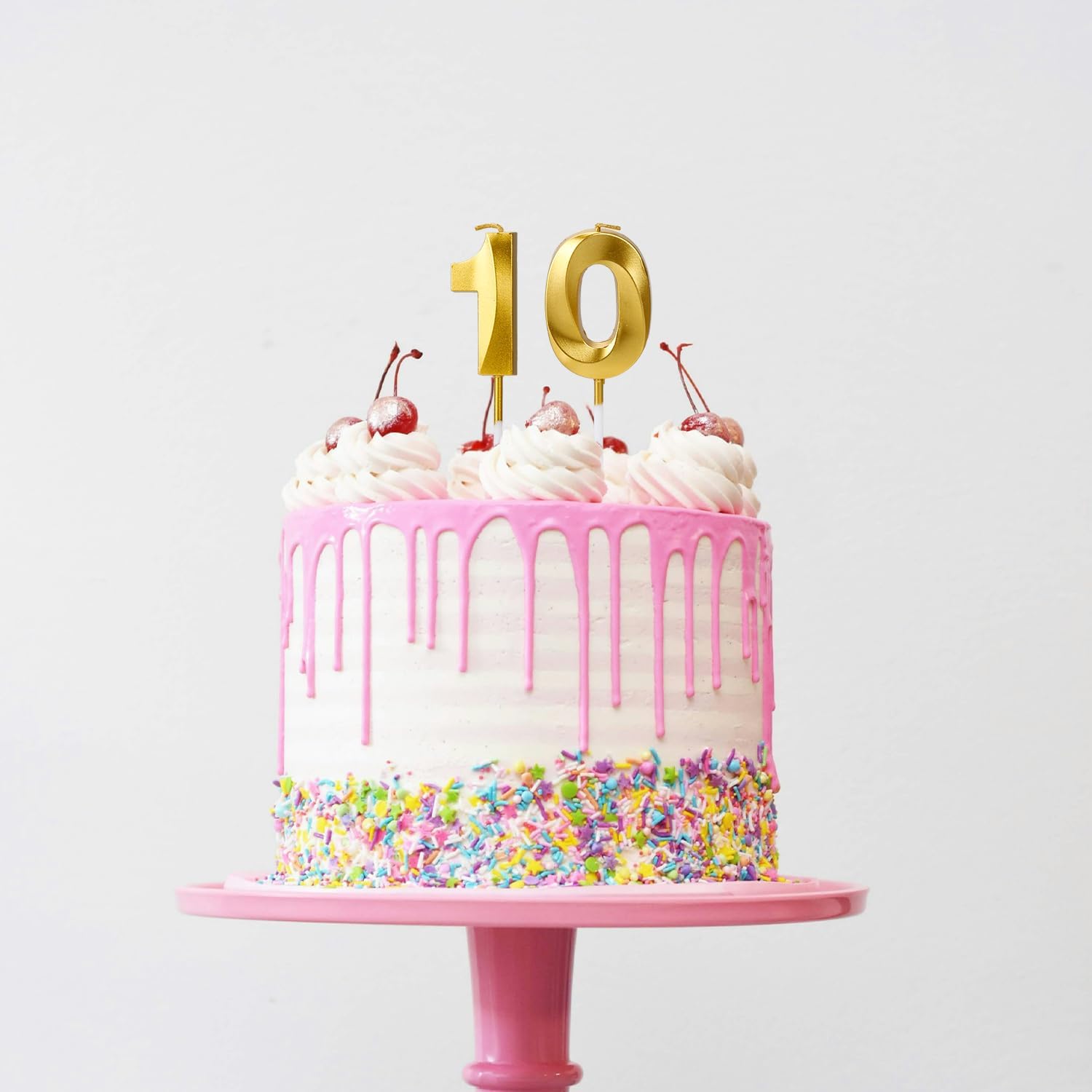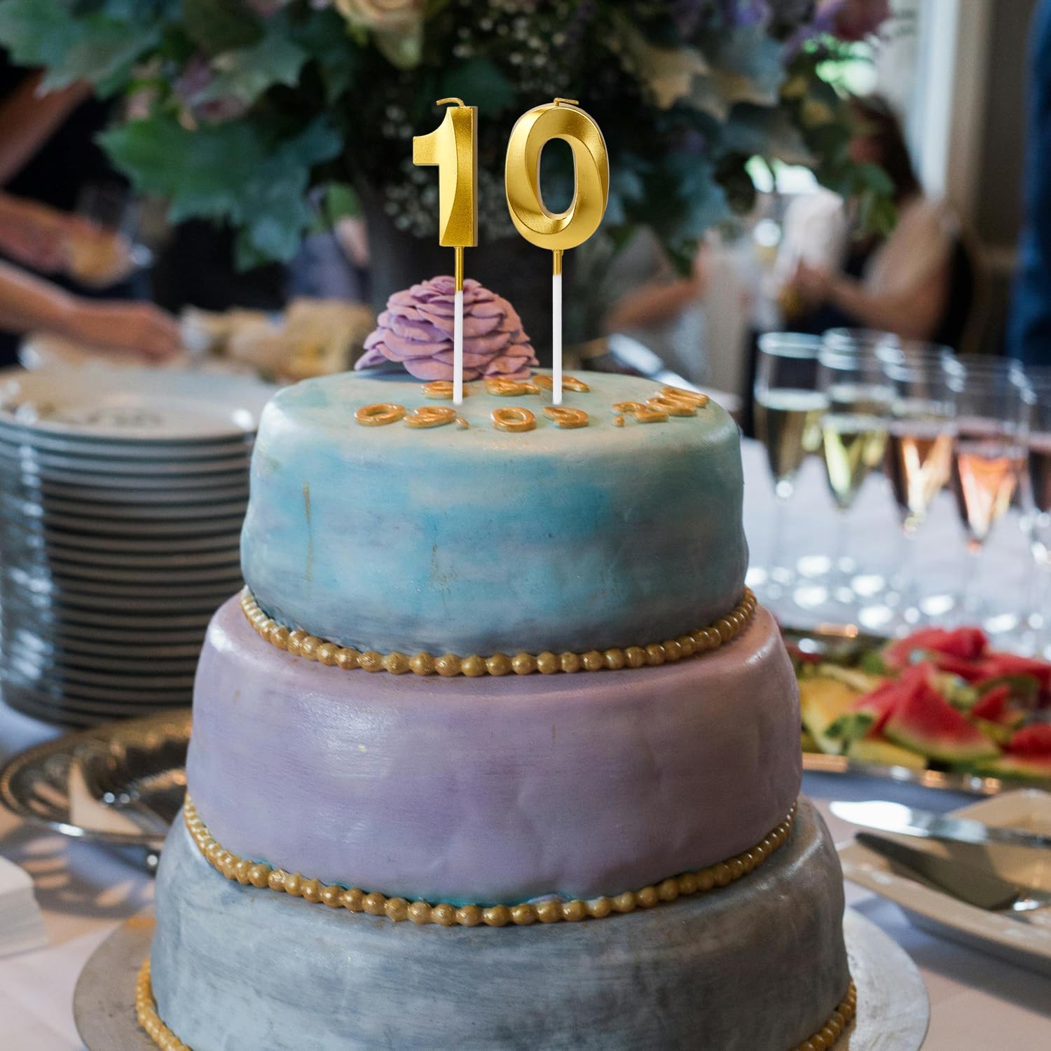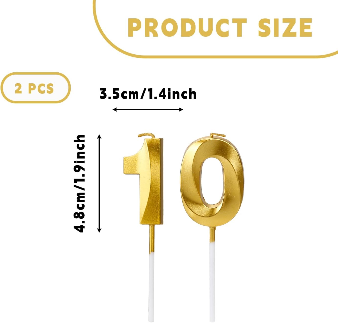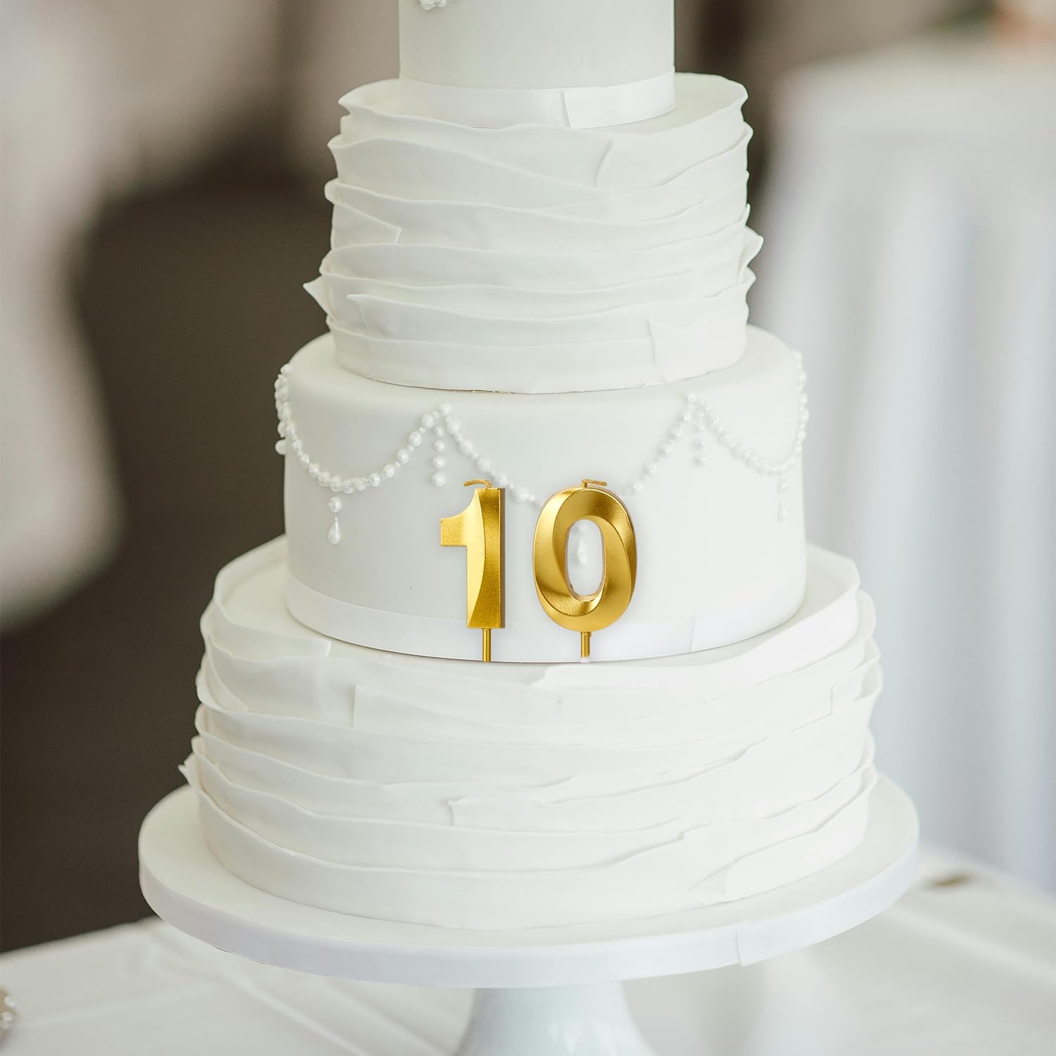 Design in oro 3D di alta qualità: presenta una finitura metallica abbagliante con taglio a diamante che cattura la luce magnificamente, creando uno splendido punto focale per qualsiasi torta di festa. Bruciatura sicura e pulita: realizzata in cera atossica di alta qualità che brucia uniformemente senza fumo o odori sgradevoli (3-5 minuti di combustione). Facile da usare e conservare: ogni candela viene fornita con una copertura protettiva in plastica per mantenerle intatte prima dell'uso. Le dimensioni compatte li rendono facili da riporre per future celebrazioni. Momento foto-perfetto: crea un caldo bagliore dorato che migliora le foto delle celebrazioni e rende il momento degli auguri di compleanno davvero memorabile. Multiuso: perfetto per 10° compleanno, anniversario, feste di pensionamento e altre celebrazioni importanti. Si abbina sia a temi di arredamento casual che formali.