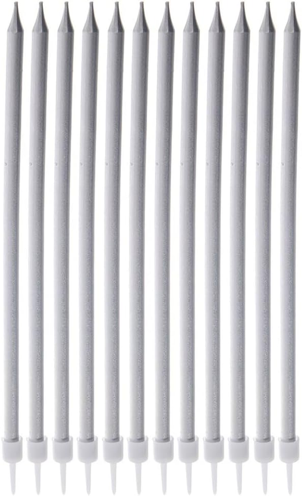Lungo: un set di 12 candele per torta, ognuna lunga 14,5 cm, realizzata in cera. Ideale per decorare torte e torte in occasioni speciali come compleanni, anniversari o festività. RESISTENTE - Il set include anche 12 portacandele bianchi che consentono di posizionare le candele in modo sicuro sulla torta. Impressionante: le candele lunghe si presentano in modo impressionante sulla torta grazie alla loro lunghezza. Pratico: l'altezza adeguata delle candele assicura che siano ben visibili anche su torte più grandi e aggiungano fascino alla torta senza nascondere altre decorazioni.