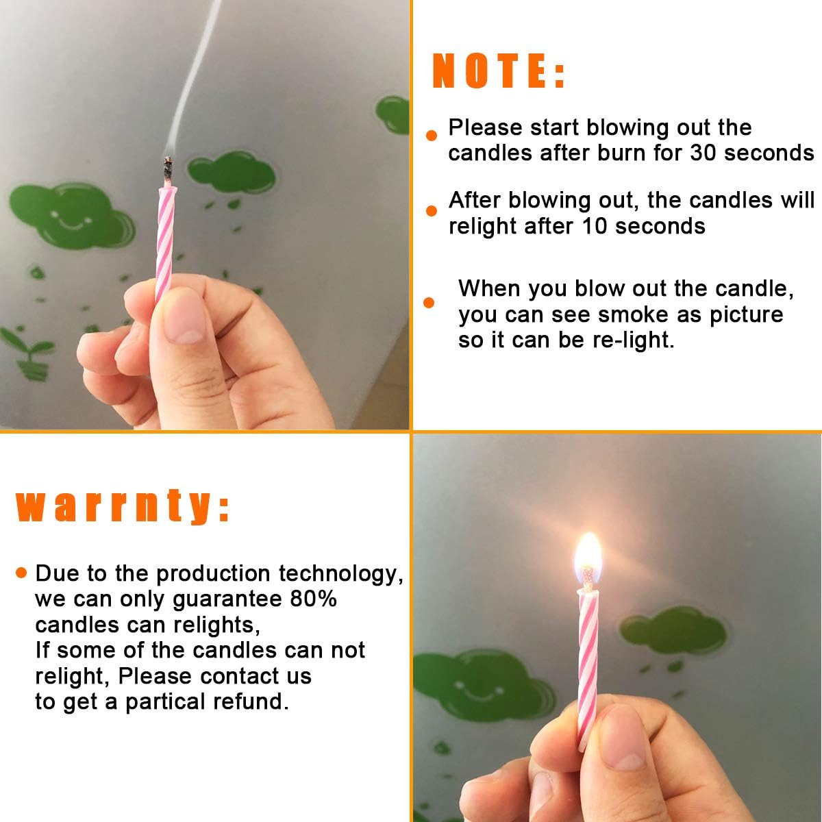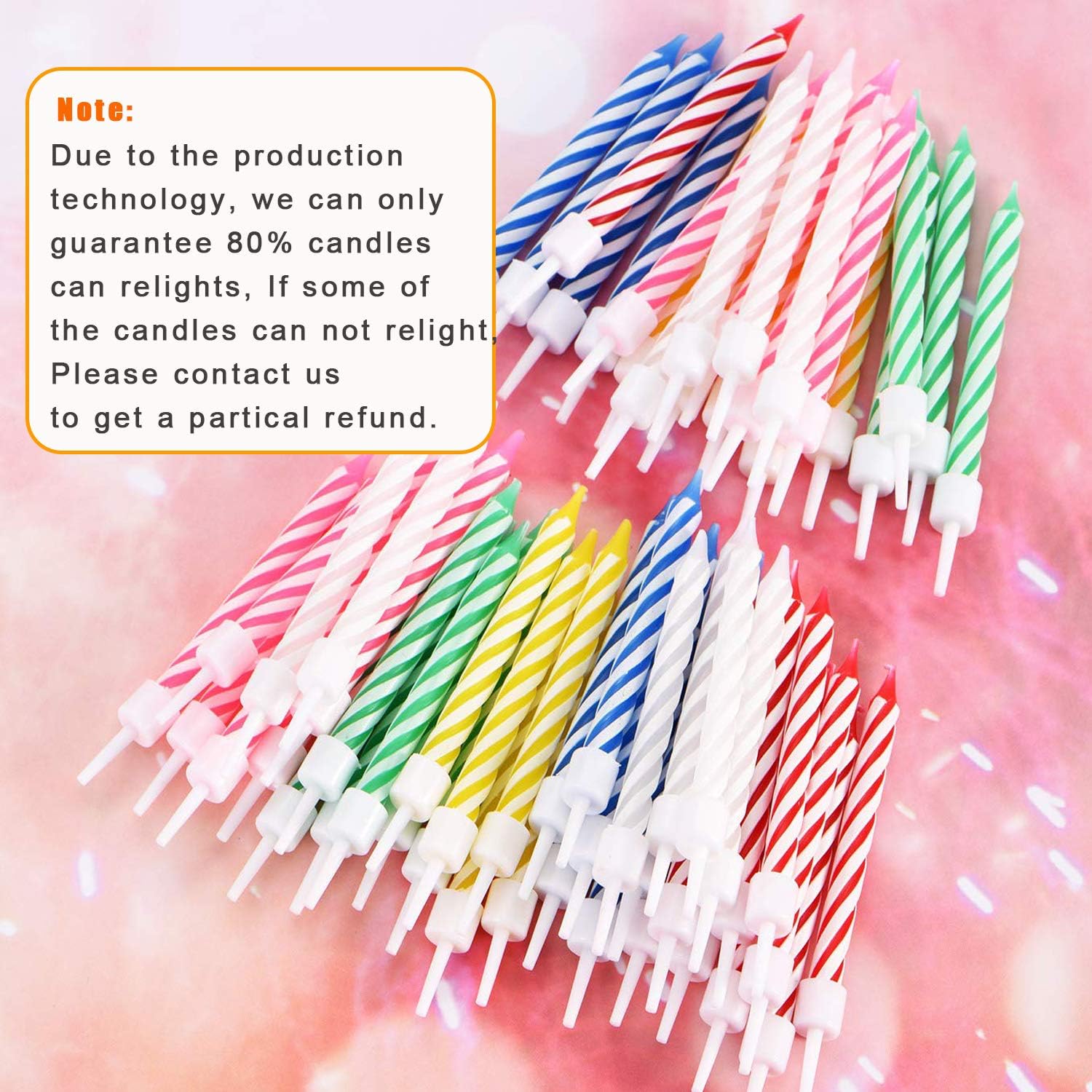 🎂LA CANDELA DI COMPLEANNO RELIGHT COMPRENDE: Totale 30 candeline scherzose con supporti, 10 candele magiche per confezione. ✅Inizia a spegnere la candela per 30 secondi dopo averla accesa. Dopo 10 secondi si riaccende. ✅A causa della tecnologia di produzione, possiamo garantire che solo l'80% delle candele possa essere riacceso. Se alcune candele non possono essere riaccese, contattaci per un rimborso parziale. 🎂PERFETTO PER LE FESTE: le nostre scintillanti candele possono essere utilizzate per qualsiasi celebrazione. Ideale per matrimoni, cene all'aperto e feste di compleanno. Utilizzare come decorazione per torte o cupcake. 🎂CANDELA SCHERZO DIVERTENTE ed ELEGANTE: crea più ricordi e divertimento alla festa. Osserva e cattura le loro preziose reazioni mentre tentano di spegnere le candele riaccese. 🎂CANDELE SICURE PER LA TORTA DI COMPLEANNO: Realizzate in cera atossica, puoi stare certo che le nostre candele sono perfette per qualsiasi occasione regolare e a tema. Basta rimuovere le gocce di cera dalla torta ed è ancora commestibile. 🎂 REGALO DIVERTENTE PER I COMPLEANNI - Le nostre candele scintillanti possono essere utilizzate per qualsiasi celebrazione. Ideale per matrimoni e cene all'aperto. Un'idea regalo creativa. [NOTA]: è necessario inserire acqua per spegnere le candele.