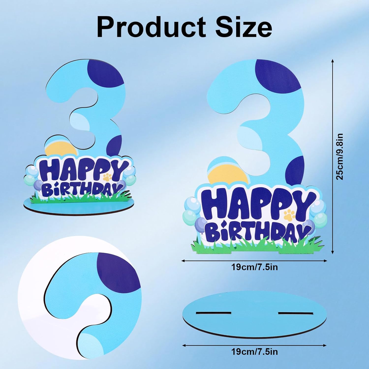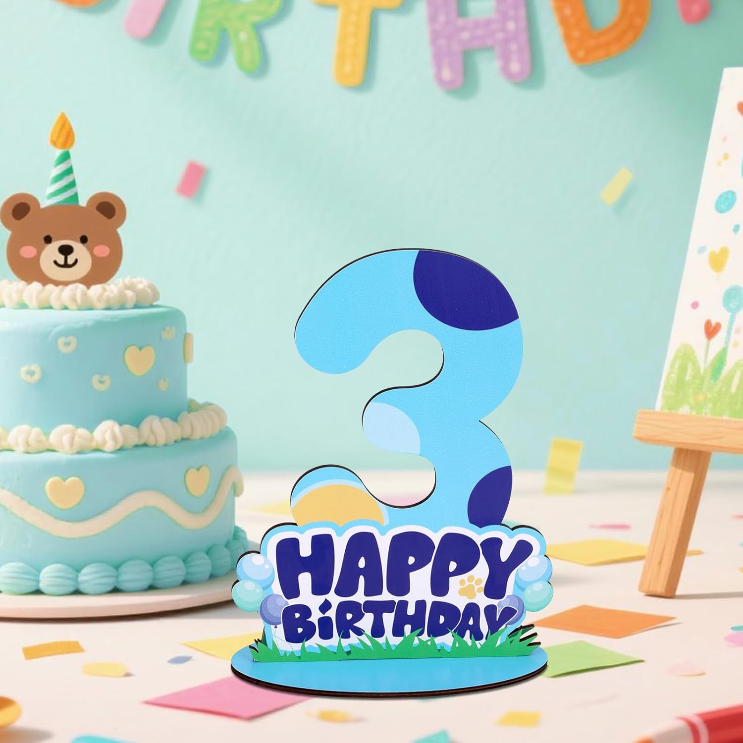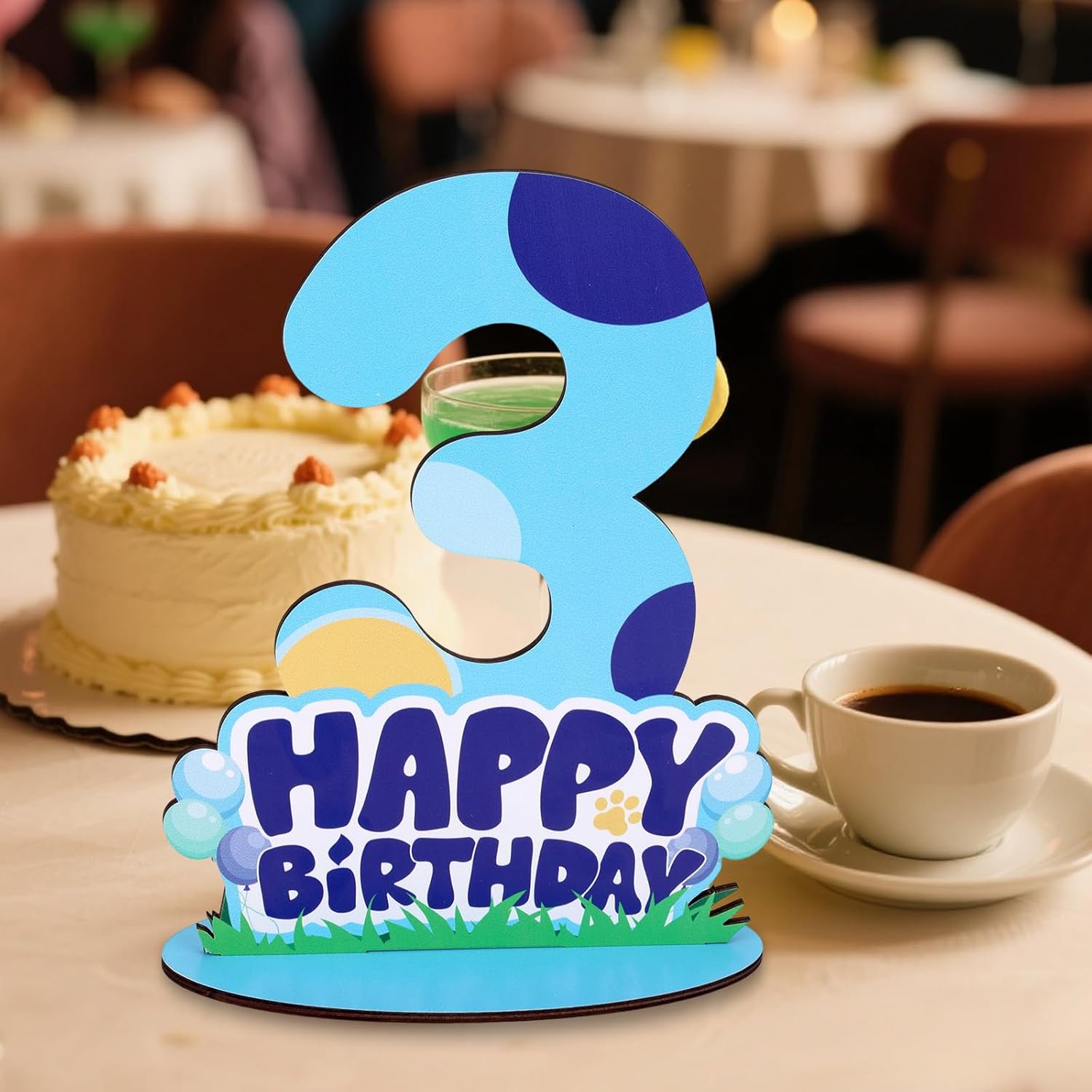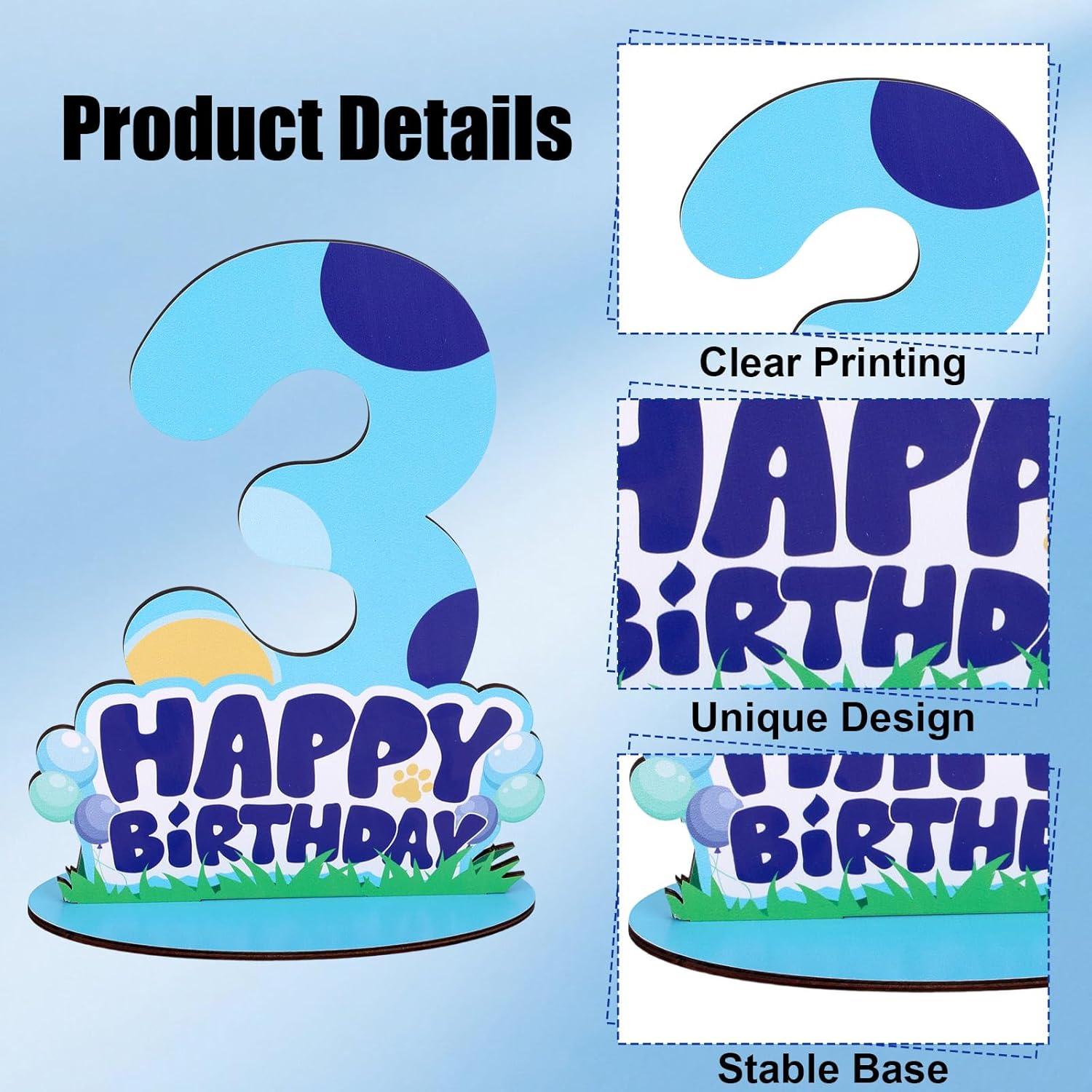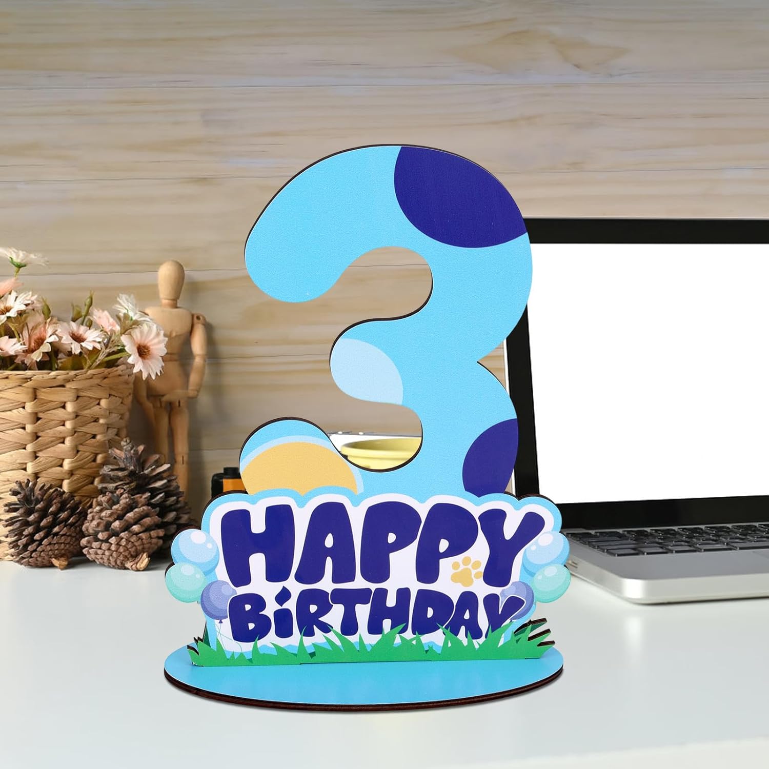 Cane Blu Centrotavola Segno 3° Compleanno per Tavolo, Legno Happy Birthday Supporto Numero per Ragazzi Ragazze Bambini Decorazioni Feste Autoportanti