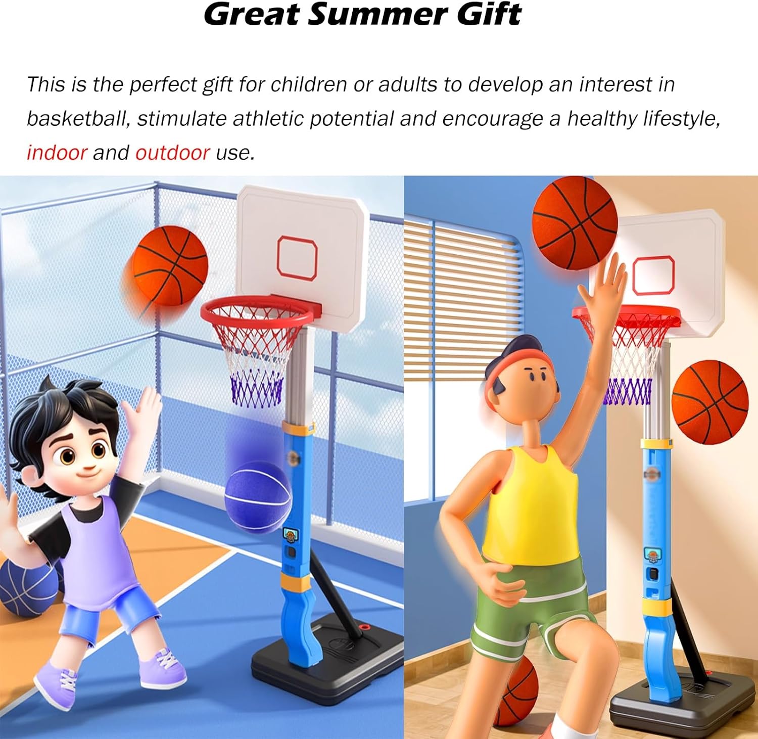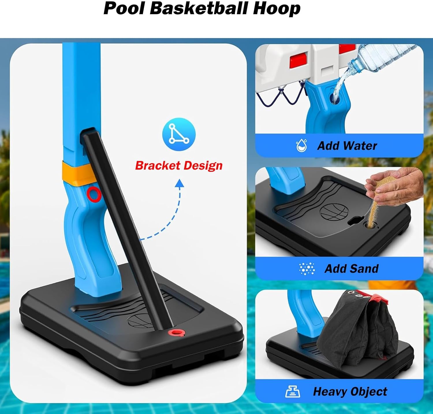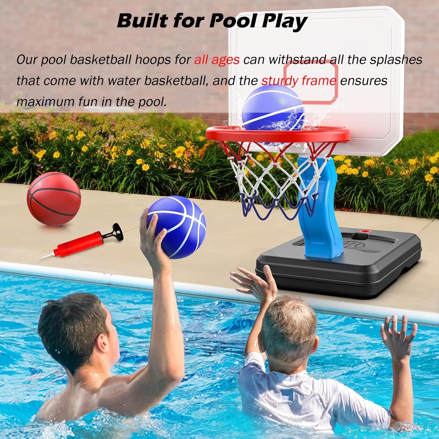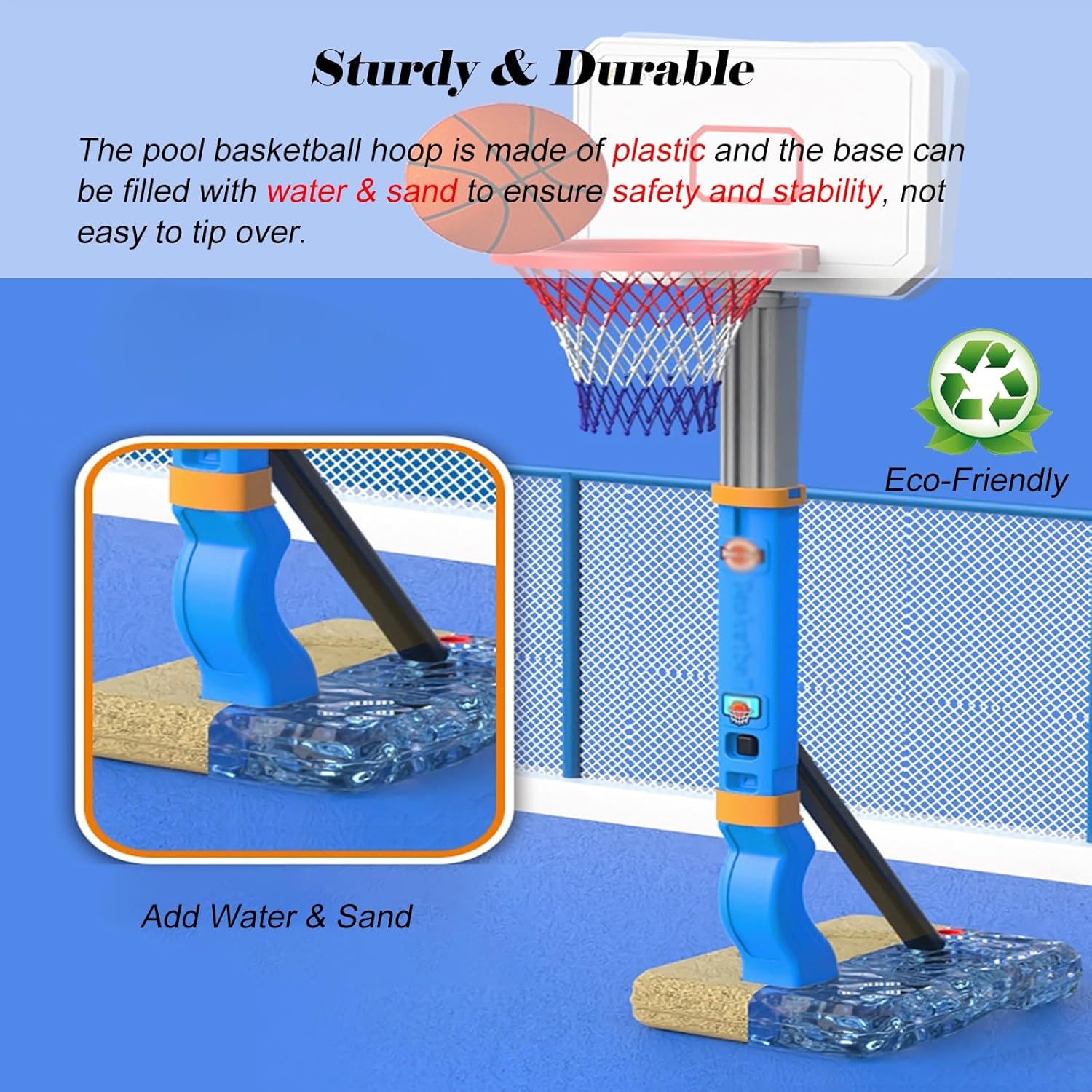Robusto e durevole: i nostri canestri da basket da piscina sono realizzati con materiali affidabili, robusti e durevoli, non facili da ribaltare e più stabili per garantire sicurezza e affidabilità e non facili da rompere Altezza regolabile: l'altezza del canestro da basket da piscina è regolabile, sia alta che bassa; puoi posizionare il canestro da basket basso a bordo piscina, come giocattolo da piscina, adatto anche ai bambini piccoli per imparare a giocare a basket 2 modi per giocare: puoi usarlo come canestro da basket da piscina per portare l'emozione del basket dal campo alla piscina e goderti il brivido di schiacciare a bordo piscina, oppure allenare le tue abilità di tiro al chiuso per aumentare l'interesse di tuo figlio per lo sport. Un'idea regalo fantastica: che siano bambini, adolescenti o adulti, possono godersi ore di divertimento che svilupperanno il loro interesse per il basket, ispireranno il potenziale atletico dei giovani e incoraggeranno stili di vita sani. Facile da montare: il supporto da basket può essere montato in pochi secondi, la base può essere riempita con acqua e sabbia per garantire sicurezza e stabilità, non facile da ribaltare