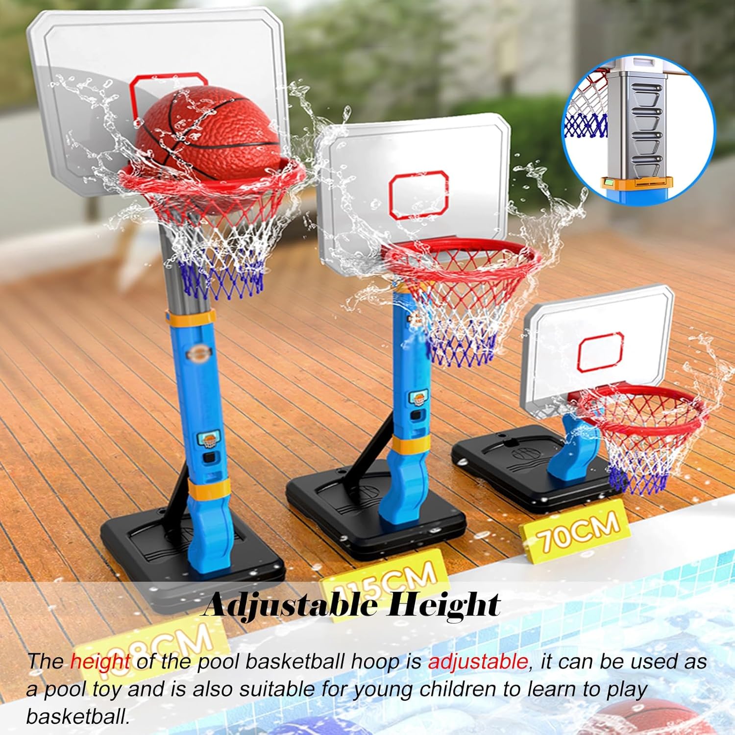 【Robusto e durevole】 Il nostro canestro da basket per piscina è realizzato in materiale di alta qualità, con struttura robusta e durevole, non facile da ribaltare, maggiore stabilità, garantisce sicurezza e affidabilità e non si sfalda facilmente. 【Altezza regolabile】 L'altezza del canestro da basket della piscina è regolabile, sia alta che bassa. Puoi mettere il canestro da basket basso a bordo piscina, come un gioco da piscina, adatto anche ai bambini piccoli per imparare a giocare a basket. 【2 modi di giocare】 Puoi usarlo come canestro da basket in piscina, portare l'emozione del basket dal campo alla piscina, goderti il brivido di schiacciare in piscina, oppure puoi esercitarti nelle abilità di tiro al chiuso e migliorare l'interesse dei bambini nello sport. Canestro da basket perfetto per bambini dai 3-6 4-8 6-8 anni. 【Un'idea regalo fantastica】 Questo è il regalo perfetto per bambini o adulti, che siano bambini, adolescenti o adulti, possono godersi ore di divertimento con questo gioco d'acqua. Svilupperà il loro interesse per il basket, ispirerà il potenziale atletico dei giovani e incoraggerà uno stile di vita sano. 【Facilità di montaggio】 Il supporto da basket può essere assemblato in pochi secondi, la base può essere riempita con acqua e sabbia per garantire sicurezza e stabilità, non è facile ribaltarsi.