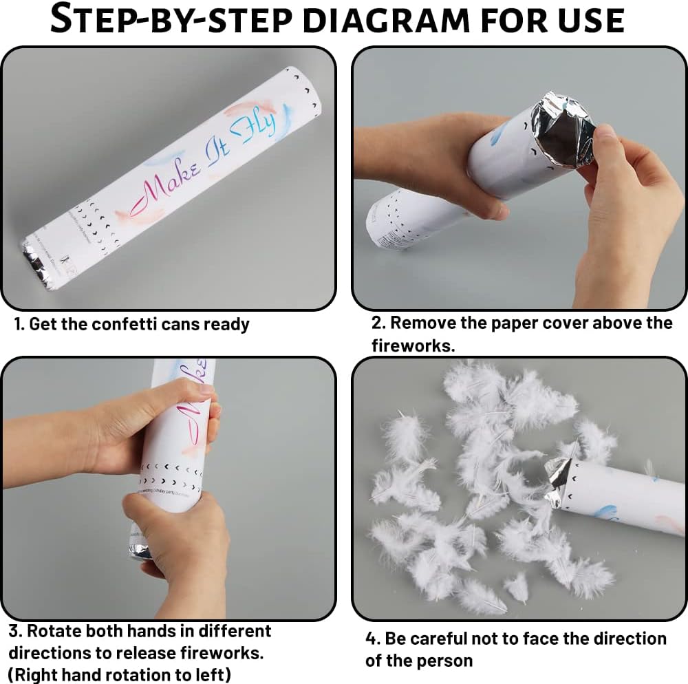 1.【Materiali】 I coriandoli cannoni bianchi hanno 4 materiali diversi, petali di stoffa, piume naturali, coriandoli d'amore e coriandoli a pois bianchi. Nessun odore sgradevole durante l'uso e la rete di sicurezza integrata garantisce la sicurezza del prodotto. Niente fuochi d'artificio o fuochi d'artificio. 2. 【Crea atmosfera】 Il cannone salva coriandoli matrimonio è molto popolare in qualsiasi festa, gira i coriandoli nel momento importante e lascia che la pioggia di coriandoli coloriti renda l'atmosfera della festa al culmine. 3. 【Ricordi indimenticabili】 Molte strisce di coriandoli vengono sparate dallaria dallaria compressa, quindi galleggiano lentamente a terra, sono circondati da coriandoli, questo è molto adatto come oggetto di scena per girare brevi video per registrare momenti belli e indimenticabili. 4. 【Molteplici occasioni】 I can save coriandoli bianchi attirano l'attenzione istantaneamente, perfetti per matrimoni, compleanni, baby shower, lauree, anniversari, Natale, Capodanno ed eventi aziendali. 5. Facile da usare: cinturino sulla parte superiore del coperchio, mantenere un lungo angolo di 45 gradi verso l'alto, tenere il tubo con una mano e il fondo con l'altra, correre nella direzione della frequenza e i coriandoli possono essere utilizzati immediatamente.