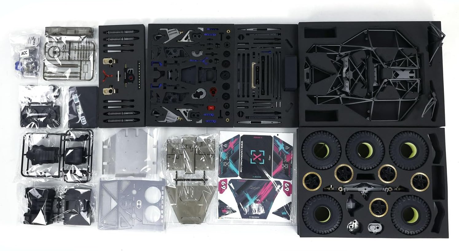 Struttura completa del telaio in lega di alluminio: supera i problemi di auto-peso dei materiali metallici convenzionali. Raggiunge un equilibrio ottimale tra resistenza e design leggero. Processi di produzione e materiali aggiornati per una struttura più affidabile e finemente dettagliata. COMMANDER Steering System: Pioniere nella simulazione di una vera struttura di sterzo a pignone e cremagliera per stabilità ed efficienza. CNC Full Metal Suspension Chassis: Realizzato utilizzando tecniche di lavorazione CNC interamente in metallo. Dispone di barre antirollio anteriori e posteriori bloccabili. Dotato di quattro serie di denti degli ingranaggi e quattro serie di ammortizzatori di smorzamento, insieme a aste di trazione del ponte diritto anteriore e posteriore indipendenti. Scatola di trasmissione a doppia velocità in metallo CNC: utilizza acciaio al carbonio medio con ingranaggi elicoidali temprati. Efficienti rapporti di trasmissione a doppia velocità 1:19.8-1:73, superando le contraddizioni prestazionali tra corsa e arrampicata. Blocchi differenziali indipendenti: utilizza il nuovo processo MIM (Metal Injection Molding) per differenziali con tempra ad alta temperatura. Fornisce una potenza potente con una durezza MoH compresa tra 38 e 45, adatto per strisciare e sprint.