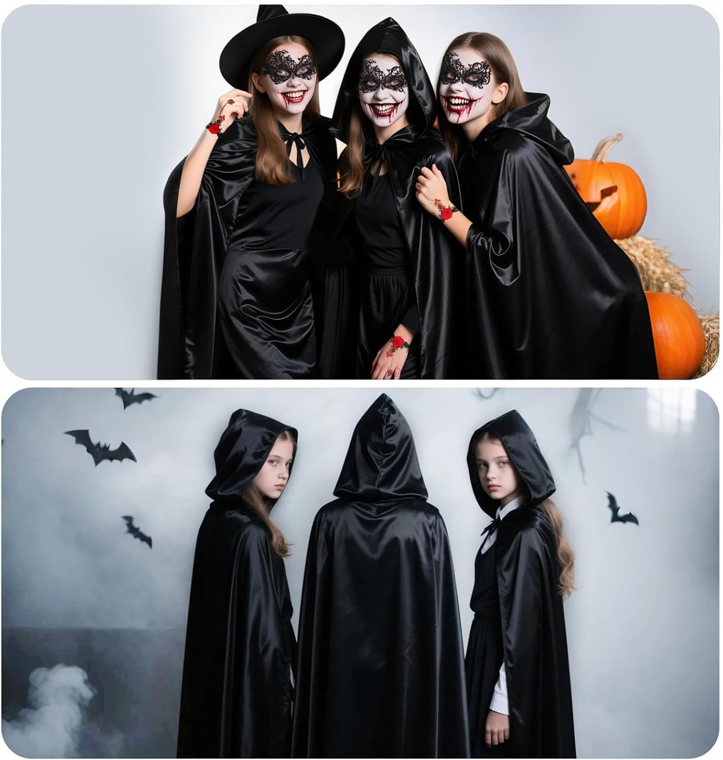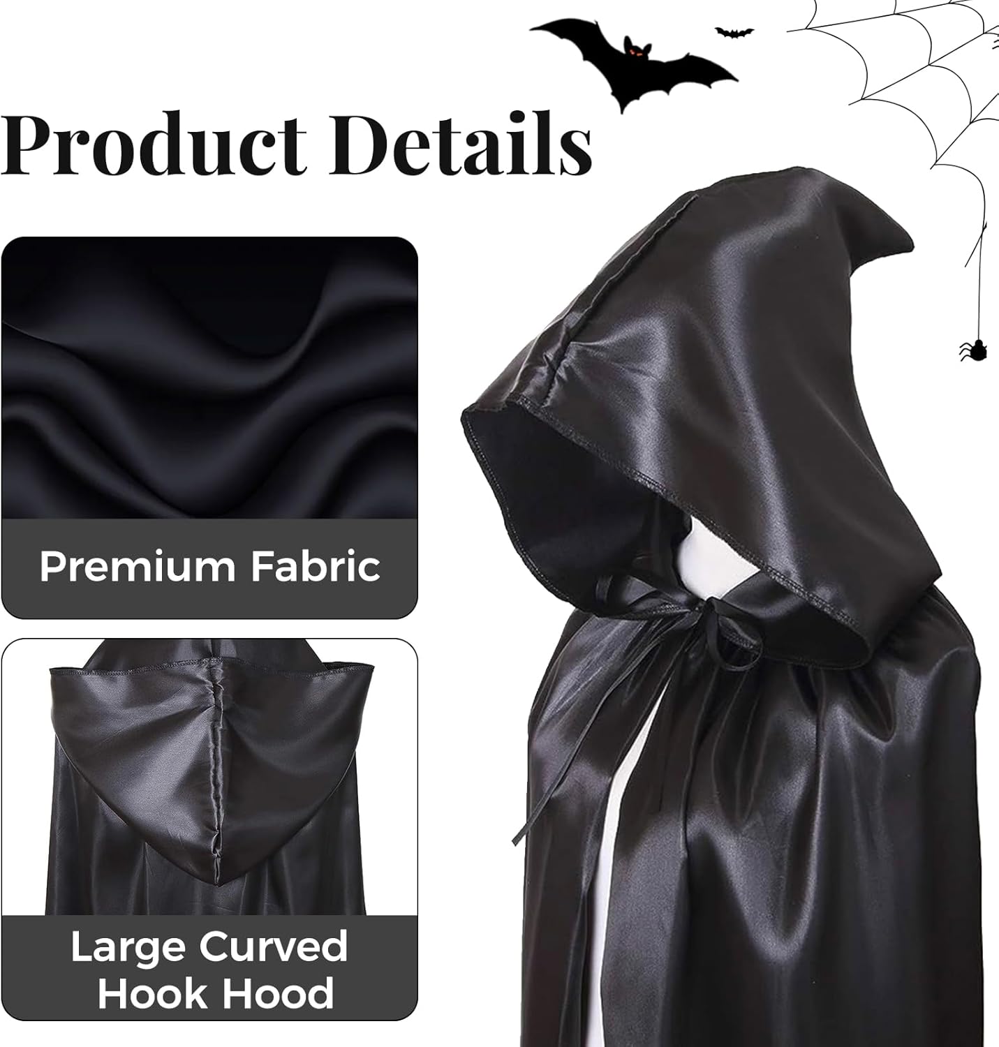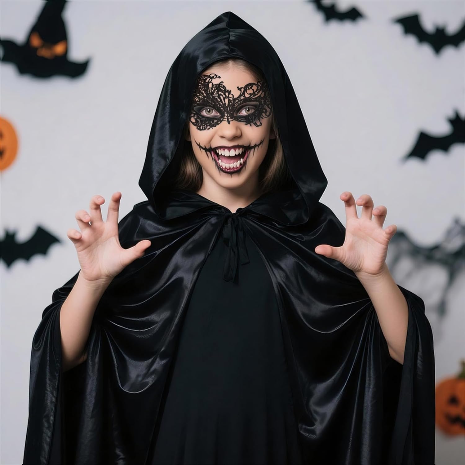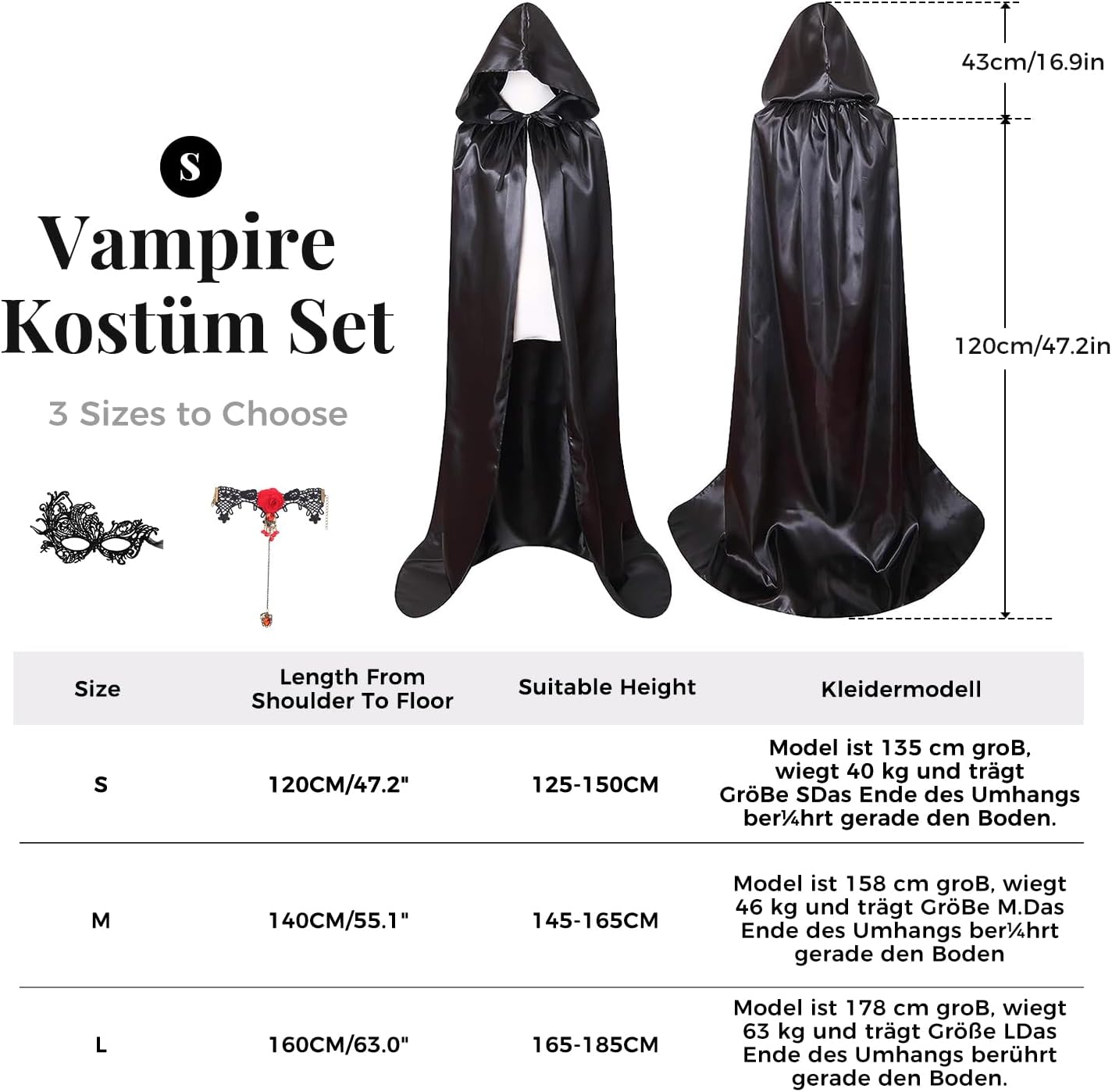 ✔Alta qualità e leggerezza - Il mantello di Halloween è realizzato in un tessuto di raso leggero e di alta qualità.Il tessuto è sottile e piacevole sulla pelle, estremamente lucido, brilla alla luce ✔Capo di Halloween con cappuccio - Halloween Cape Black Caratteristiche chiusura a cravatta e cappuccio,Il cappuccio è abbastanza grande, largo fino al viso, si può facilmente creare un'atmosfera misteriosa e spettrale. ✔3pcs Vampire costume mantello ragazze set - Nero mantello Halloween x 1, maschera veneziana x 1, catena dito gotico x 1, classico mantello nero con accessori vampiro rendere più facile per completare il vostro costume di Halloween! ✔Un'aggiunta perfetta per le idee di costume di Halloween - Le signore del mantello di Halloween davvero molto mutevoli, sia come costume per la morte, Dracula, vampiro, diavolo, mago, costume gotico ....Lasciate che la vostra creatività si scateni, al prossimo carnevale, ad Halloween, potrete ancora ridefinirlo! ✔3 dimensioni tra cui scegliere - Spalla al pavimento lunghezza 120cm/140cm/160cm, larghezza sufficiente, se siete ancora preoccupati per i vostri costumi di Halloween, Winwild 3pcs Halloween mantello set sono la scelta perfetta.