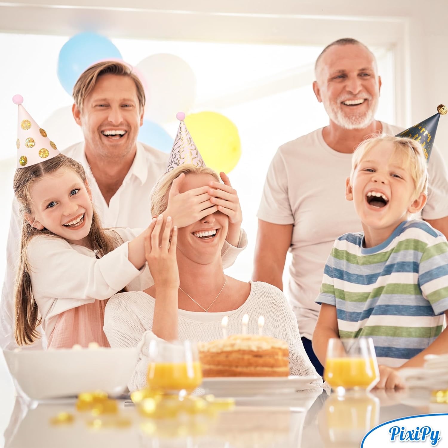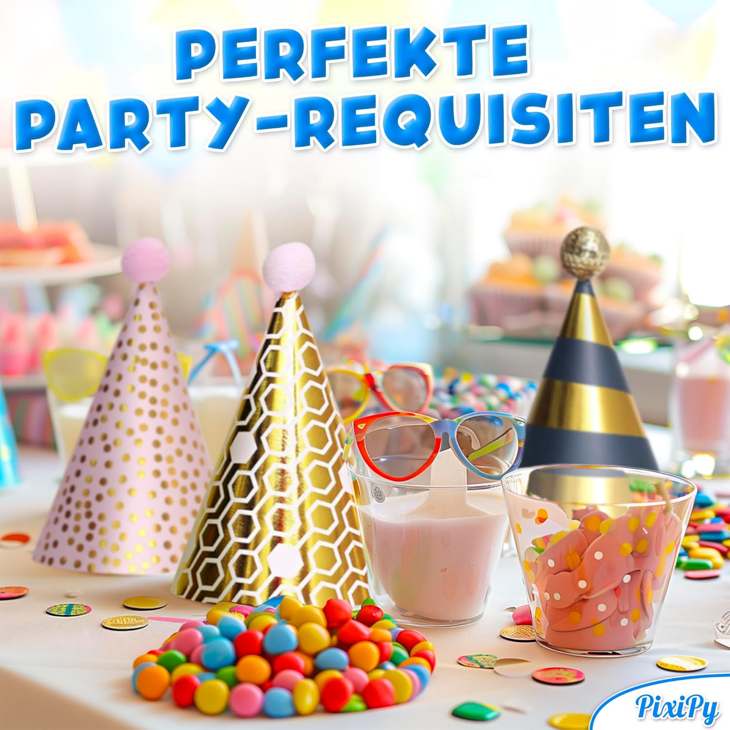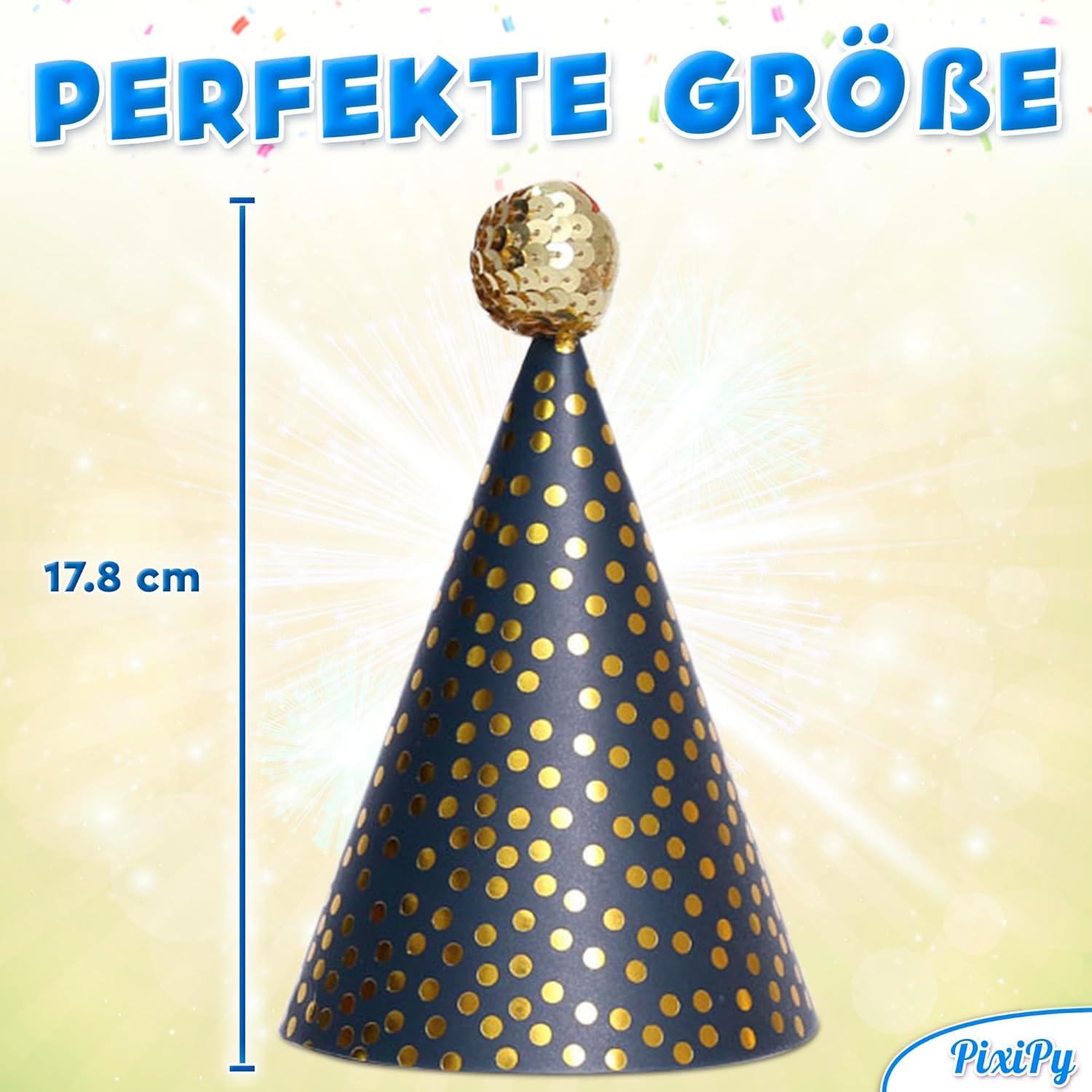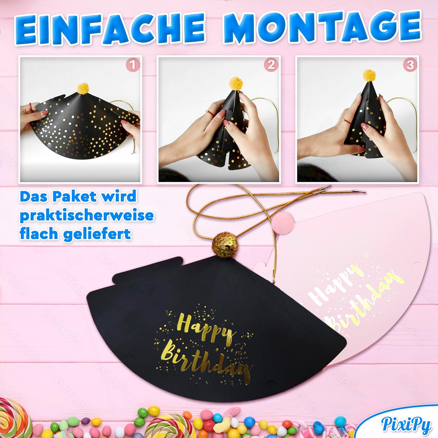 Die Medien konnten nicht geladen werden. The party hats are very pretty, however be prepared to assemble it yourself. It's a little DIY project to attach the pompons to the top of the hat which can be a bit tricky. A glue dot is provided but the pompon has trouble staying at the tip of the hat. Also the hat comes flat and you need to fold it and insert it into a flap. I needed to use tape to hold it into place. The front of the hat looks great, the back, not so much. Finally, you also need to attach the gold elastic to the hat, so to assemble all the hats will take some time.