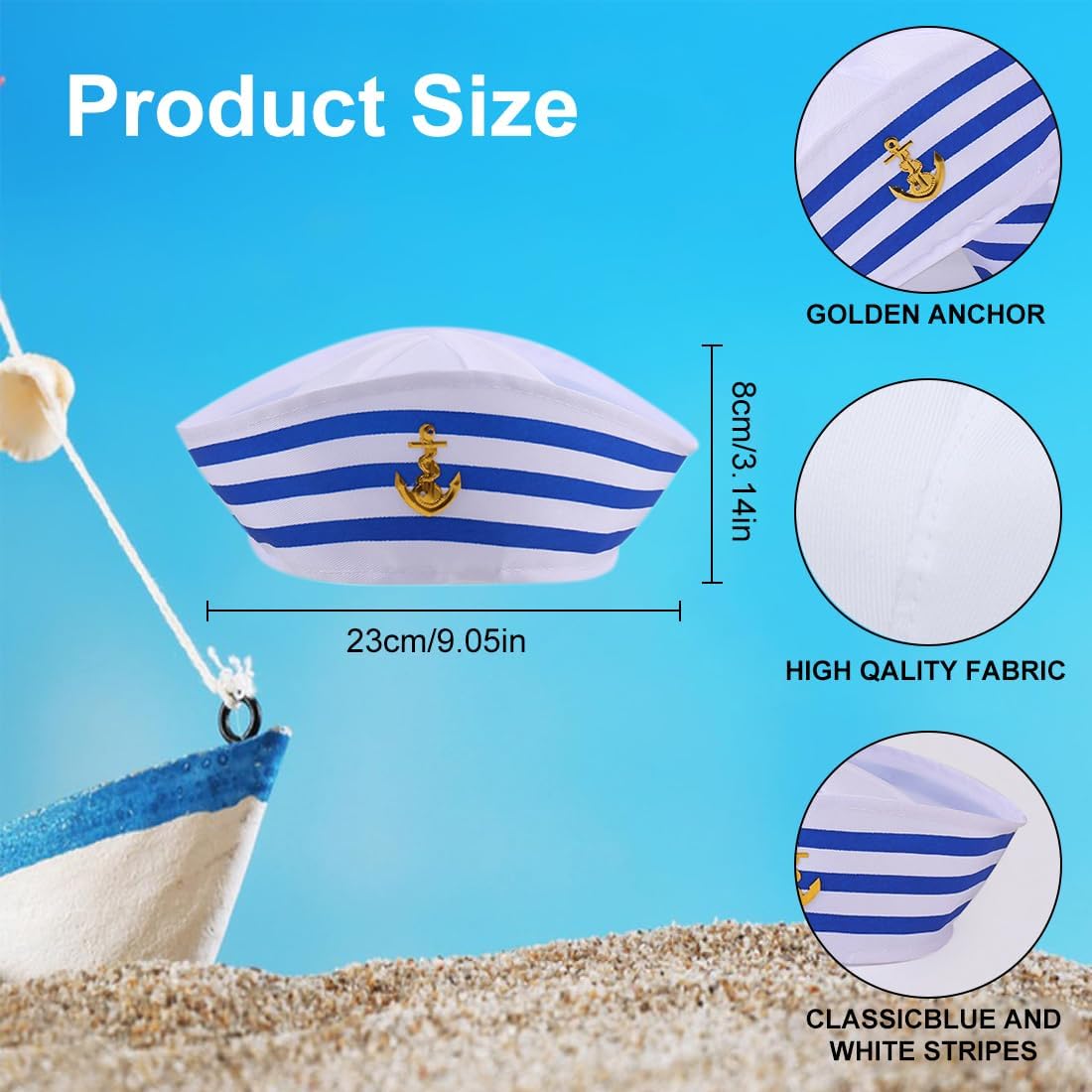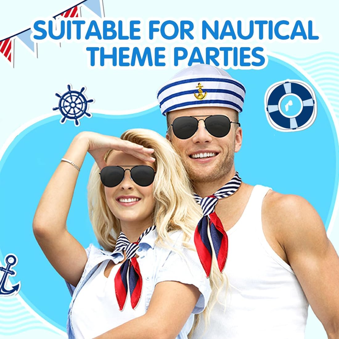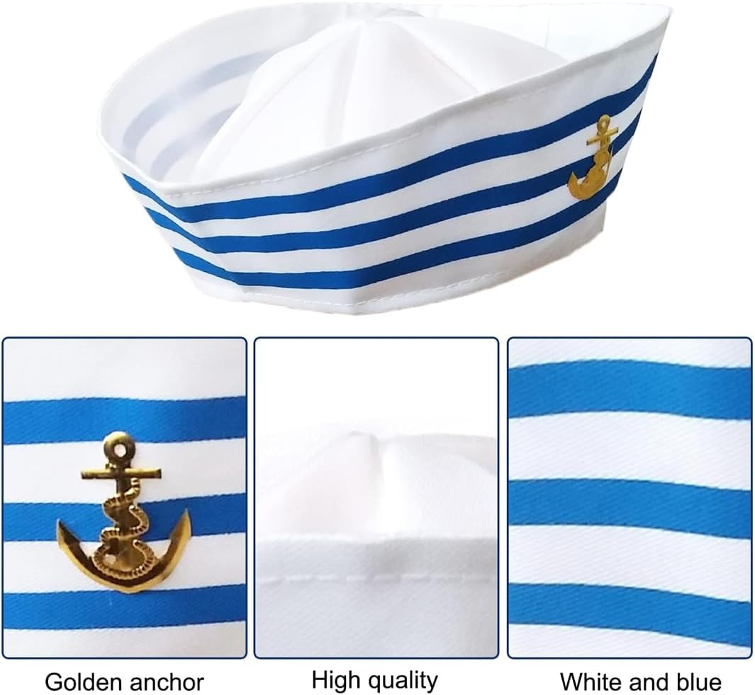 La confezione include: 1 cappello da marinaio e 1 sciarpa in raso blu navy. Trasformati in un elegante marinaio o capitano con questi accessori blu navy e sarai al centro dell'attenzione a qualsiasi festa! Materiale confortevole: Questo berretto da marinaio è realizzato in poliestere e cotone, il che lo rende morbido e confortevole al tatto. La parte anteriore presenta un motivo a barca a vela. Anche la sciarpa è realizzata in poliestere ed è comoda e liscia. Abito da festa: questo abito da marinaio è perfetto per feste in barca, Halloween, crociere, vacanze, battute di pesca, vela, casette da gioco, cosplay, feste in piscina e molto altro. Divertente costume da marinaio: questo costume è un ottimo regalo per una festa per te, gli amici e la famiglia. Questo splendido costume sarà al centro dell'attenzione! Design classico: il cappello da marinaio e i calzini a righe presentano il logo dell'ancora e le classiche strisce blu e bianche per un design impeccabile.