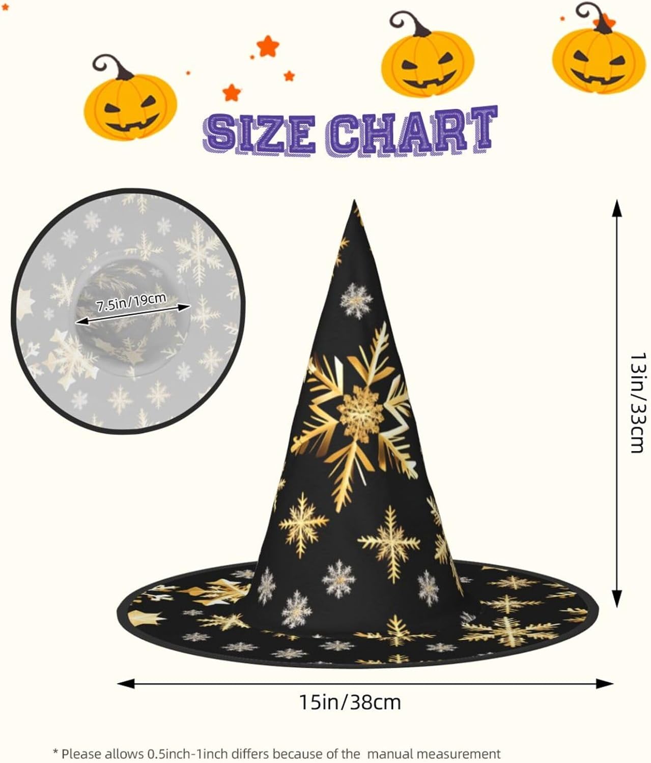 Trasforma la tua festa di Halloween o Carnevale con il nostro cappello da strega di Halloween, progettato per aggiungere stile e divertimento a qualsiasi evento a tema. Alto 33 cm con un diametro esterno impressionante di 38 cm, questo cappello non è solo accattivante ma anche incredibilmente versatile. Realizzato in tessuto Oxford, il cappello offre una vestibilità comoda e una qualità di lunga durata. Il design completamente stampato garantisce che si distingua da qualsiasi folla, mentre la struttura pieghevole consente un facile stoccaggio e trasporto. Che tu stia partecipando a un ballo in maschera, a un evento cosplay o decorando la tua casa per le vacanze, questo cappello da strega sarà l'accessorio. Le dimensioni generose e le funzionalità regolabili lo rendono adatto a un'ampia gamma di utenti, garantendo che tutti possano godere del suo fascino. Aggiungi un tocco di fantasia al tuo outfit o usalo come pezzo decorativo per l'arredamento delle tue vacanze. Migliora la tua esperienza di festa e diventa il centro dell'attenzione con questo fantastico cappello da strega del carnevale di Halloween