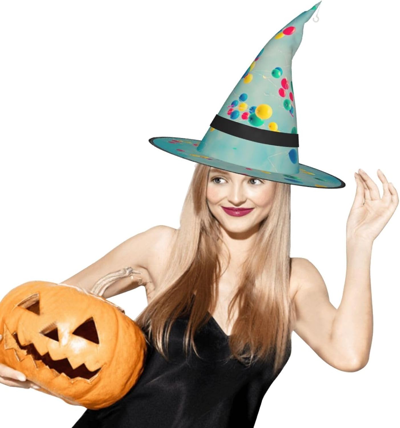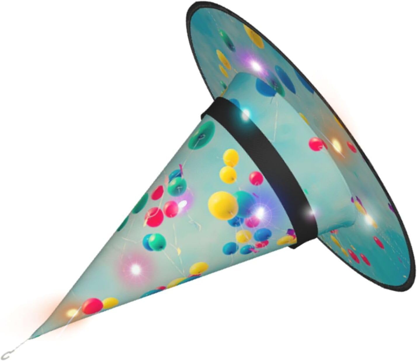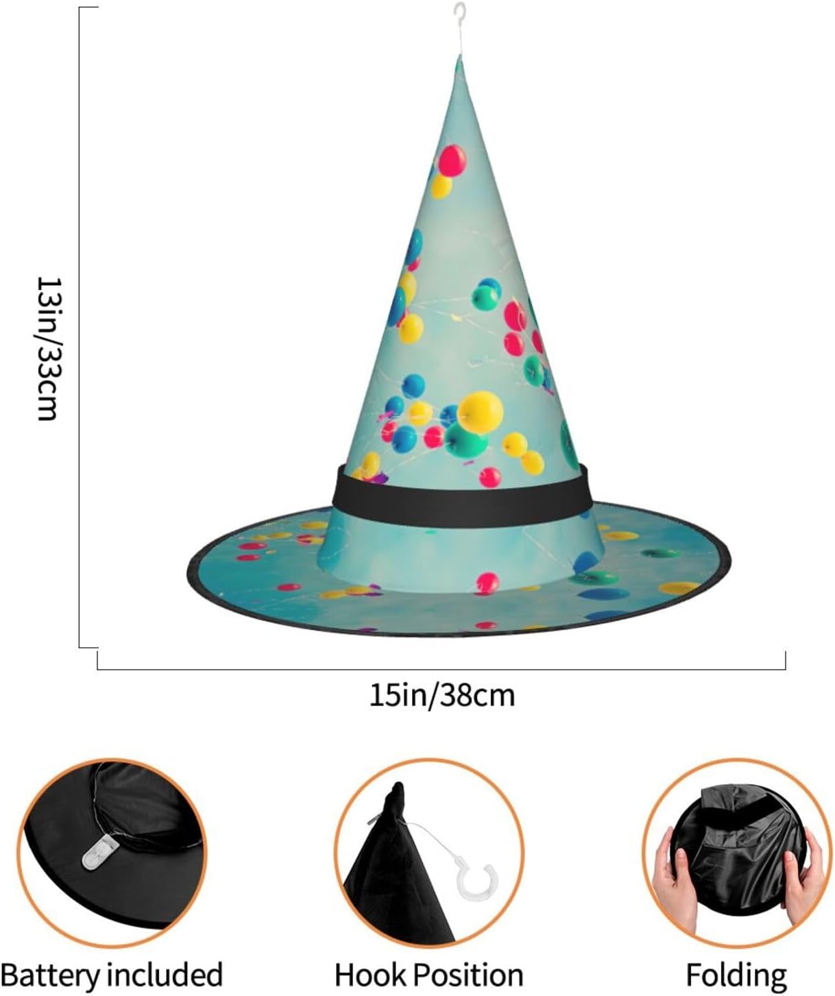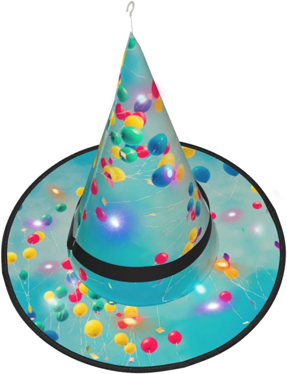 Palloncini colorati Blue Sky Aggiungi un tocco stravagante al tuo costume con il nostro incantevole cappello da strega, l'accessorio perfetto per una varietà di eventi festivi e divertenti. Presenta un accattivante design a stampa completa ed è realizzata in morbido tessuto Oxford resistente. Design intelligente, la parte superiore del cappello può essere ridotta e la tesa attorcigliata e piegata per risparmiare spazio, rendendolo portatile e facile da trasportare. Una delle sue caratteristiche distintive è la stringa luminosa interna a LED che si illumina per creare un'atmosfera magica. Comodamente, il cappello può anche essere appeso come decorazione utilizzando il gancio sulla parte superiore. Indossa questo affascinante cappello da strega alla tua prossima festa, carnevale o evento di Halloween e diventa il centro di attrazione. Nonostante le sue grandi dimensioni, è leggero, il che lo rende comodo da indossare o trasportare senza sentirsi appesantito. Rendi le tue occasioni speciali con il nostro incantevole cappello da strega!