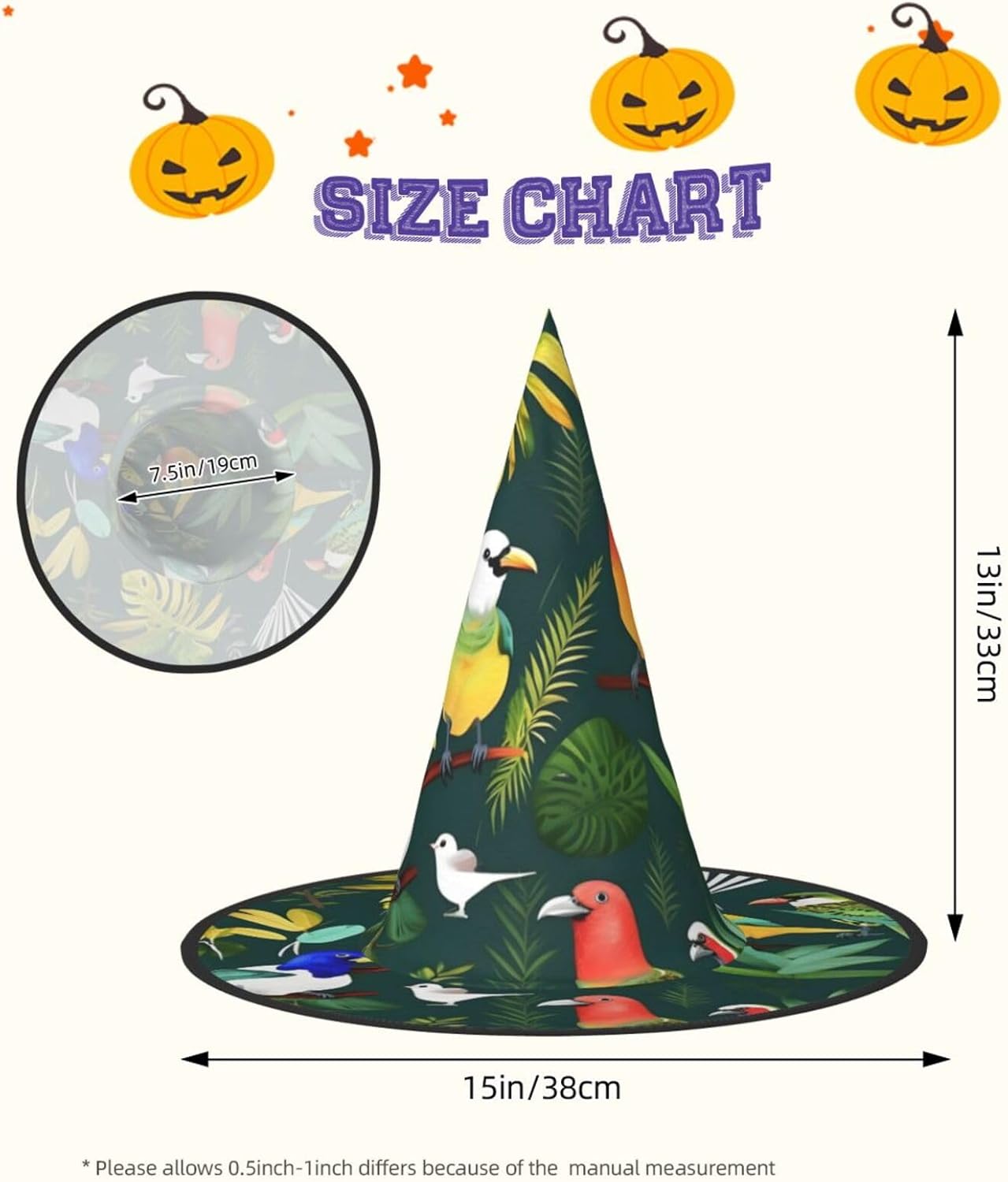 Realizzati in tessuto Oxford superiore, i nostri cappelli con stampa di uccelli tropicali e foglie di piante garantiscono durata e longevità. Il design unico consente di ridurre al minimo la parte superiore del cappello e i bordi di essere attorcigliati e piegati, rendendo i cappelli salvaspazio e facilmente portatili. Ogni cappello con stampa di uccelli tropicali e foglie di piante è di dimensioni generose per adattarsi alla maggior parte delle persone ed è leggero per un uso confortevole. Si prega di leggere la tabella delle taglie prima di effettuare l'ordine. Il design versatile dei nostri cappelli da strega di Halloween con stampa di uccelli tropicali e foglie di piante li rende perfetti per varie occasioni. Sono lavabili in lavatrice e ad asciugatura rapida per una facile manutenzione.