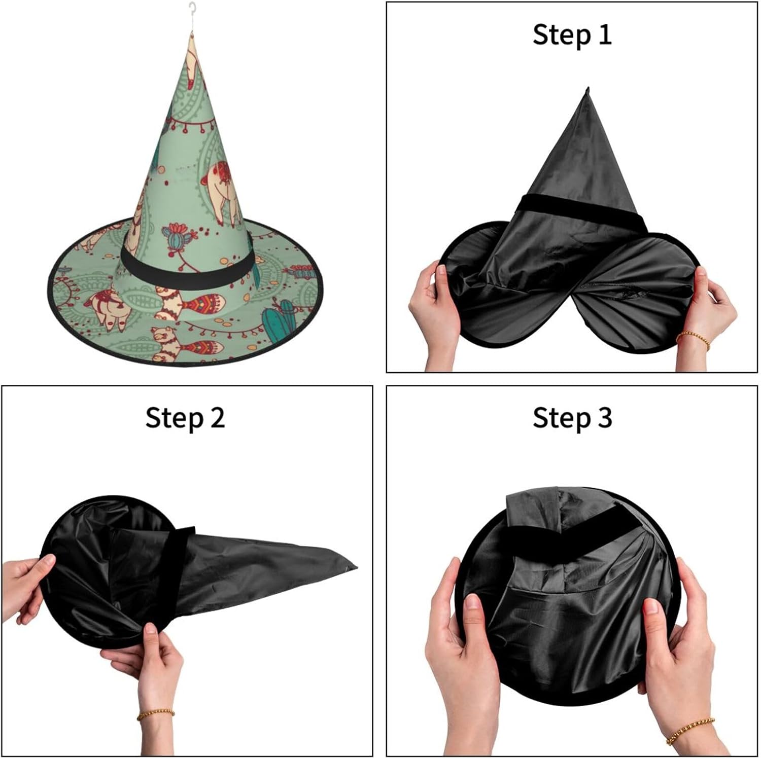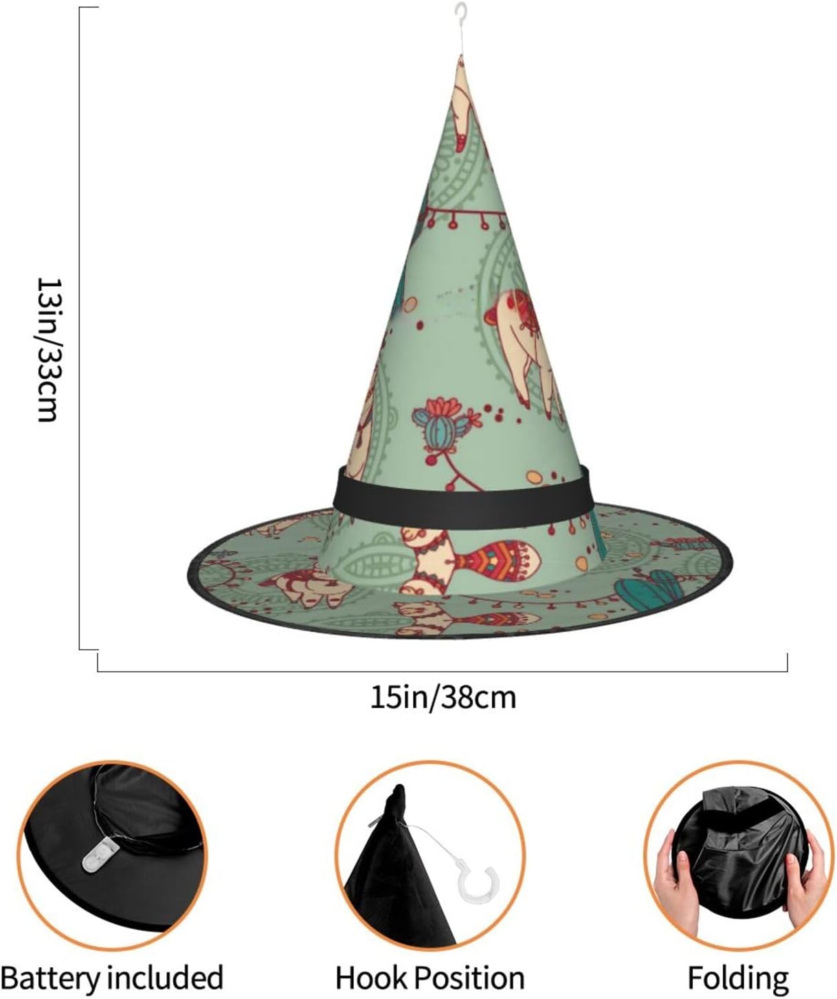 Llamas Aggiungi un tocco stravagante al tuo costume con il nostro incantevole cappello da strega, l'accessorio perfetto per una varietà di eventi festivi e divertenti. Presenta un accattivante design a stampa completa ed è realizzata in morbido tessuto Oxford resistente. Design intelligente, la parte superiore del cappello può essere ridotta e la tesa attorcigliata e piegata per risparmiare spazio, rendendolo portatile e facile da trasportare. Una delle sue caratteristiche distintive è la stringa luminosa interna a LED che si illumina per creare un'atmosfera magica. Comodamente, il cappello può anche essere appeso come decorazione utilizzando il gancio sulla parte superiore. Indossa questo affascinante cappello da strega alla tua prossima festa, carnevale o evento di Halloween e diventa il centro di attrazione. Nonostante le sue grandi dimensioni, è leggero, il che lo rende comodo da indossare o trasportare senza sentirsi appesantito. Rendi le tue occasioni speciali con il nostro incantevole cappello da strega!