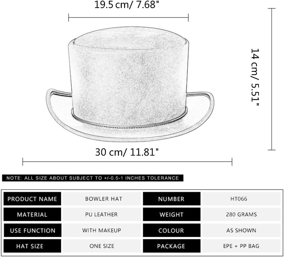 Caratteristiche: Distinguiti dalla massa con il nostro classico ed elegante cappello a cilindro da mago in poliuretano. Perfetto per aggiungere un tocco di raffinatezza e mistero ai tuoi gusti. Realizzati con attenzione ai dettagli, i nostri cappelli presentano design accattivanti come corone alte e tese larghe, assicurandoti di avere un impatto visivo ovunque tu vada. Adatto ad adulti che apprezzano la moda e vogliono distinguersi dalla massa. I nostri cappelli sono pensati per chi apprezza l'eleganza e la personalità. Che si tratti di una festa a tema, di spettacoli teatrali o di attività artistiche, i nostri cappelli sono la scelta perfetta per mettere in risalto il tuo carattere e creare una performance scenica accattivante. Migliora il tuo stile quotidiano con il nostro cappello versatile che può essere abbinato a vari abiti, permettendoti di esprimere la tua personalità unica e la tua sicurezza per strada o in incontri sociali. Caratteristiche: Materiale: poliuretano. Dimensioni: circa 30 x 14 cm. Colore: nero, marrone. Nota: 1. Si prega di consentire un errore di 1-2 cm dovuto alla misurazione manuale. Assicurati che non ti dispiaccia prima di ordinare. Il colore dell'articolo può variare dalla foto a seconda delle impostazioni di visualizzazione e luminosità del computer. Contenuto: 1 cappello a cilindro da mago in poliuretano