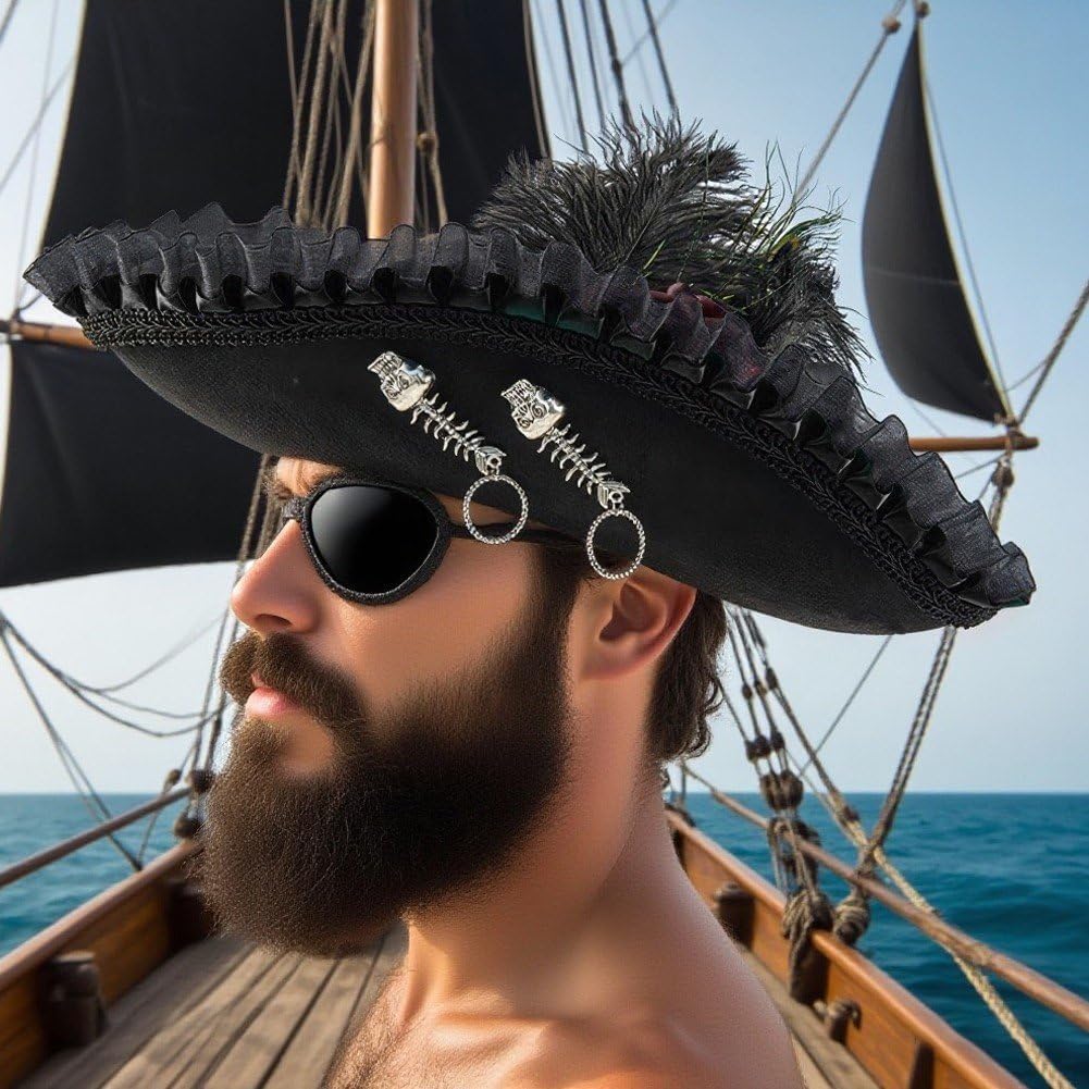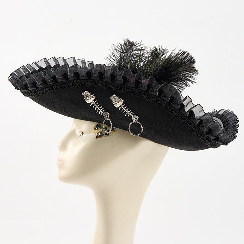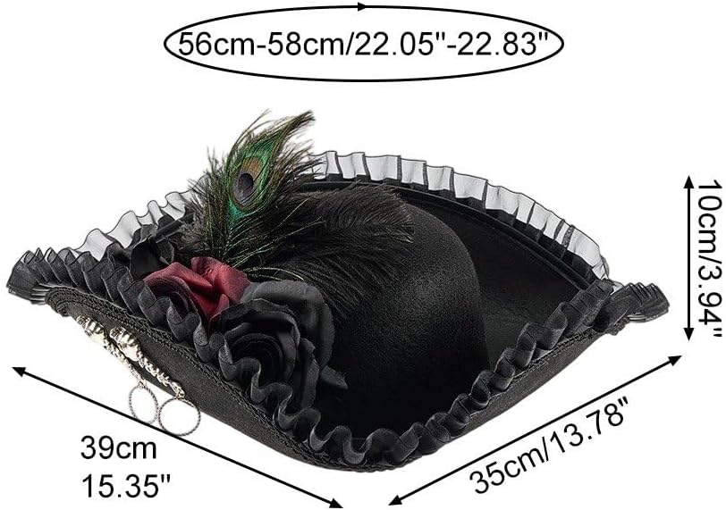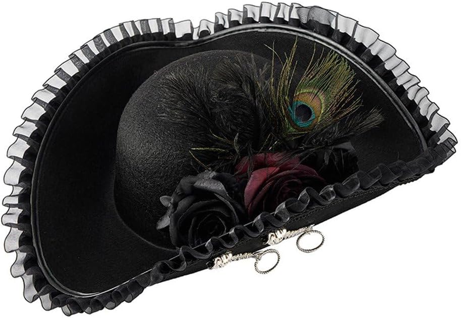 COSTUME ESSENZIALE: tradizionale design a tricorno con abbellimenti contemporanei, adatto per costumi per adulti e sfilate di moda storiche DESIGN AUTENTICO: cappello da pirata tricorno nero con eleganti finiture a volant, rose decorative e un lussuoso accento di piume di pavone per uno stile sofisticato di costumi ACCESSORIO VERSATILE: perfetto per costumi da pirata, rievocazioni storiche, produzioni teatrali, feste in costume ed eventi a tema Era coloniale MATERIALI PREMIUM: realizzati in tessuto nero di alta qualità, finiture arricciate dettagliate e accessori decorati color argento per un autentico look vintage DETTAGLI DECORATIVI: Decorato con rose in tessuto, ornamenti metallici e un'accattivante piuma di pavone che aggiunge un tocco drammatico alla classica silhouette del tricorno