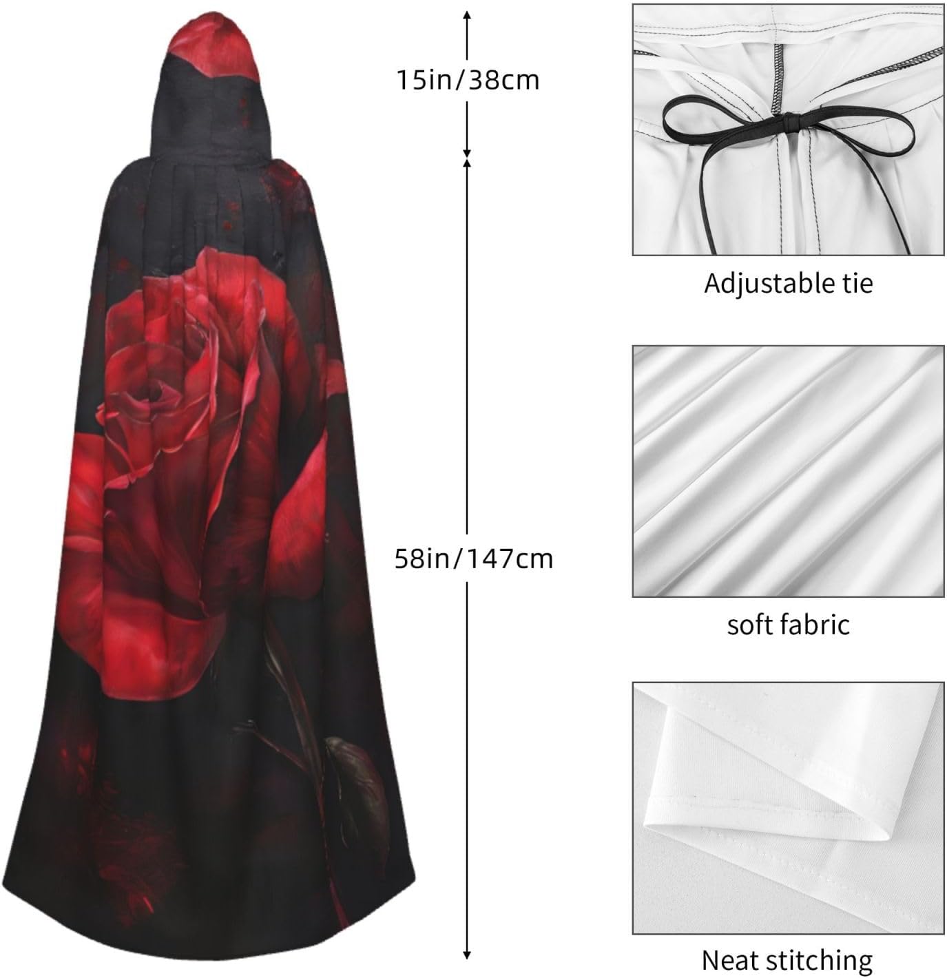 Il design senza cerniera, abbinato a un grande mantello con cappuccio e cravatta al collo, migliora il tuo mistero mantenendoti comodo con il suo tessuto non prurito. Con una lunghezza di 147 cm, larghezza di 154 cm e un'altezza del cappuccio di 38 cm, il nostro mantello con cappuccio con stampa di rose rosse offre una copertura completa, assicurandoti di distinguerti in ogni occasione. Vari eventi come Halloween, cosplay, costumi da palcoscenico, feste a tema, balli, convegni di fumetti e molto altro ancora, il nostro mantello è versatile e conveniente. Facile da mantenere e di lunga durata, il nostro mantello con cappuccio con stampa rosa rossa è lavabile in lavatrice e lavabile a mano. Con un design neutro, il nostro mantello è perfetto per uomini e donne.