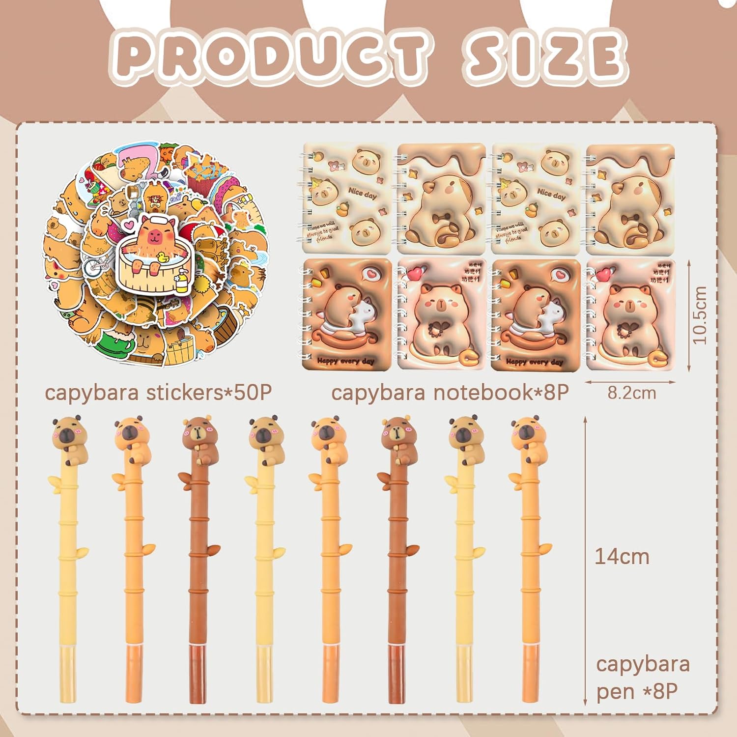 Set di cancelleria Capybara: il set regalo Capybara contiene: 8 mini quaderni Capybara, 8 penne gel Cartoon Capybara e 50 adesivi Capybara per bambini, 66 pezzi in totale. QUALITÀ PREMIUM: le penne unisex sono prodotte secondo rigorosi standard di qualità per garantire prestazioni affidabili e una lunga durata. I mini quaderni e gli adesivi a spirale sono realizzati in carta di alta qualità, atossica e inodore, con scrittura fluida e adesione antitraccia Design unico di Capybara: le bomboniere per bambini sono realizzate con elementi Capybara vivaci e carini, il design realistico e unico dei cartoni animati può attirare rapidamente l'attenzione dei bambini, amato dai bambini e dai fan di Capybara Ampi usi: questo set regalo con cartoni animati di animali è un regalo ideale per gli studenti, i bambini e gli impiegati in ufficio, o come ricompensa per realizzazioni o occasioni speciali Cadeau parfait: il kit di carta da parati con animali da disegno animato è disponibile con un libro e uno stilo, e adesivi autoadesivi di dessin animato per bambini, un cadeau parfait per i compagni di classe, gli amici e la famiglia