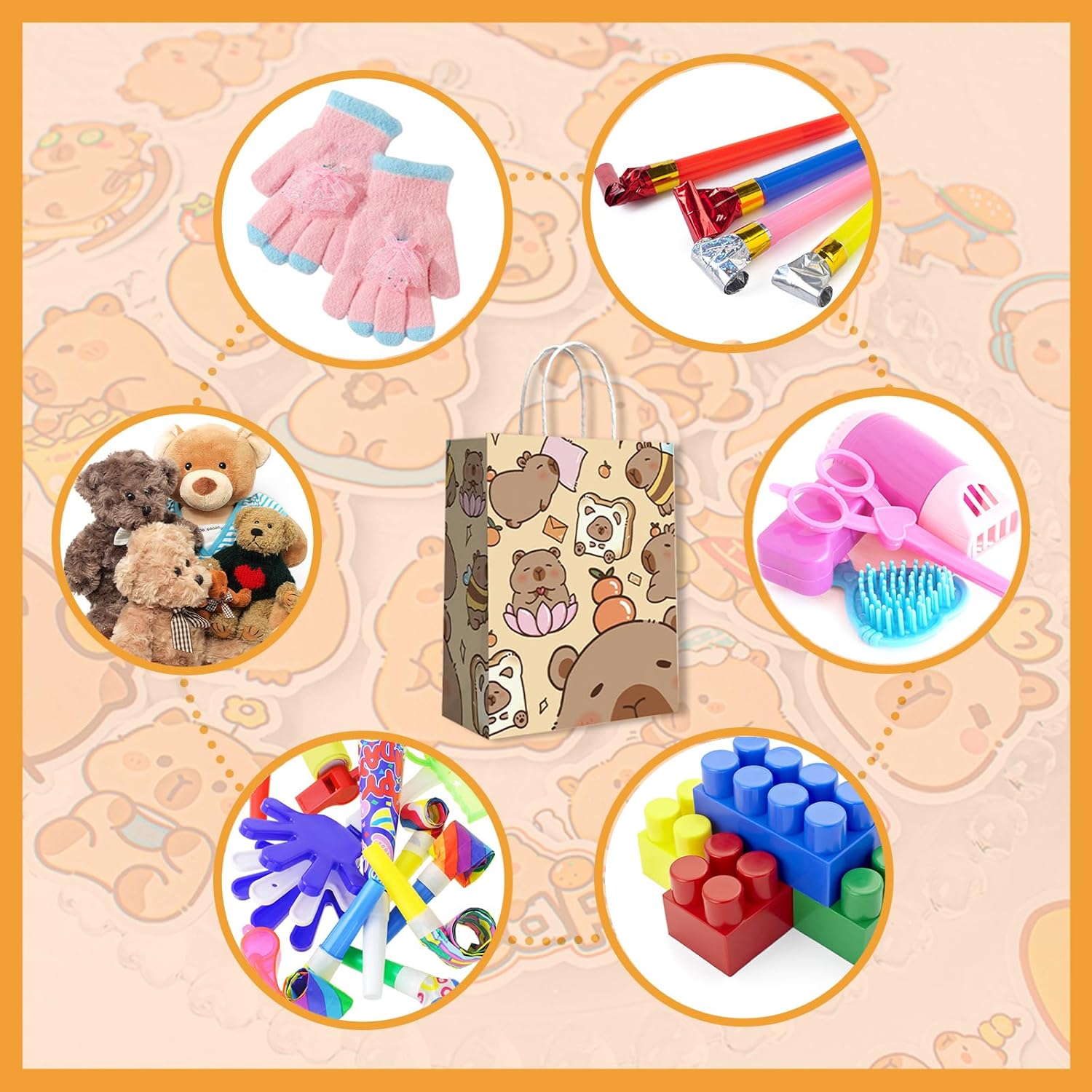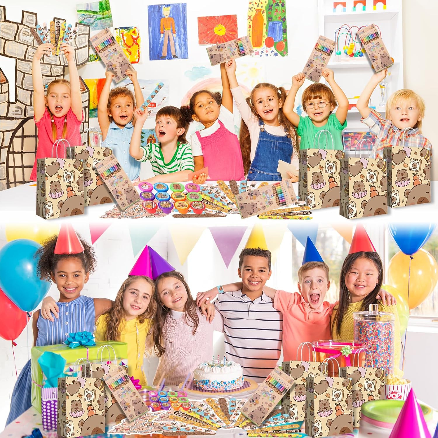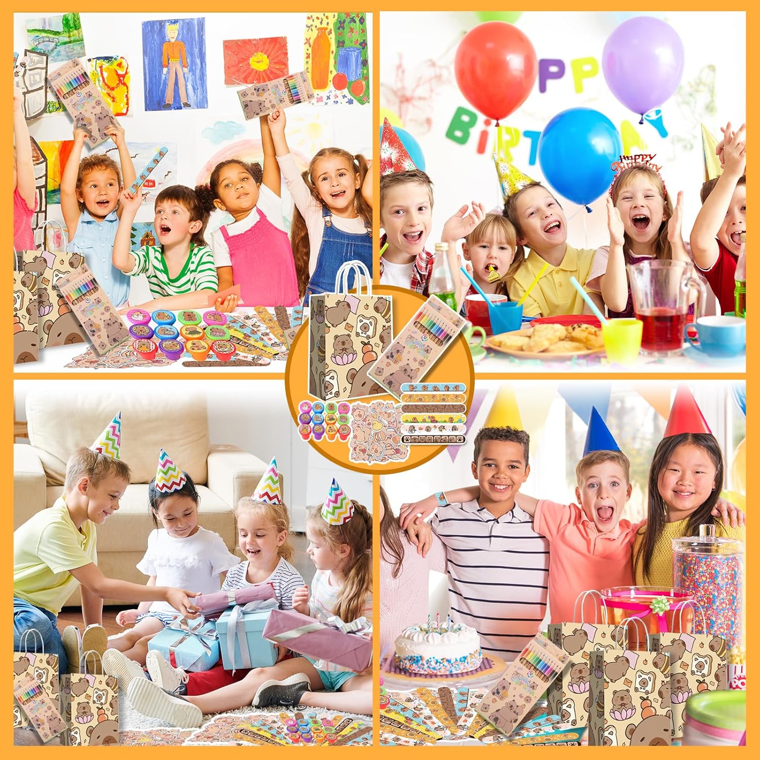 Set di regalini Capybara: questo set di 98 pezzi Capybara per feste di compleanno per bambini contiene tutto ciò di cui hai bisogno per una festa di compleanno per bambini di successo. Capybara Party Mitgebsel Con 12 sacchetti regalo, 12 matite colorate, 12 braccialetti Slap, 12 pratici timbri e 50 simpatici adesivi Capybara, ogni festa sarà un punto forte Alta qualità: i nostri kit di accessori per feste Capybara scelgono rigorosamente materiali di alta qualità. Adesivi Capybara, i sacchetti regalo sono realizzati in carta spessa di alta qualità, con colori vivaci. Il bracciale Capybara può essere indossato solo con un leggero colpo al polso ed essere durevole. Le borse regalo Capybara sono ampiamente utilizzate, resistenti e non hanno un odore pungente. Questo regalo per bambini può essere riutilizzato Design raffinato: le decorazioni per il compleanno di Capybara sono molto popolari tra i bambini, per aggiungere un paio di punti salienti al vostro evento a tema Capybara Borsa regalo a tema Capybara: puoi mettere caramelle, cioccolato, snack, bracciali, portachiavi, adesivi, ecc. nella busta regalo per trasformarli in una scatola cieca a sorpresa, e tornare a casa alla fine della festa con il sacchetto regalo pieno di regali, sarà la festa più indimenticabile per i bambini Decorazione per compleanno Capybara: sorprendi i tuoi piccoli ospiti con questi regali unici! Sia come ringraziamento per gli ospiti di compleanno o come piccola sorpresa, questo set garantisce volti luminosi e momenti indimenticabili. Rendi ogni festa un'esperienza speciale con questo affascinante regalo Capybara, perfetto regalo per feste Capybara