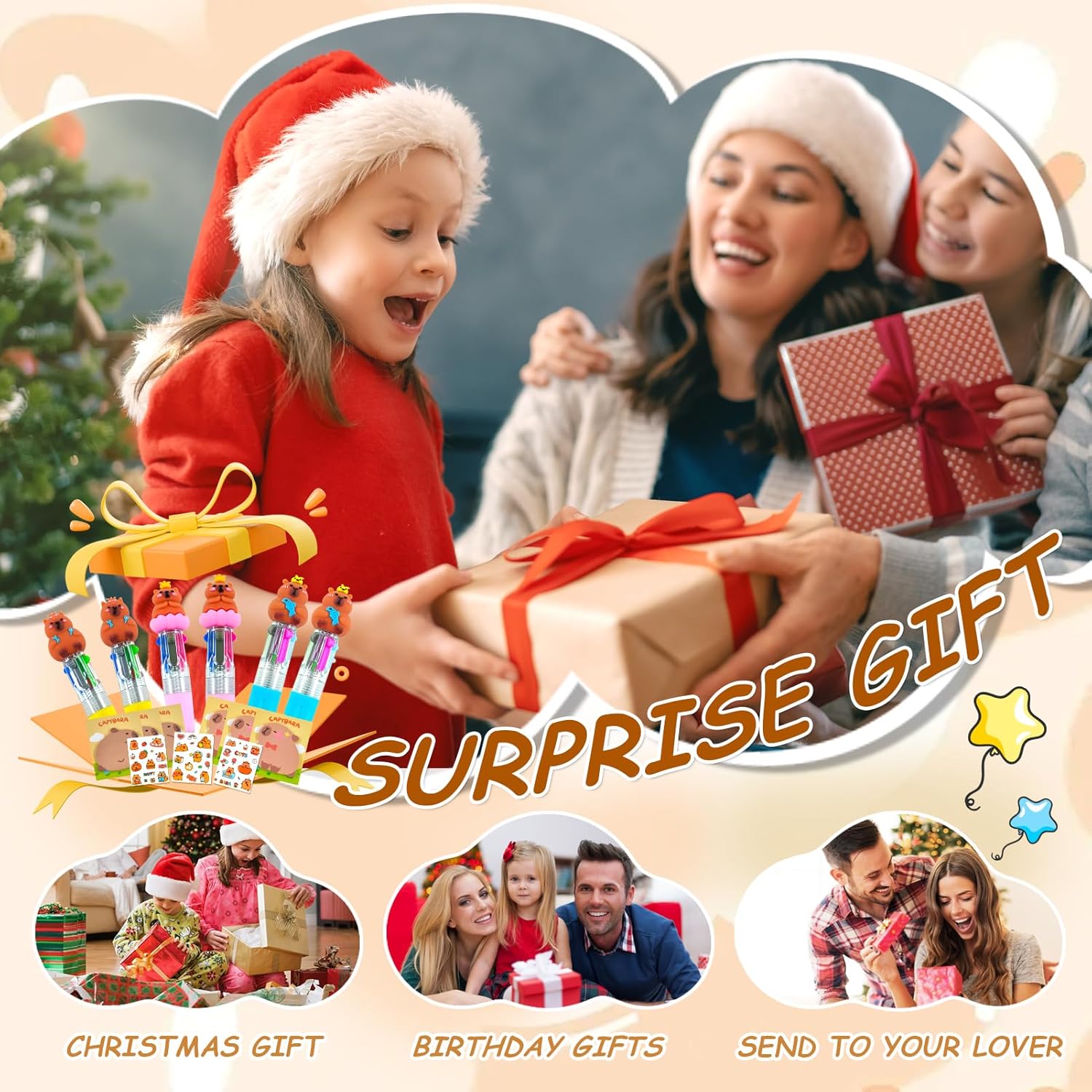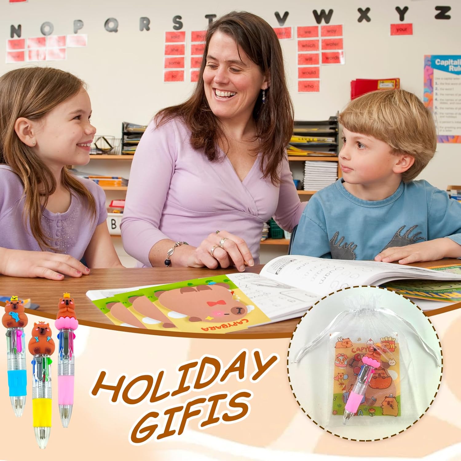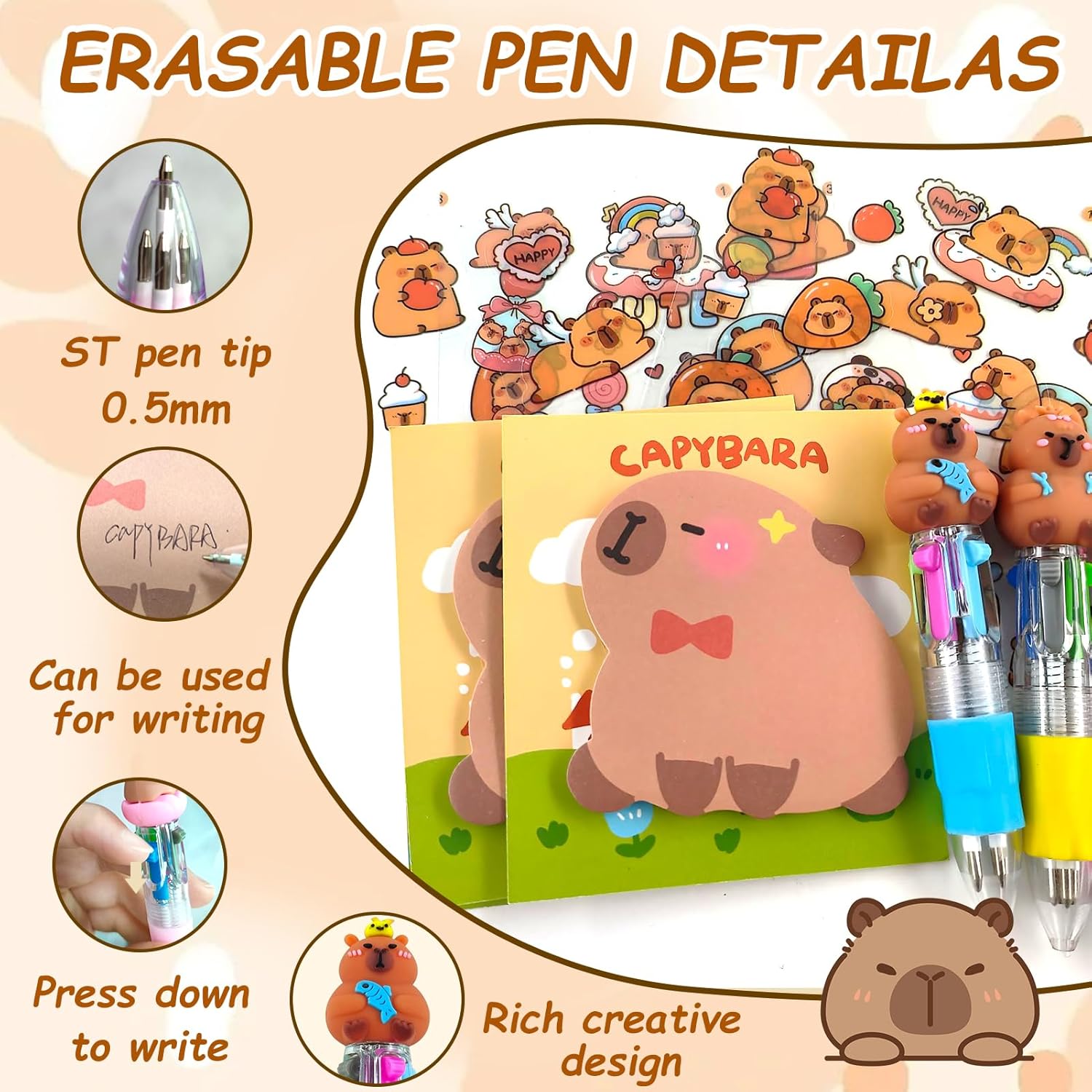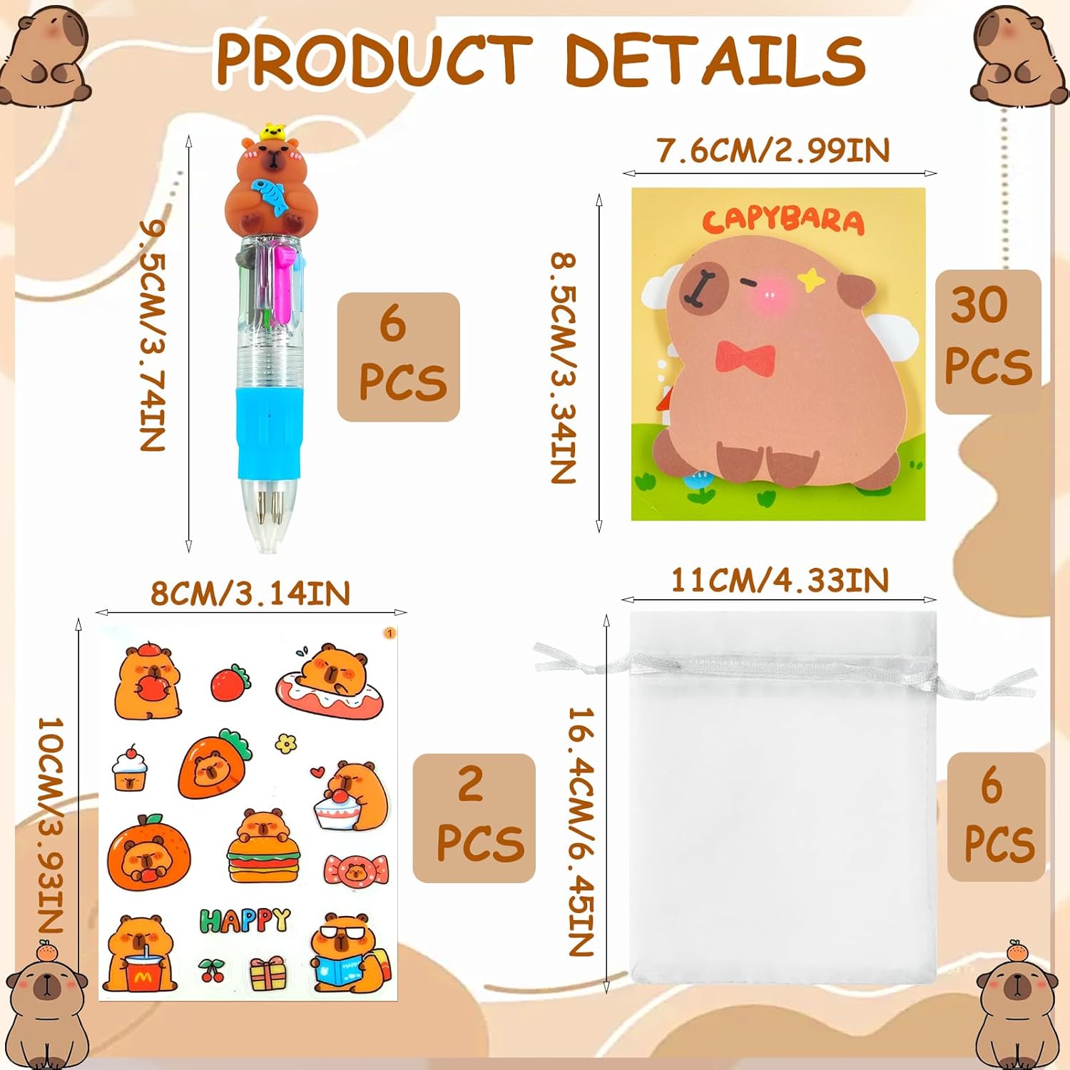 【Set di penne multicolor Capibara】La cancelleria a tema Capibara rende l'apprendimento divertente! Il set di penne Capibara contiene 6 mini penne a sfera 4 in 1, 6 post-it a forma di Capibara, 6 adesivi Capibara con 6 sacchetti di garza trasparenti. Perfetto come regalo per feste di compleanno Capibara, regali per la scuola, ecc. 【Penna multicolore】Penna a sfera 4 in 1 con colori diversi e carini, abbastanza per essere condivisa con gli amici, maschi o femmine, puoi farla piacere ai tuoi amici. Passa da un colore all'altro, facile da contrassegnare o crea una combinazione degna della tua immaginazione. 【Regalo per feste Capibara】La cancelleria per studenti contiene graziosi elementi Capibara. Con un sacchetto di garza, è facile da assemblare come regalo per gli ospiti o come regalo per la classe. Perfetto per feste Capibara e regali di compleanno per bambini. È un must per studenti e appassionati di Capibara, in modo che i prodotti Capibara siano visibili in qualsiasi momento della vita quotidiana. 【Materiale di alta qualità】Le penne Capibara sono realizzate con materiali di alta qualità, comode e resistenti, e il design a pressione ti consente di non preoccuparti che il cappuccio della penna cada. Gli adesivi Capibara sono impermeabili e facili da applicare, così puoi dare libero sfogo alla tua immaginazione. I post-it possono decorare i tuoi libri o quaderni e permetterti di contrassegnare chiaramente i contenuti importanti. 【Regalo perfetto】I prodotti Capibara non sono adatti solo a bambini, studenti, ragazzi e ragazze, ma anche a persone di tutte le età, come gli adulti. Possono aggiungere atmosfera a qualsiasi occasione, che si tratti di un compleanno, di una lezione o di un momento di divertimento extra.