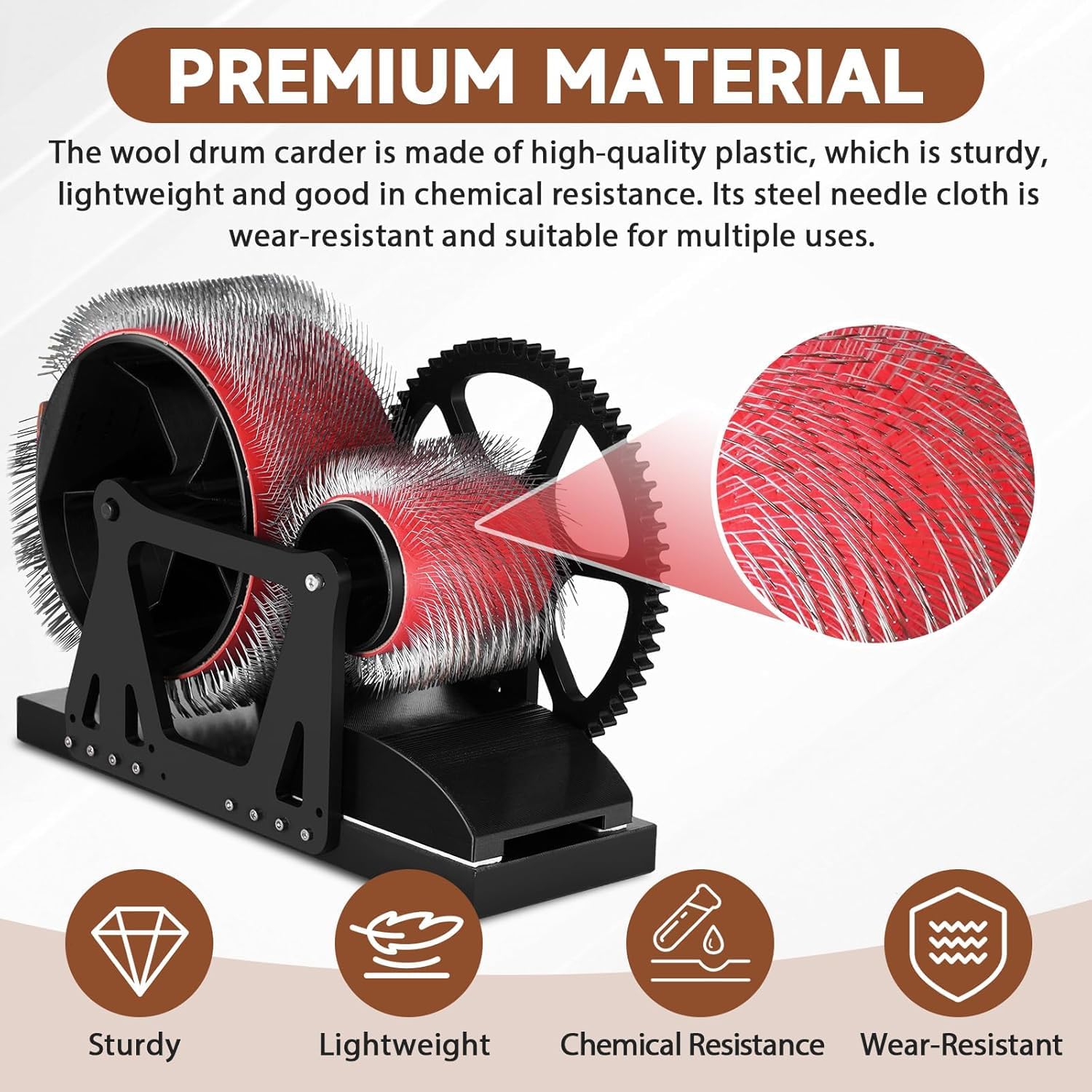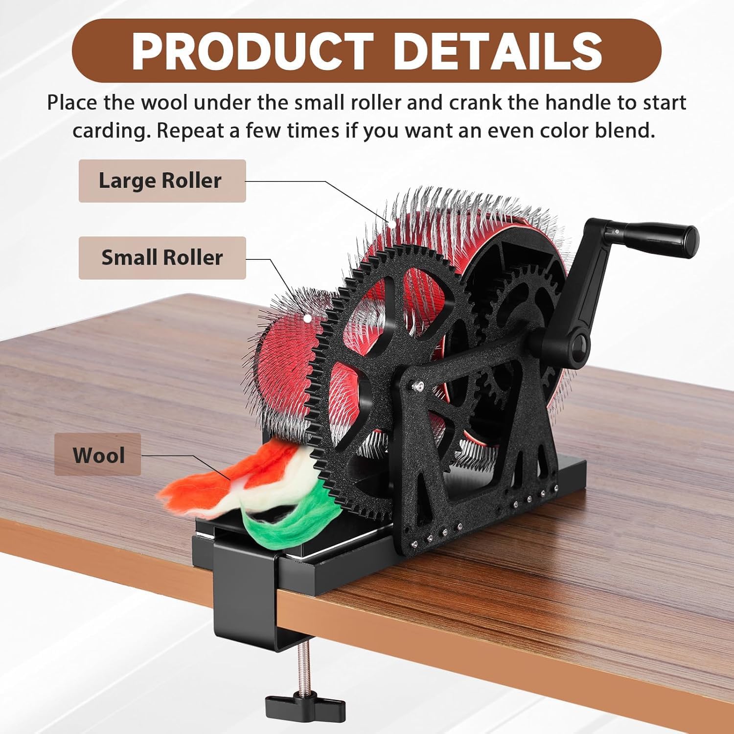 [MATERIALE] Questa macchina pettinatrice a manovella è realizzata con materiali di alta qualità e ha una struttura robusta e durevole. Ha una lunga durata, è una macchina manuale, non richiede elettricità, quindi consente un maggiore risparmio. [FELTRO DI LANA FAI DA TE] Proprio come un artista mescola i pigmenti, questa macchina ti permette di combinare una varietà di colori e fibre di lana per creare texture ricche e dinamiche che impreziosiscono il tuo progetto. [MACCHINA PER FELTRIRE LA LANA MANUALE] Pettina senza sforzo le fibre aggrovigliate in fili dritti e uniformi, rimuovendo le impurità. Mescola fibre di diversi colori o texture senza soluzione di continuità per miscele personalizzate, perfette per progetti di filatura o feltratura. [PETTINATURA EFFICIENTE COLORI VIBRANTI] Le spazzole elastiche garantiscono un funzionamento fluido e rapido. Mescola diversi colori e texture di lana senza soluzione di continuità in pochi minuti, risparmiando tempo e producendo combinazioni vivaci. Progettata per pettinare, filare e preparare le fibre per lavori fai da te o creazioni di animali in feltro. [VERSATILE COMPAGNO DI ARTIGIANATO] Oltre alla lavorazione della lana, puoi dedicarti alla pulizia dei peli degli animali, alla manutenzione degli indumenti o alla creazione di pompon. Il Drum Carder si adatta a diverse attività, rendendolo uno strumento indispensabile per artigiani, filatori e amanti del fai da te.