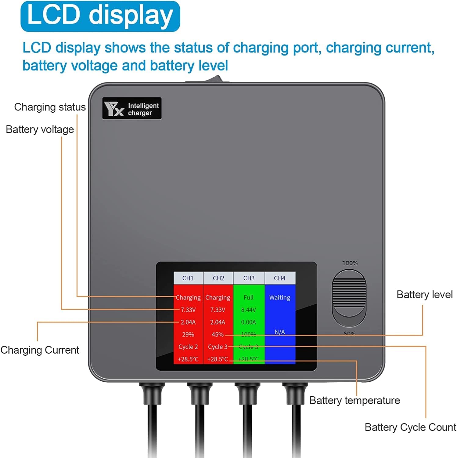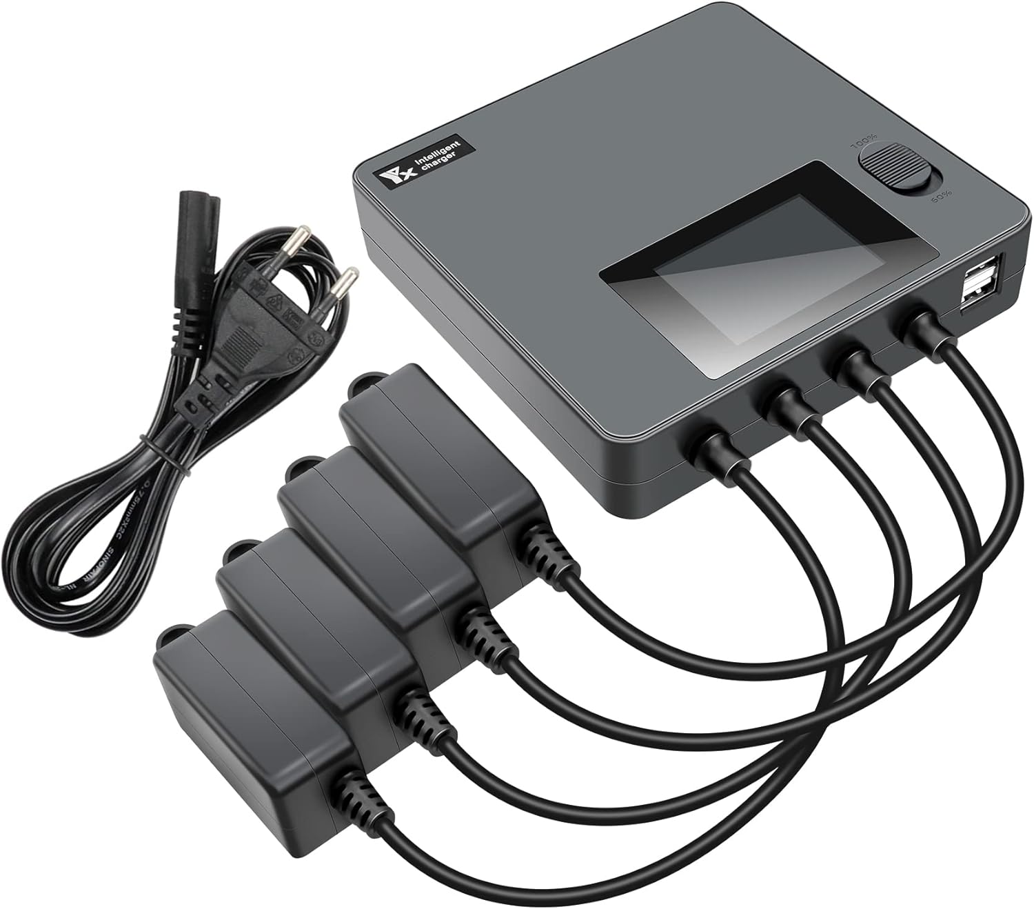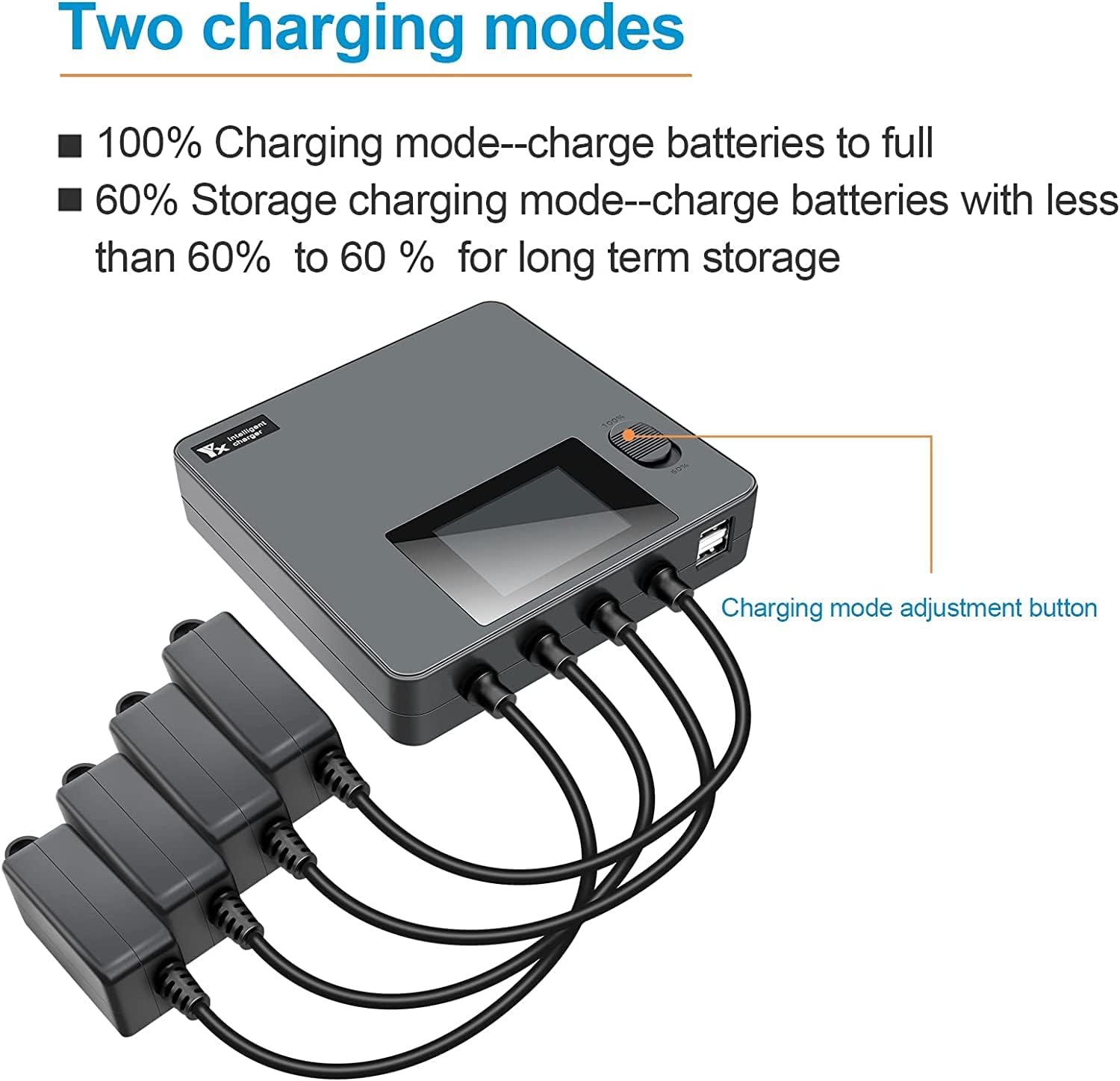 Nota: non compatibile con la batteria Mavic Mini e Mini 2, solo per Dji Mini 3 Pro / Mini 4 / Mini 5. Può caricare 4 batterie (cavo di ricarica incluso), 1 telecomando (cavo USB non incluso) e 1 smartphone contemporaneamente. Tempo di ricarica: quattro batterie sono completamente cariche, 2453 mAh circa 70 minuti, 3850 mAh circa 110 minuti. Ingresso: AC / 110-240V, 50/60Hz Uscita: 8,5 V/8 A (ramo: 8,5 V/2 A); USB: 5 V/3 A. 60% modalità di memoria: le batterie con meno del 60% di carica vengono caricate al 60%. Questo livello di batteria è ideale per la conservazione a lungo termine di batterie scariche. Sicuro da usare: progettato con protezione da sovraccarico, protezione da surriscaldamento, sovracorrente, sovratensione, cortocircuito. Display LCD: il display LCD mostra lo stato della porta di carica, la corrente di carica, la tensione della batteria, il livello della batteria e il numero di cicli della batteria.