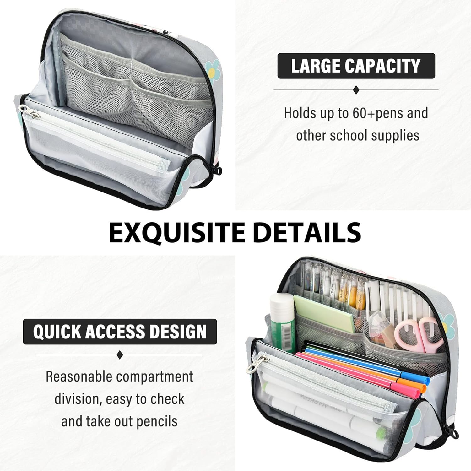 Soluzione intelligente per organizzare la scrivania: non c'è bisogno di scavare in giro: l'astuccio per le donne si alza saldamente quando piegato, mostra chiaramente il contenuto per un'organizzazione più rapida e più facile Materiale affidabile: grazie al suo nylon impermeabile e antigraffio, l'astuccio da ufficio rimane ordinato e intatto, adatto per stili di vita in movimento o studenti attivi Design versatile con scomparti: l'organizer per matite ti aiuta a rimanere organizzato con un interno spazioso con aree distinte per tutti i tuoi articoli di cancelleria, strumenti o cosmetici Ideale per varie impostazioni: utilizza l'astuccio per il trucco per riporre oggetti artistici, oggetti personali o strumenti da ufficio, ideale per studenti, pendolari, artisti o chiunque sia in viaggio Disegnalo a modo tuo: gli astucci per matite per borsa supportano modifiche personalizzate come testo personalizzato o opere d'arte caricate, rendendolo un'idea regalo eccezionale per bambini e adulti creativi