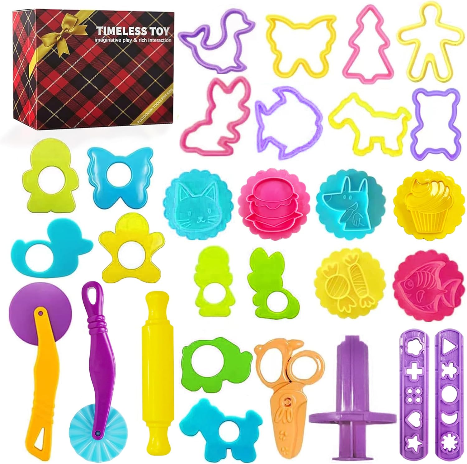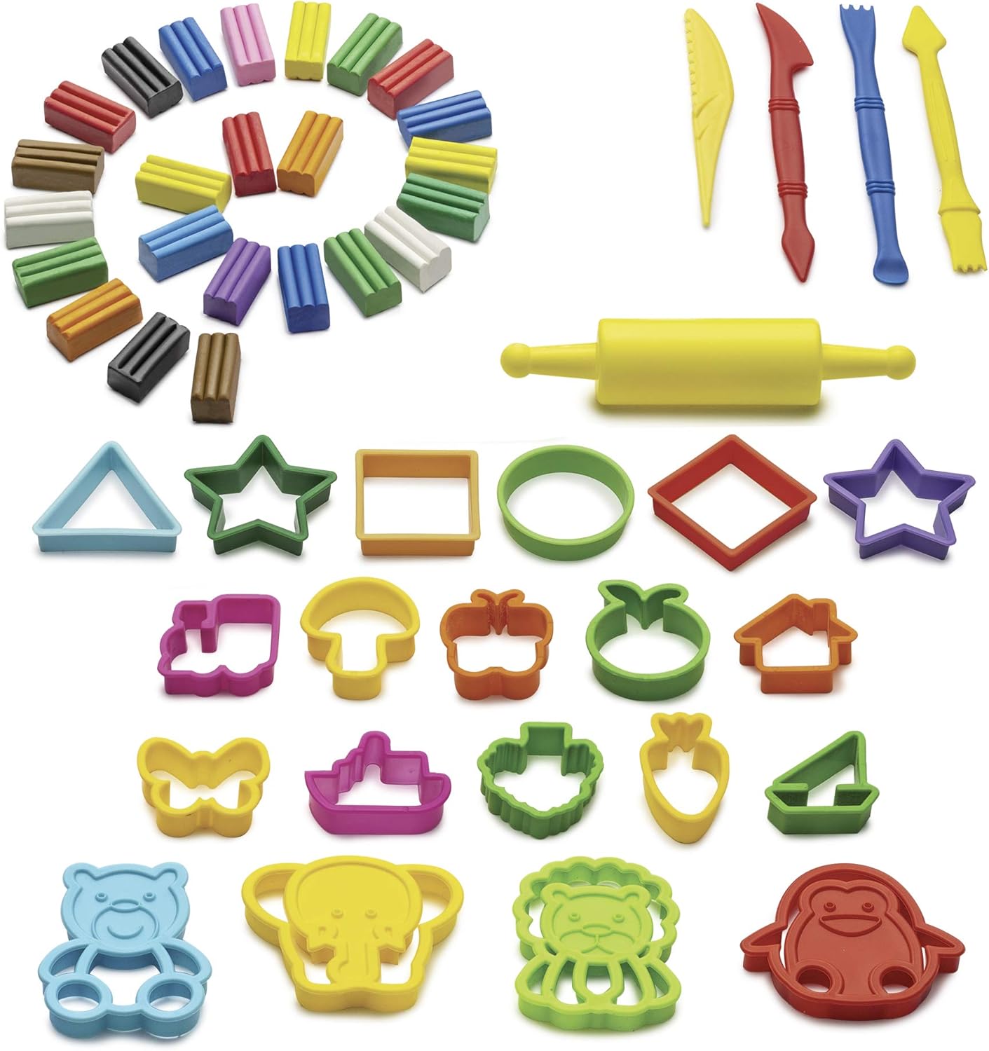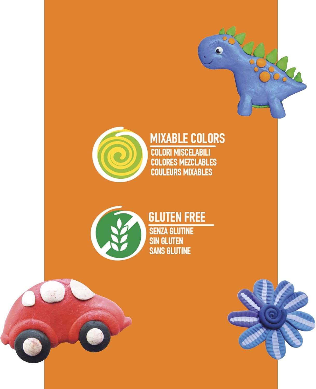 Maxi scatola Plasty con 24 panetti di plastilina e 12 colori differenti, 20 stampini sagomati, 4 spatole e 1 rullo per la modellazione Guida creativa inclusa Colori brillanti e miscelabili tra di loro Senza glutine Non si restringe, può essere utilizzata infinite volte!
