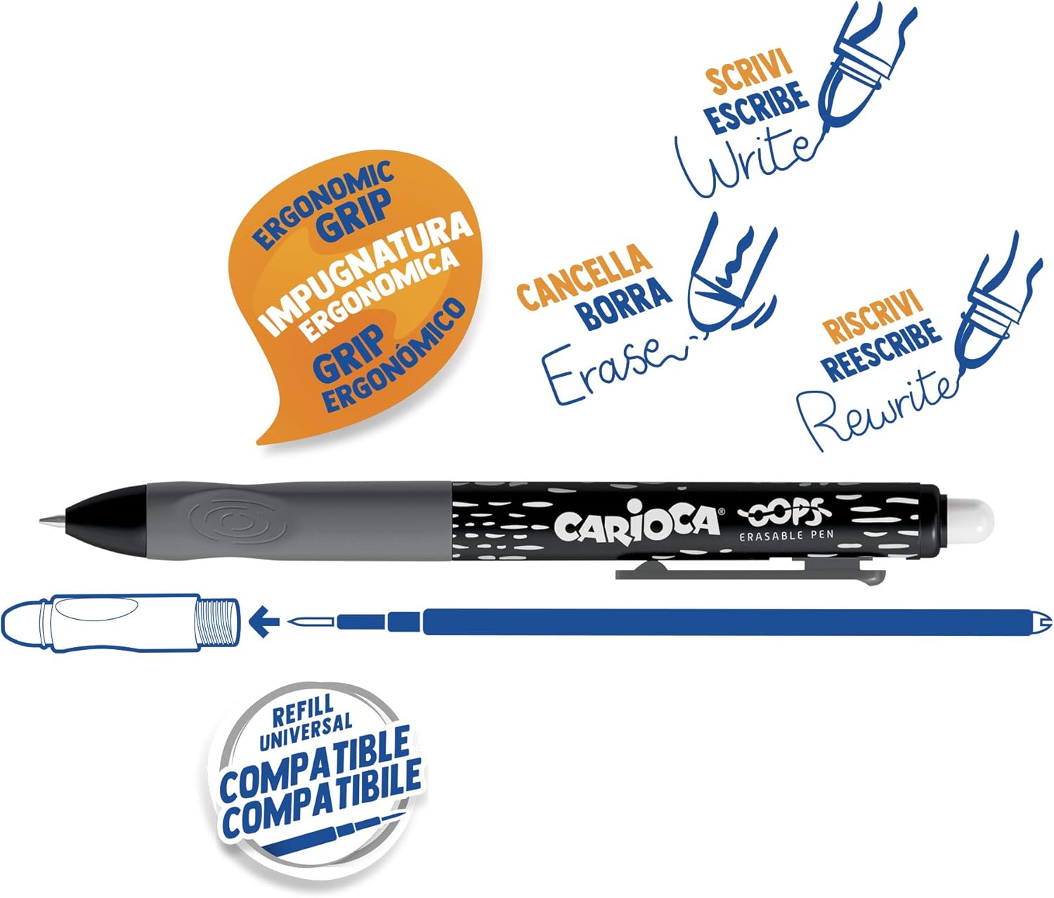 Prodotto: Confezione di 12 penne a scatto cancellabili con inchiostro termosensibile e gommino posto all'estremità del cappuccio. Penne con impugnatura ergonomica triangolare Funzionalità: Penna cancellabile con inchiostro termosensibile. Grazie alla gomma incorporata nella penna, puoi cancellare gli errori ripetutamente senza danneggiare, con un semplice sfregamento. Colore: Nero. Penna rettratile, si accende dalla clip Utilizzo: Adatto per scuola e ufficio. Non raccomandata per la scrittura di documenti legali Extra: Punta Ø 0,7 mm. Refill compatibili universali con le principali penne cancellabili. Disponibile in 3 diversi colori