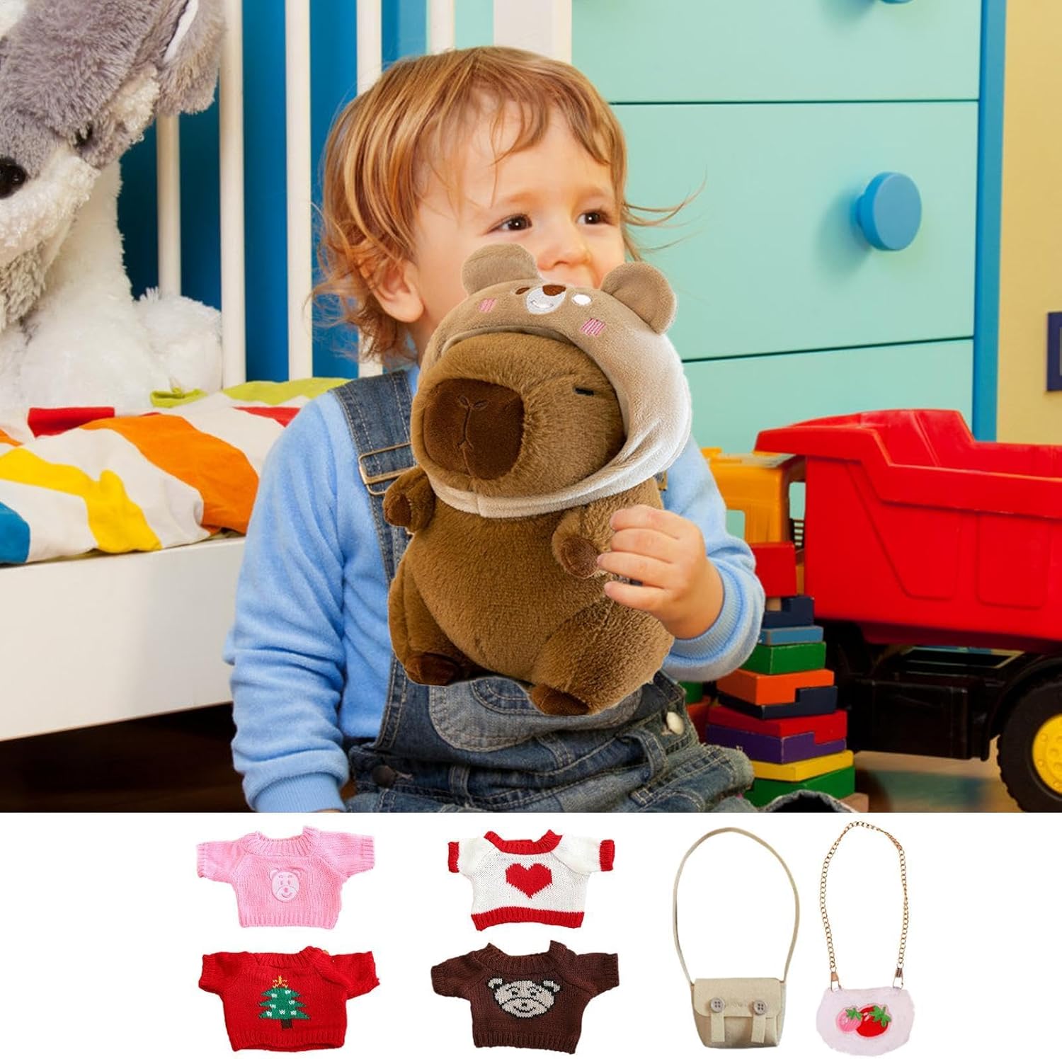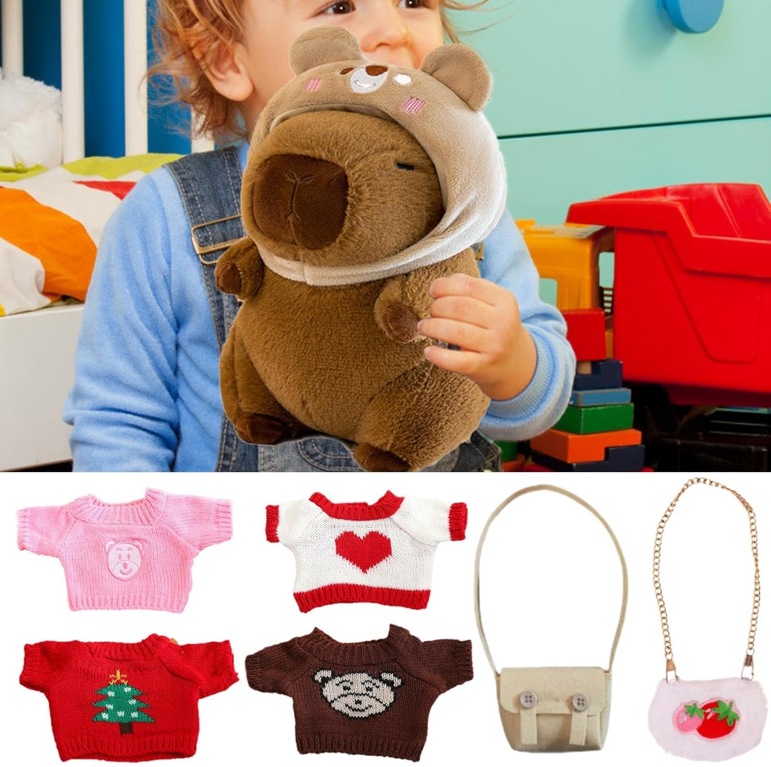 Divertimento senza fine: con molteplici combinazioni di stili, questo peluche Carpincho dotato di vestiti e accessori crea un giocattolo unico. Scatena la tua creatività e divertiti senza limiti Impulso allo sviluppo delle abilità: il nostro peluche capibara con vestiti è progettato per sfidare le abilità pratiche e di abbinamento del tuo bambino, promuovendo la crescita e incoraggiando lo sviluppo di abilità vitali attraverso un gioco coinvolgente. Uso sicuro: il nostro peluche capibara con vestiti non è solo realizzato in morbido peluche e materiali sicuri, ma offre anche una sensazione di sicurezza e comfort come il tuo nuovo amico tenero. Effetto decorativo: Con il suo design caratteristico e carino, il peluche Carpincho con vestiti affascinanti funge da pezzo di decorazione eccezionale, sollevando l'estetica di qualsiasi spazio. Uso multifunzionale: questo Capybara Plush fornisce un uso multifunzionale come un confortante compagno per dormire, portando più del semplice divertimento alla routine del sonno di qualsiasi bambino.