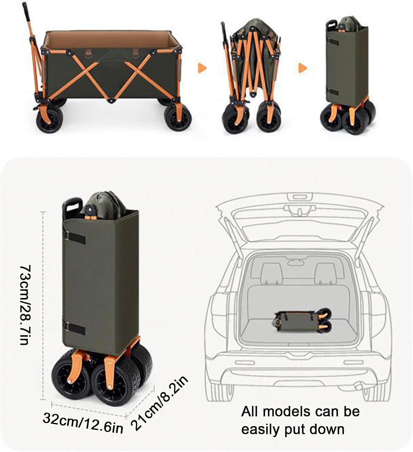 DESIGN PIEGHEVOLE RAPIDO: questo camper pieghevole è progettato per essere riposto e trasportato facilmente, consentendoti di piegarlo e aprirlo senza sforzo in pochi secondi, rendendolo ideale per avventure all'aria aperta e viaggi in campeggio. Ruote fuoristrada: dotato di ruote fuoristrada di alta qualità, questo camper può conquistare vari terreni tra cui sabbia, erba, ghiaia e altro ancora. Le quattro ruote sono anche rimovibili per un facile trasporto e stoccaggio. Telaio in acciaio per carichi pesanti: il telaio in acciaio per carichi pesanti di questo carrello offre una durata eccezionale e una capacità di carico massima di 220 libbre, rendendolo perfetto per il trasporto di attrezzatura da campeggio, generi alimentari o altri oggetti pesanti. Tessuto oxford spesso a doppio strato: l'area di carico dell'auto è realizzata in tessuto oxford 600D a doppio strato, che non solo è resistente agli strappi e all'abrasione, ma fornisce anche un'eccellente impermeabilità, mantenendo i tuoi effetti personali al sicuro e all'asciutto. MANIGLIA REGOLABILE: la maniglia del carrello da campeggio può essere facilmente regolata all'altezza desiderata, fornendo una presa comoda e consentendo manovre senza sforzo.
