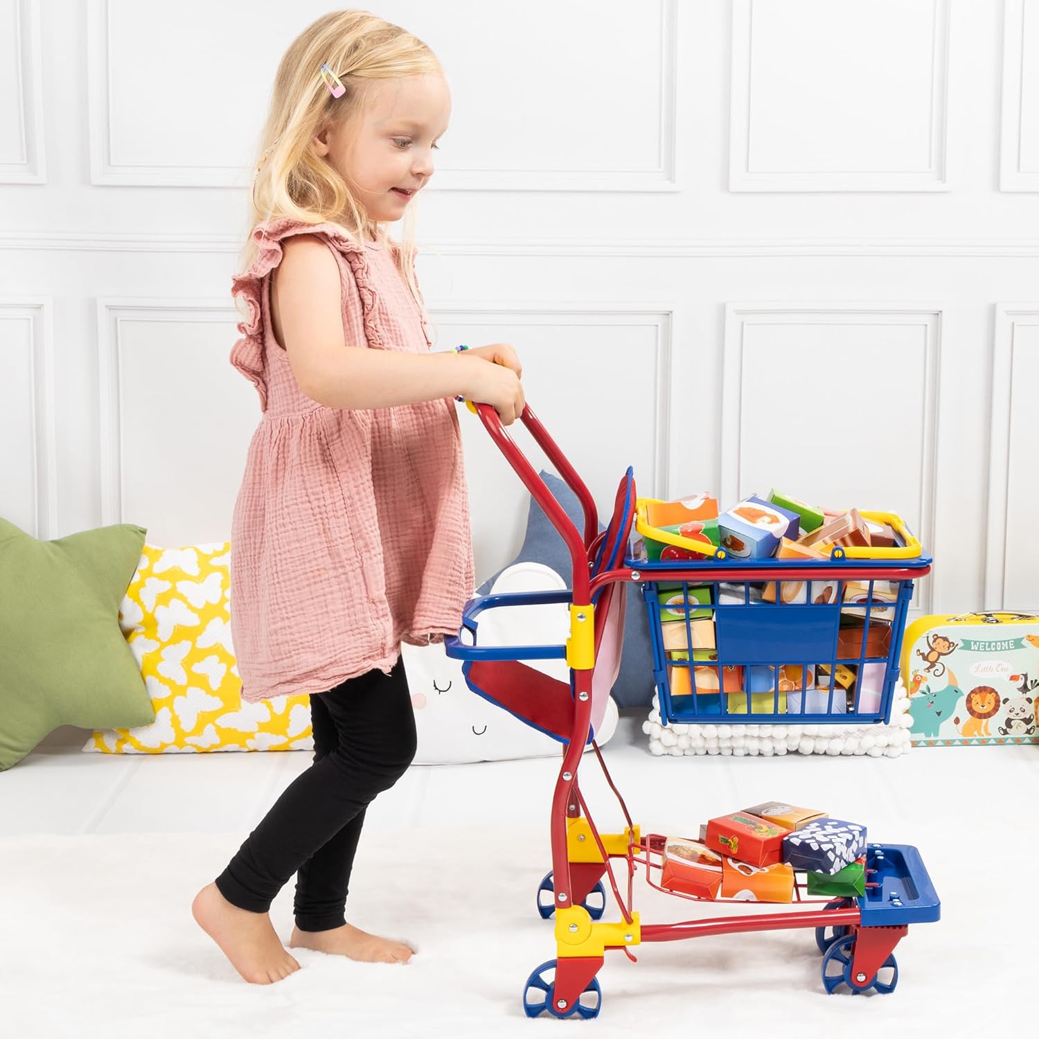 Carrello colorato del supermercato per bambini con contenuto Con un grande sedile per bambole adatto per portare con sé bambole fino a 50 cm Con un cestino rimovibile che può essere utilizzato separatamente Con tante scatole da gioco colorate come cacao, zucchero, succo d'arancia, ecc. Fantastici accessori da negozio per giochi di ruolo fantasiosi