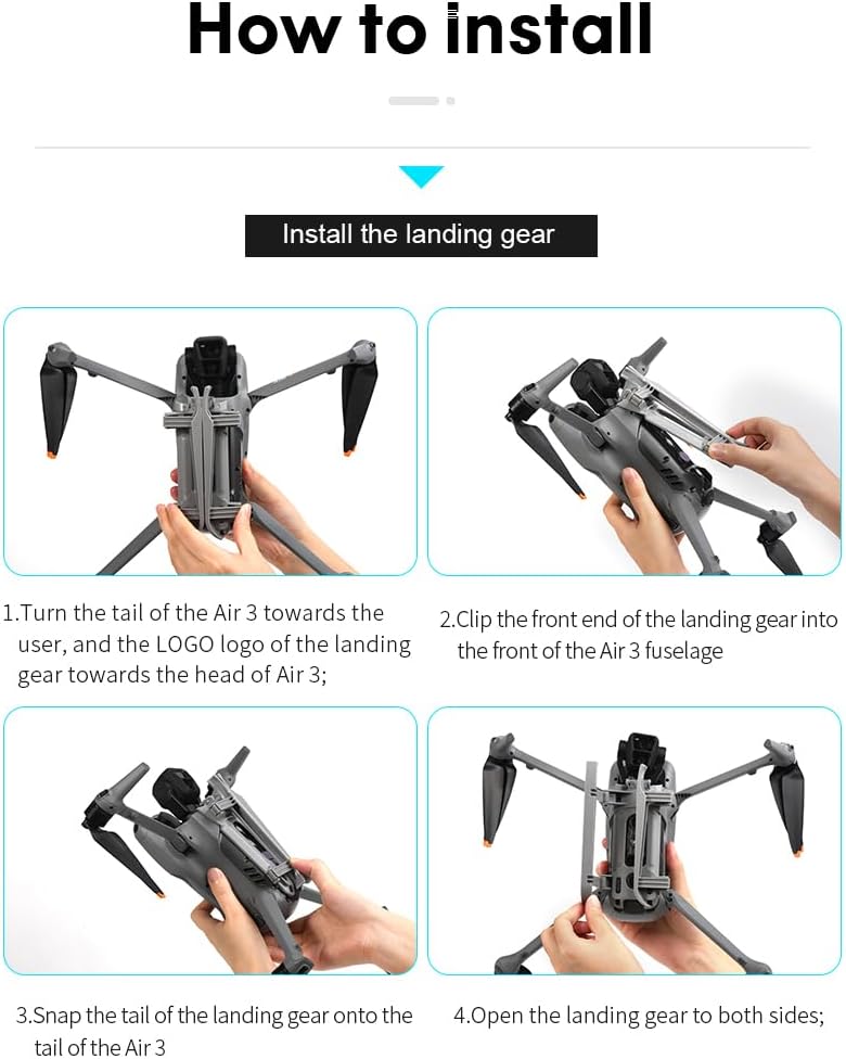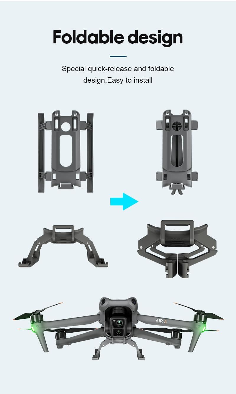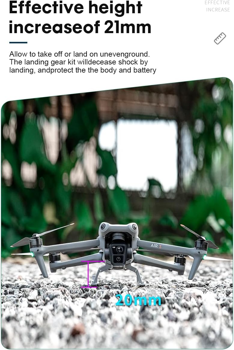 Compatibile con i droni Mavic Air 3S/Air 3 Peso netto: 37 g, materiale: ABS + PC, leggero e senza ulteriore carico sul drone, effettivamente aumentato di 20 mm, aumenta in modo creativo la distanza tra il drone e il terreno e mantiene il drone sicuro e pulito durante l'atterraggio e il decollo, sgancio rapido, design tutto in uno Carrello di atterraggio pieghevole, installazione sicura e ravvicinata, non blocca la luce e il sistema di visione del fondo del drone, molto sicuro e stabile for l'atterraggio e il decollo Contenuto della confezione: 1 set di carrello di atterraggio