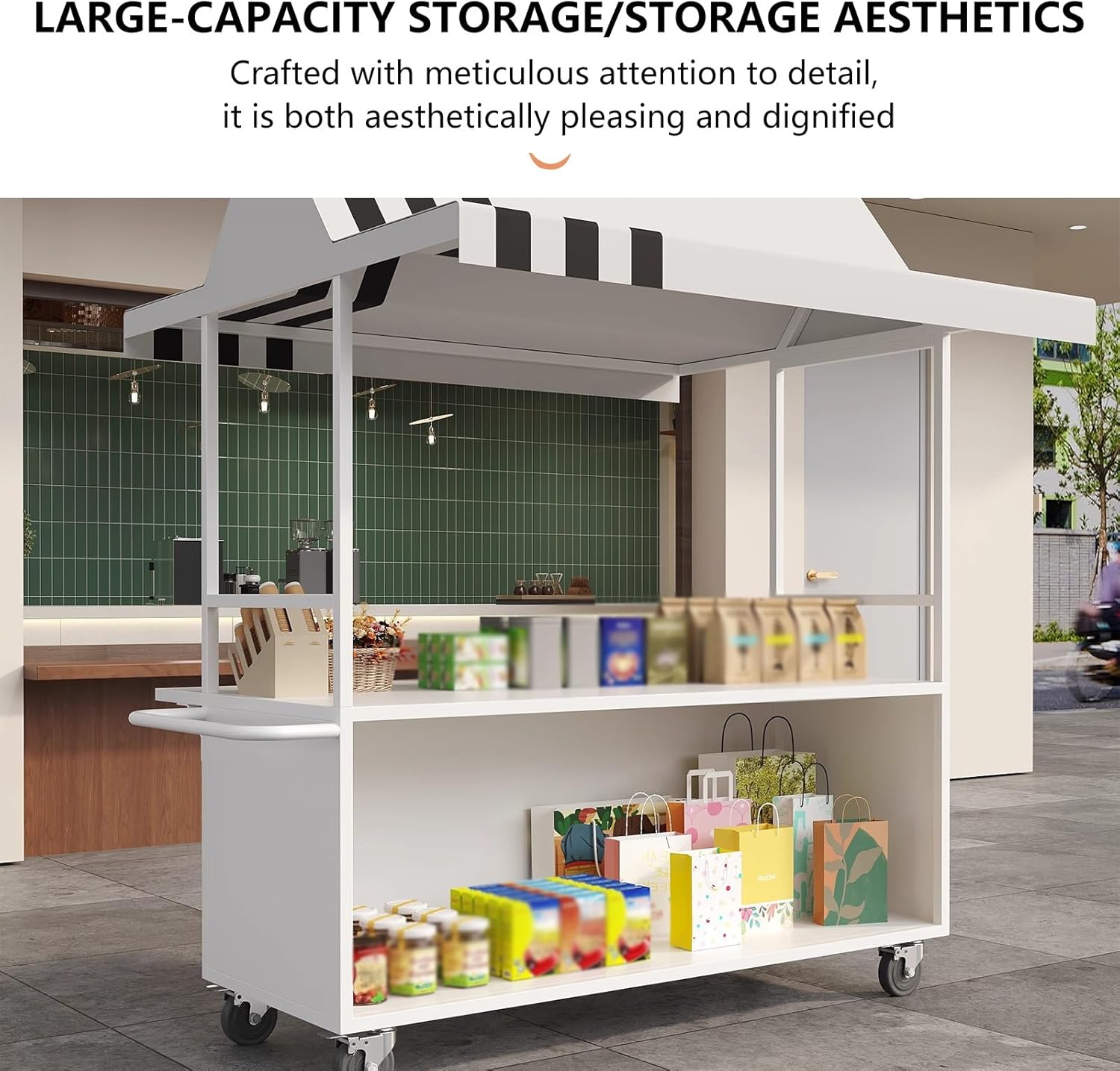 STRUTTURA IN FERRO SPESSORE: Realizzata in robusto ferro forgiato spesso. Elevata capacità di carico e resistenza alla deformazione, che consente di esporre con sicurezza oggetti pesanti come scatole di snack, scatole di bevande o carrelli mobili for hot dog TETTUCCIO PROTETTIVO: Il tettuccio protegge il prodotto da luce solare, vento e pioggia leggera. Garantisce che la merce sia in buone condizioni e venga venduta senza problemi anche in condizioni meteorologiche in continuo cambiamento, senza interruzioni dovute a fattori atmosferici AREA ESPOSITIVA SPAZIOSA E ORDINATA: questo espositore portatile for alimenti offre ampio spazio al mercato for esporre in modo chiaro e sicuro vari articoli, aiutandoti a mantenere l'ordine e aumentando la consapevolezza del prodotto FACILE DA SPOSTARE: Questo carrello della spesa da esterno è dotato di quattro ruote girevoli a 360° che possono essere facilmente spostate su diverse superfici. Due ruote bloccabili sono saldamente fissate in posizione quando necessario ADATTO A QUALSIASI OCCASIONE: Adatto a mercati al coperto e all'aperto, mercatini di strada, espositori promozionali ed eventi scolastici. Che tu venda snack, bevande, prodotti da forno o prodotti al dettaglio, è un'ottima soluzione for venditori ambulanti e organizzatori di eventi
