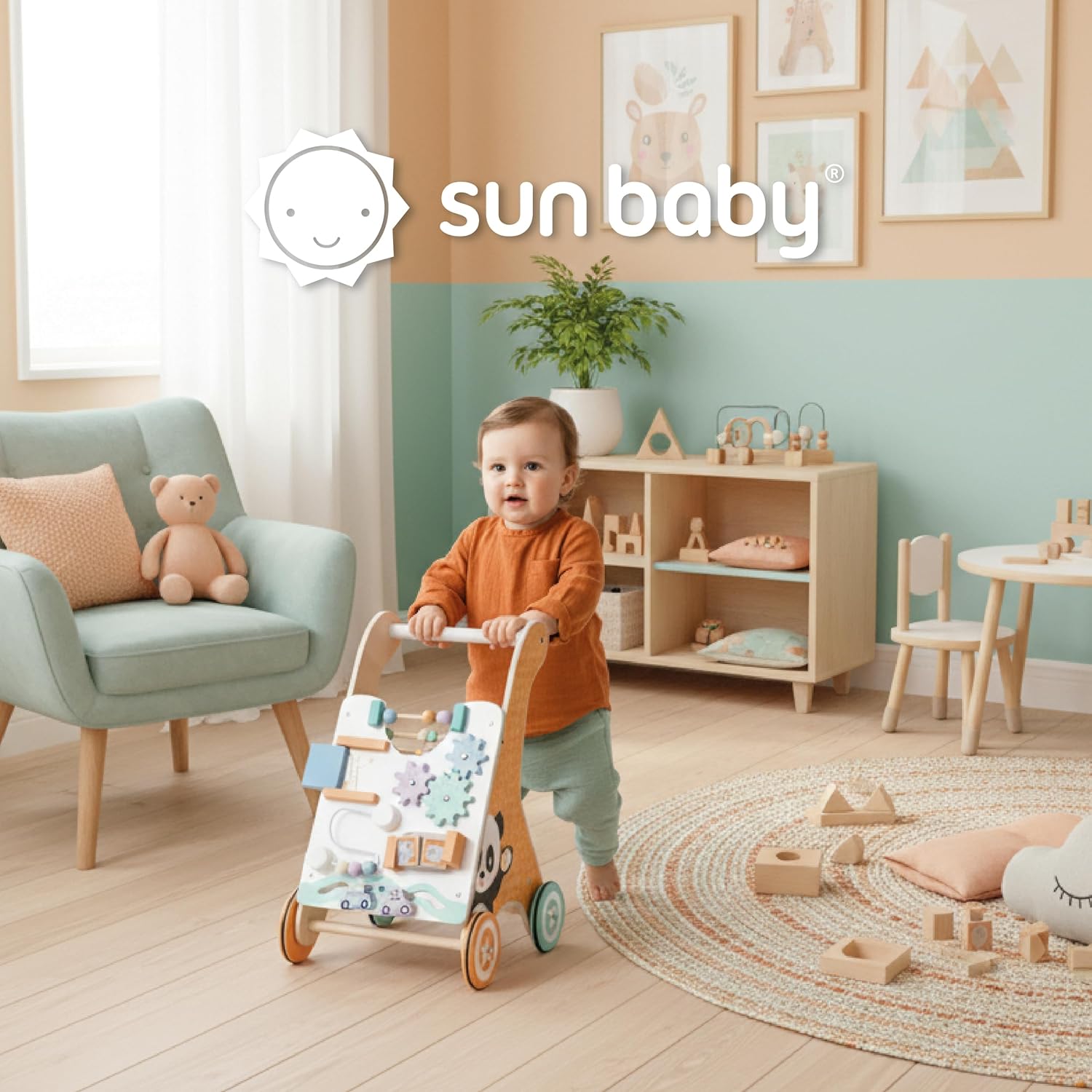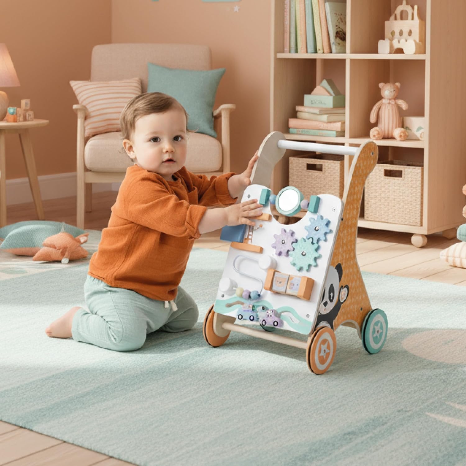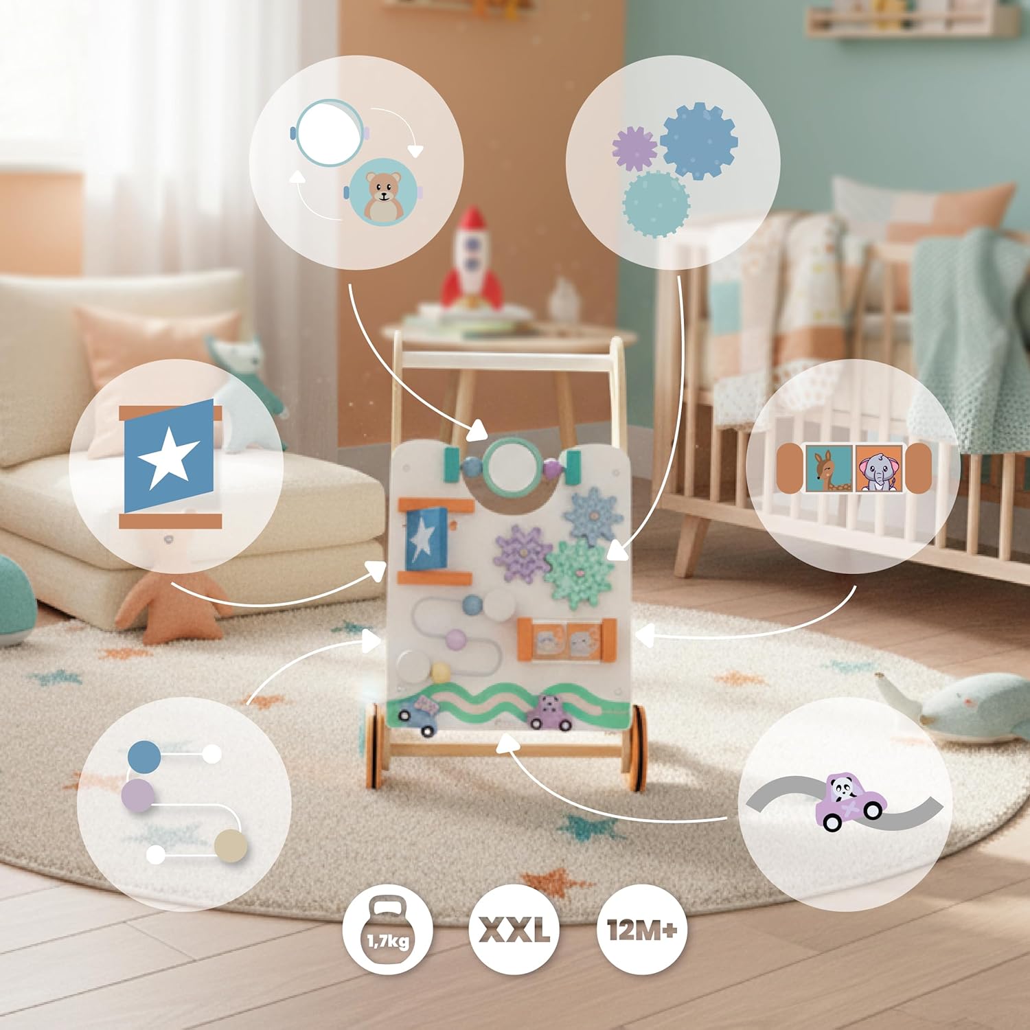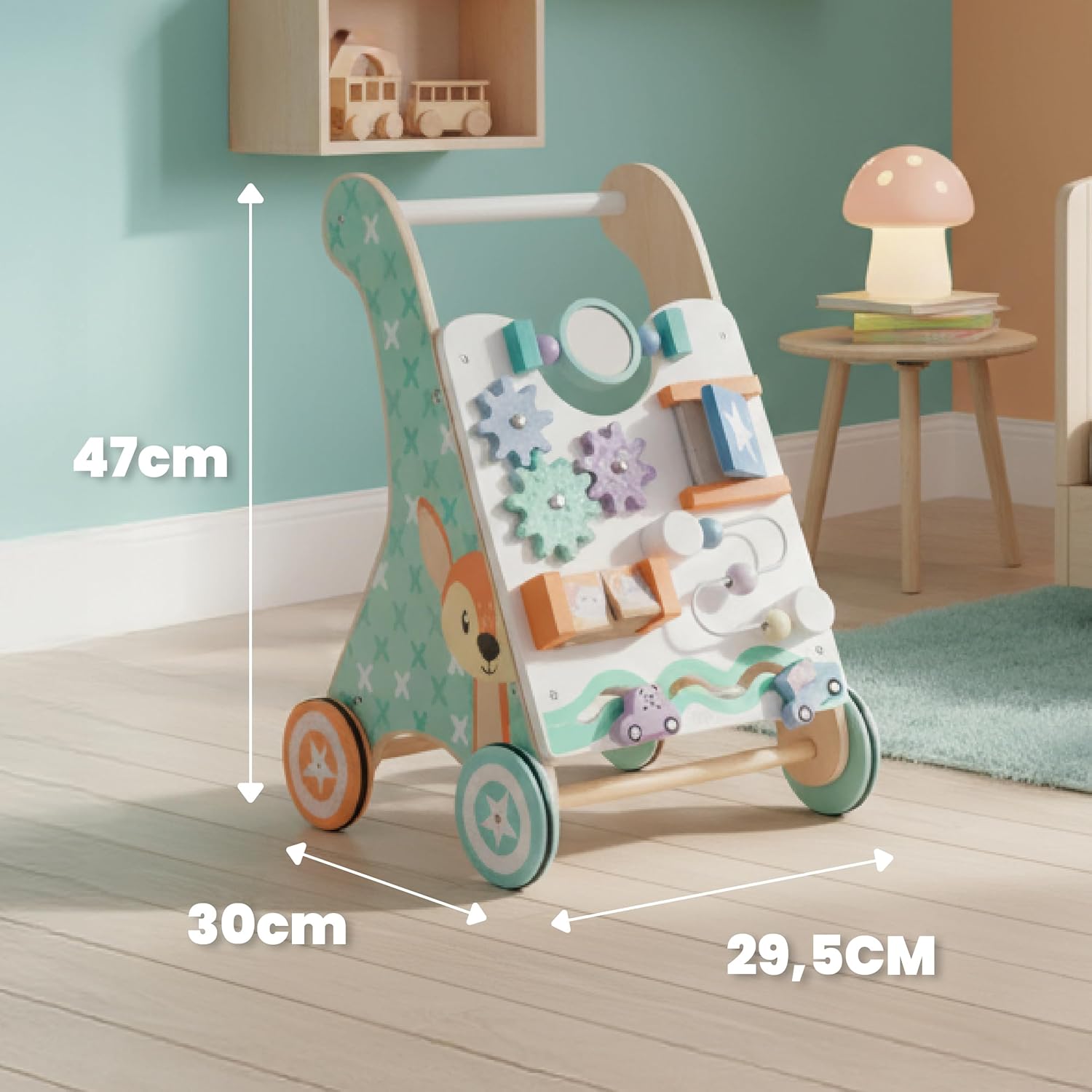 Le rotelle gommate impediscono di scivolare o graffiare il pavimento. La lavagna interattiva incoraggia i bambini a giocare e sviluppa la loro immaginazione. Verniciata con colori atossici. Struttura leggera e stabile, ideale per i bambini più piccoli. Facile da trasportare. Sviluppare la coordinazione motoria e imparare a camminare è divertente! I colori pastello e il calore del legno naturale si adattano alla stanza di ogni bambino.