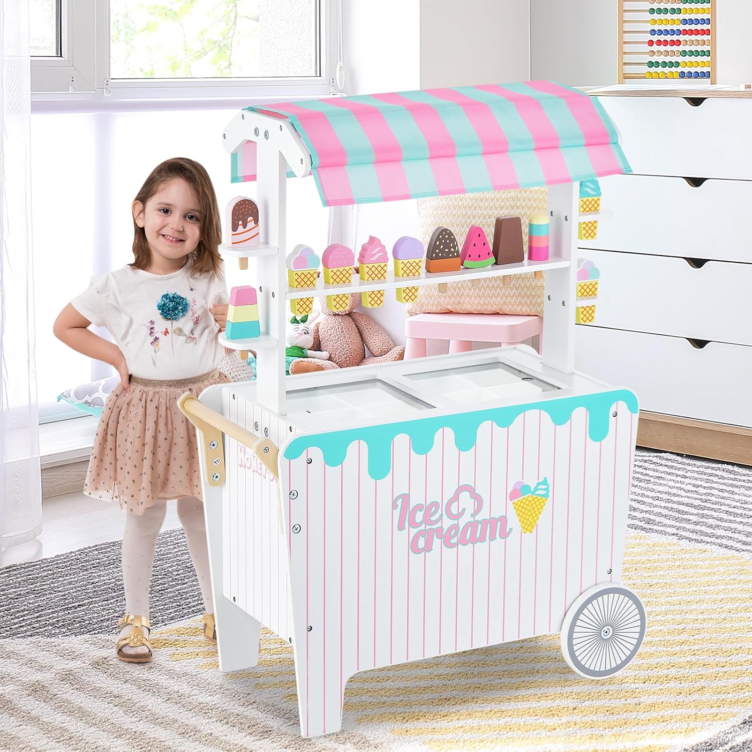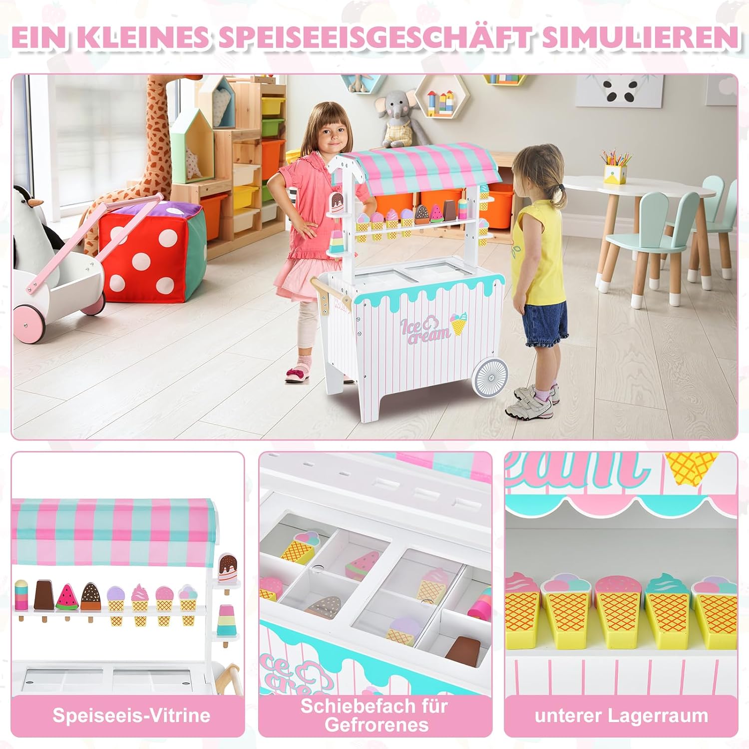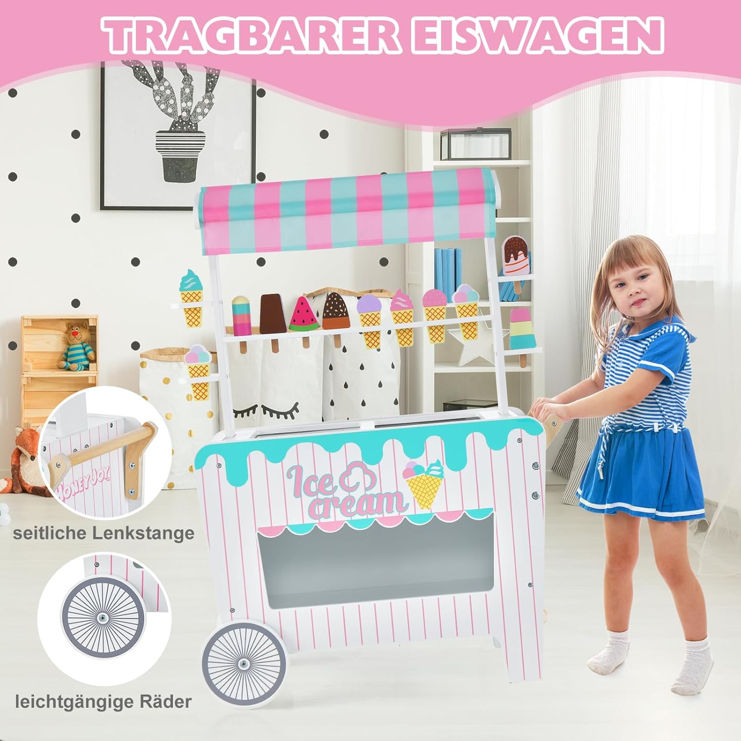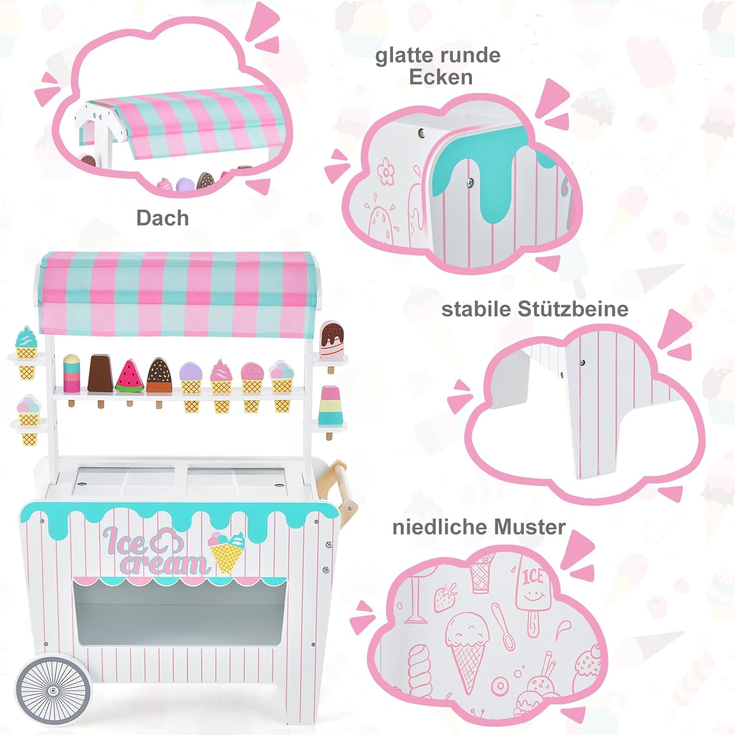 Come un vero venditore di gelati: questo colorato giocattolo in legno ha tutto il necessario per simulare un camioncino dei gelati. Comprende 12 ripiani espositivi per gelato, 12 gelati colorati, ripiano per surgelati con ante scorrevoli, tettoia a strisce e vano portaoggetti inferiore. Carrello del gelato facile da spostare: grazie alle ruote lisce sul fondo, alle gambe robuste e alle comode maniglie, questo carrello della spesa per bambini è leggero e portatile, facile da spostare da una stanza all'altra o dall'interno all'esterno e si attacca ovunque. Materiale selezionato: il nostro carrello di vendita è realizzato in MDF di alta qualità, molto stabile e durevole. La superficie impiallacciata è liscia e priva di bave, facile da pulire. Inoltre, la tettoia è realizzata in poliestere resistente alle intemperie, impermeabile e resistente ai raggi UV, perfetta per l'uso esterno. Buono per lo sviluppo dei bambini: questo negozio colorato porta un divertimento senza fine ai bambini! Promuove l'immaginazione creativa, lo sviluppo sociale e linguistico, il riconoscimento dei colori e la cooperazione tra mani e occhi durante il gioco. REGALO PERFETTO: Con questo carrello portavivande in legno, tuo figlio potrà vivere una vera esperienza di vendita. I bambini possono giocare con i loro amici e far finta di essere il cliente o il proprietario. È perfetto per Natale, compleanni o regali per la festa dei bambini per ragazzi e ragazze di età superiore ai 3 anni.