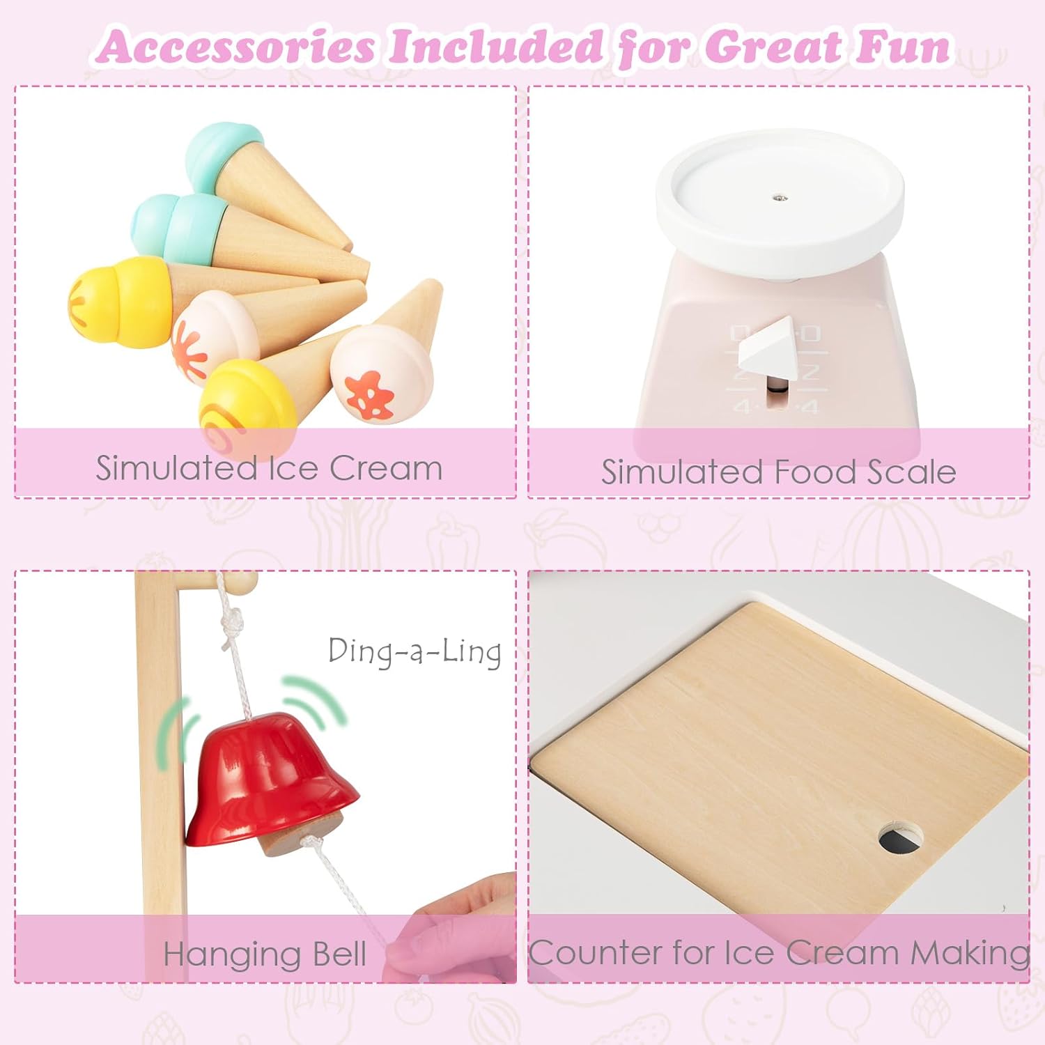 🍦~Realizza i sogni imprenditoriali dei bambini~ Con questo colorato camioncino dei gelati in legno, i bambini possono simulare realisticamente il funzionamento di una gelateria. Dotato di 6 giocattoli per il gelato, bilance e campanelli, i bambini possono interpretare il ruolo del piccolo proprietario di un negozio e spingere il camioncino dei gelati ovunque per sperimentare il divertimento imprenditoriale e promuovere la creatività. 🍦~Design sicuro e affidabile~ Il negozio di alimentari è realizzato in MDF e legno di pino di alta qualità per garantire durata e stabilità. Il design con angoli arrotondati protegge i bambini dagli infortuni e offre tranquillità ai genitori. Offri ai bambini un posto sicuro dove giocare e goditi il divertimento del gioco di ruolo. 🍦~Set di giocattoli multifunzionali per bambini~ Il negozio per bambini non solo può simulare una gelateria, ma può anche essere utilizzato come bancarella del mercato alimentare. Dotato di numerosi scaffali aperti, i bambini possono esporre giocattoli di cibo e verdure. Inoltre, la lavagna in legno può essere utilizzata per annotare i menu, rendendo il gioco ancora più realistico e divertente. 🍦~Sviluppo di abilità sociali~ Un carrello della spesa per bambini può allenare la coordinazione occhio-mano. I bambini possono giocare con gli amici o la famiglia, apprendere abilità sociali attraverso giochi di ruolo e migliorare la comunicazione e il lavoro di squadra. 🍦~Un'opzione regalo significativa~ Il set da gioco della casa delle bambole è un regalo caloroso e significativo. Il bellissimo design esterno e i giocattoli abbinati lo fanno amare dai bambini. Adatto dai 3 anni in su, può essere collocato nella cameretta dei bambini, nella sala giochi o nel soggiorno, rendendolo un regalo ideale per vacanze, compleanni o celebrazioni.