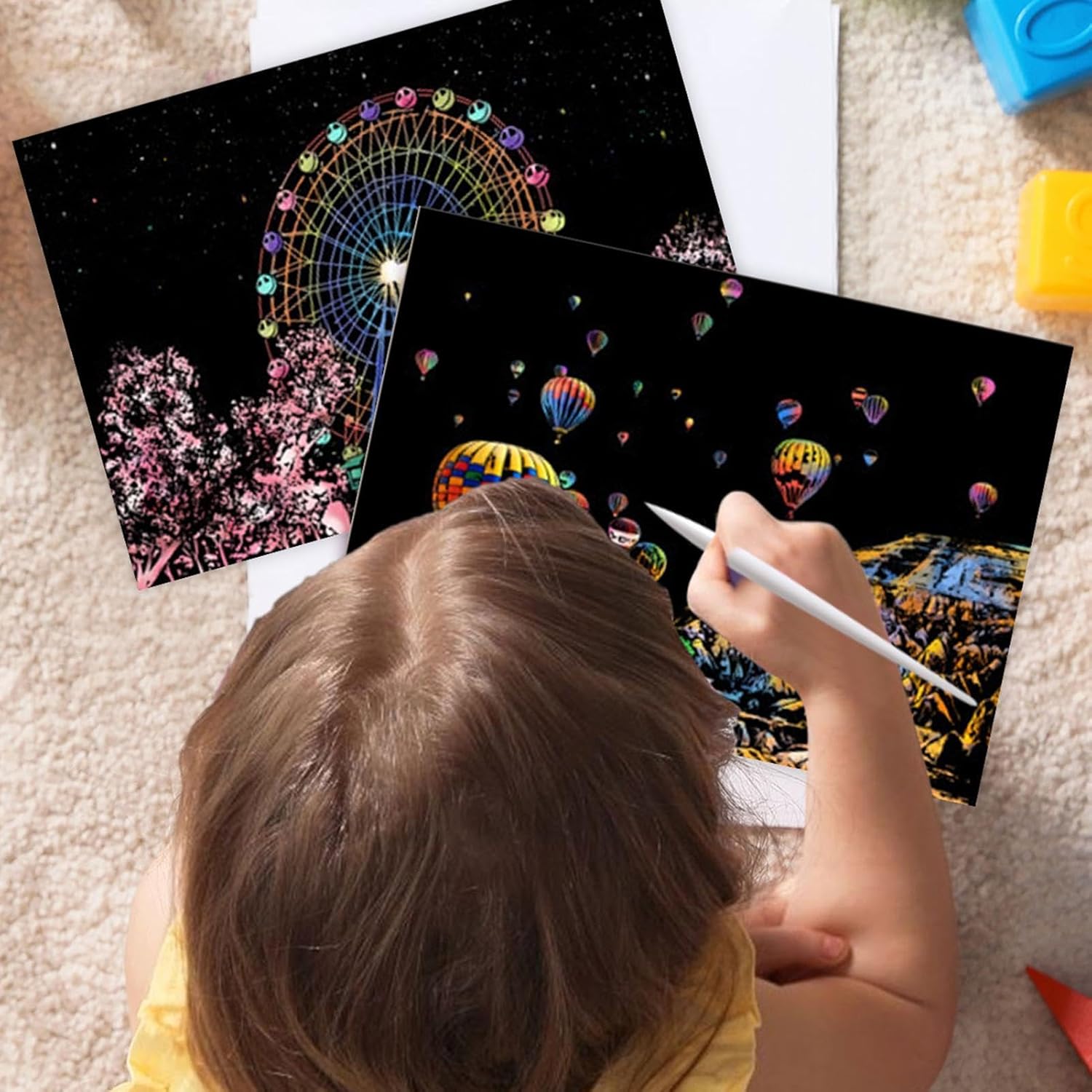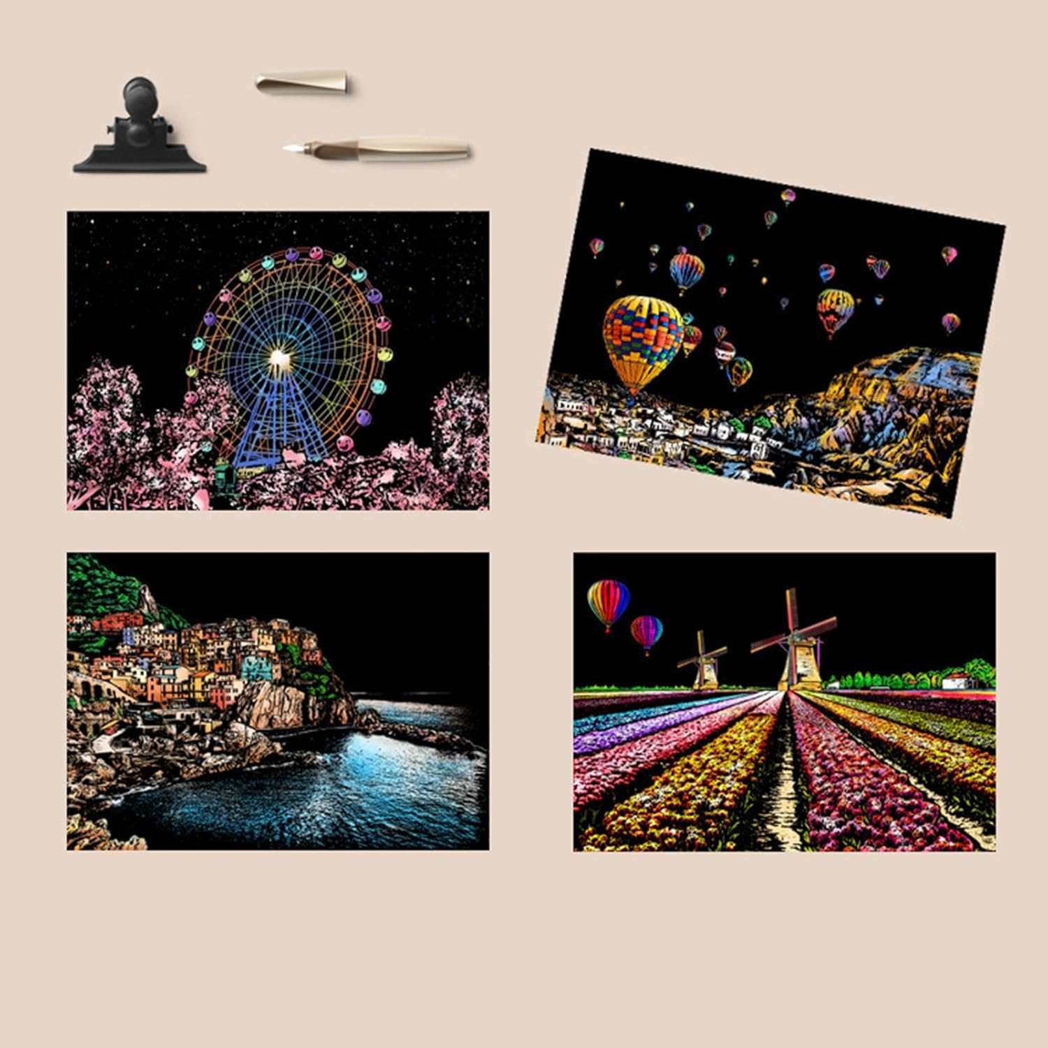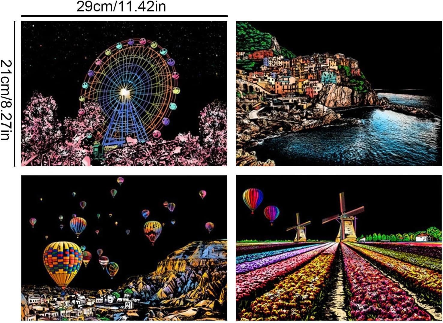 Design accattivante: con 4 fogli di carta da grattare in formato A4 per set e la visualizzazione di splendide scene notturne in città, questo set risveglia la curiosità creativa e migliora le capacità artistiche Facile da usare: con la sua finitura opaca che nasconde sia colori brillanti che motivi intricati, questo set di graffi offre un'entusiasmante possibilità artistica. Usa la penna per rendere visibile il design invisibile e goditi la soddisfazione tattile di scolpire con le tue mani Divertimento: inizia la tua creatività con il nostro kit di pittura post-gratta, perfetto per bambini e adulti. Goditi l'edutainment e il divertimento partecipando a questa divertente attività artigianale che promuove lo sviluppo artistico Facile da trasportare: Libera la tua creatività con questo kit di pittura e gratta in formato A4. Ideale per i viaggi o il tempo libero quotidiano, sia i bambini che gli adulti possono godere facilmente della bellezza accattivante dell'arte dei graffi e divertirsi senza sforzo Decorazione della stanza: trasforma qualsiasi stanza in un'opera d'arte con il nostro kit di pittura dopo la gratta. I lavori finiti non solo sono divertenti da progettare, ma aggiungono anche un tocco artistico unico al tuo arredamento